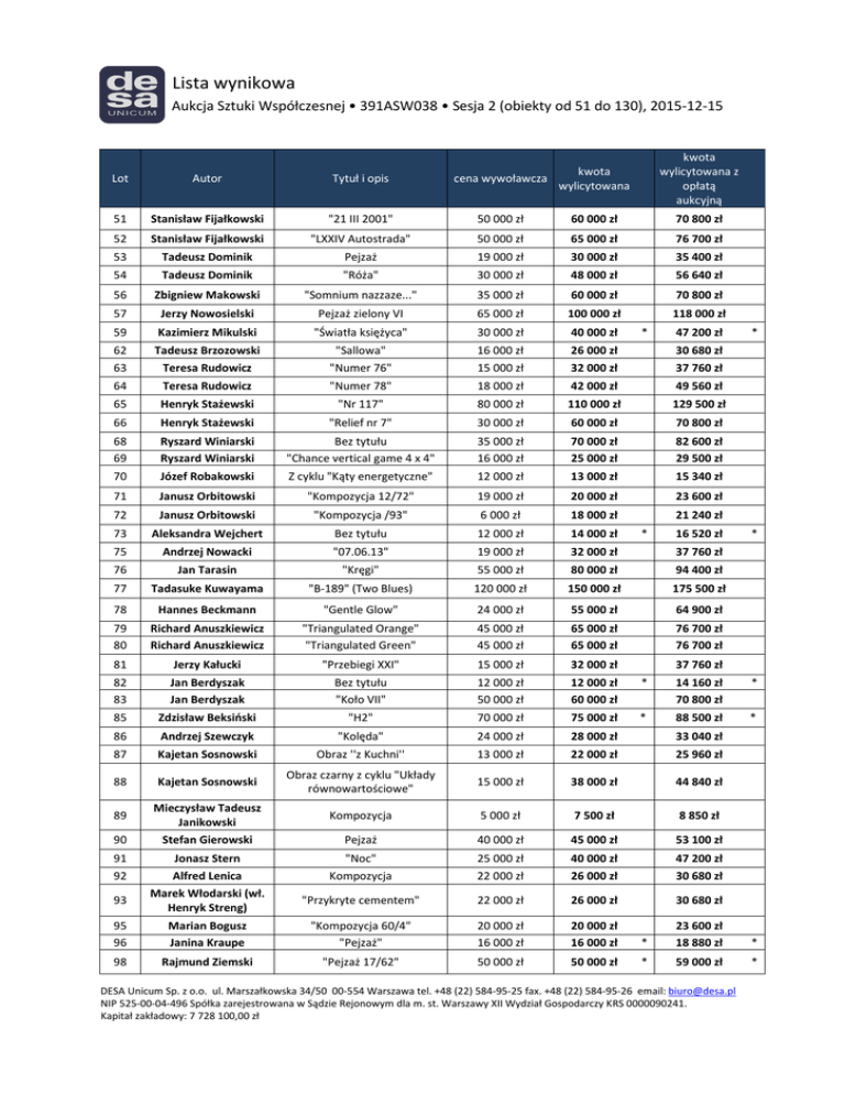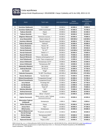 Lista wynikowa Aukcja Sztuki Współczesnej • 391ASW038 • Sesja 2 (obiekty od 51 do 130), 2015-12-15 kwota wylicytowana z opłatą aukcyjną kwota cena wywoławcza wylicytowana Lot Autor Tytuł i opis 51 Stanisław Fijałkowski "21 III 2001" 50 000 zł 60 000 zł 70 800 zł 52 Stanisław Fijałkowski "LXXIV Autostrada" 50 000 zł 65 000 zł 76 700 zł 53 Tadeusz Dominik Pejzaż 19 000 zł 30 000 zł 35 400 zł 54 Tadeusz Dominik "Róża" 30 000 zł 48 000 zł 56 640 zł 56 Zbigniew Makowski "Somnium nazzaze..." 35 000 zł 60 000 zł 70 800 zł 57 Jerzy Nowosielski Pejzaż zielony VI 65 000 zł 100 000 zł 59 Kazimierz Mikulski "Światła księżyca" 30 000 zł 40 000 zł 62 63 Tadeusz Brzozowski Teresa Rudowicz "Sallowa" "Numer 76" 16 000 zł 15 000 zł 26 000 zł 32 000 zł 64 Teresa Rudowicz "Numer 78" 18 000 zł 42 000 zł 49 560 zł 65 Henryk Stażewski "Nr 117" 80 000 zł 110 000 zł 129 500 zł 66 Henryk Stażewski "Relief nr 7" 30 000 zł 60 000 zł 70 800 zł 68 69 Ryszard Winiarski Ryszard Winiarski Bez tytułu "Chance vertical game 4 x 4" 35 000 zł 16 000 zł 70 000 zł 25 000 zł 82 600 zł 29 500 zł 70 Józef Robakowski Z cyklu "Kąty energetyczne" 12 000 zł 13 000 zł 15 340 zł 71 Janusz Orbitowski "Kompozycja 12/72" 19 000 zł 20 000 zł 23 600 zł 72 Janusz Orbitowski "Kompozycja /93" 6 000 zł 18 000 zł 21 240 zł 73 Aleksandra Wejchert Bez tytułu 12 000 zł 14 000 zł 75 Andrzej Nowacki "07.06.13" 19 000 zł 32 000 zł 37 760 zł 76 Jan Tarasin "Kręgi" 55 000 zł 80 000 zł 94 400 zł 77 Tadasuke Kuwayama "B-189" (Two Blues) 120 000 zł 150 000 zł 175 500 zł 118 000 zł * 47 200 zł * 30 680 zł 37 760 zł * 16 520 zł * 78 Hannes Beckmann "Gentle Glow" 24 000 zł 55 000 zł 64 900 zł 79 80 Richard Anuszkiewicz Richard Anuszkiewicz "Triangulated Orange" "Triangulated Green" 45 000 zł 45 000 zł 65 000 zł 65 000 zł 76 700 zł 76 700 zł 81 Jerzy Kałucki "Przebiegi XXI" 15 000 zł 32 000 zł 37 760 zł 82 83 Jan Berdyszak Jan Berdyszak Bez tytułu "Koło VII" 12 000 zł 50 000 zł 12 000 zł 60 000 zł * 14 160 zł 70 800 zł * 85 Zdzisław Beksiński "H2" 70 000 zł 75 000 zł * 88 500 zł * 86 Andrzej Szewczyk "Kolęda" 24 000 zł 28 000 zł 33 040 zł 87 Kajetan Sosnowski Obraz ''z Kuchni'' 13 000 zł 22 000 zł 25 960 zł 88 Kajetan Sosnowski Obraz czarny z cyklu "Układy równowartościowe" 15 000 zł 38 000 zł 44 840 zł 89 Mieczysław Tadeusz Janikowski Stefan Gierowski Kompozycja 5 000 zł 7 500 zł 8 850 zł Pejzaż 40 000 zł 45 000 zł 53 100 zł 90 91 Jonasz Stern "Noc" 25 000 zł 40 000 zł 47 200 zł 92 Alfred Lenica Marek Włodarski (wł. Henryk Streng) Kompozycja 22 000 zł 26 000 zł 30 680 zł "Przykryte cementem" 22 000 zł 26 000 zł 30 680 zł * * 93 95 96 Marian Bogusz Janina Kraupe "Kompozycja 60/4" "Pejzaż" 20 000 zł 16 000 zł 20 000 zł 16 000 zł * 23 600 zł 18 880 zł 98 Rajmund Ziemski "Pejzaż 17/62" 50 000 zł 50 000 zł * 59 000 zł DESA Unicum Sp. z o.o. ul. Marszałkowska 34/50 00-554 Warszawa tel. +48 (22) 584-95-25 fax. +48 (22) 584-95-26 email: [email protected] NIP 525-00-04-496 Spółka zarejestrowana w Sądzie Rejonowym dla m. st. Warszawy XII Wydział Gospodarczy KRS 0000090241. Kapitał zakładowy: 7 728 100,00 zł Lista wynikowa Aukcja Sztuki Współczesnej • 391ASW038 • Sesja 2 (obiekty od 51 do 130), 2015-12-15 99 Rajmund Ziemski "Pejzaż 20/76" 16 000 zł 16 000 zł 100 Andrzej S. Kowalski "Obraz brunatny II" 22 000 zł 24 000 zł * 28 320 zł 102 Danuta Urbanowicz "Pożegnanie kawalerzysty" 4 500 zł 4 500 zł 5 310 zł 103 Henryk Musiałowicz Z cyklu "Reminescencje" 5 000 zł 5 000 zł 104 Władysław Hasior "Ostatni toast - II" 9 000 zł 11 000 zł 12 980 zł 106 Zbigniew Tymoszewski Kompozycja 18 000 zł 35 000 zł 41 300 zł 108 Jacek Sienicki Fikus 20 000 zł 22 000 zł 25 960 zł 109 Leon Tarasewicz Bez tytułu 50 000 zł 60 000 zł 70 800 zł 110 111 Leon Tarasewicz Jarosław Modzelewski Bez tytułu "Czarna droga" 35 000 zł 30 000 zł 48 000 zł 30 000 zł 114 Włodzimierz Pawlak "Dziennik nr 19" 45 000 zł 60 000 zł 70 800 zł 115 Edward Dwurnik 19 000 zł 38 000 zł 44 840 zł * * 18 880 zł 5 900 zł 56 640 zł 35 400 zł 118 Leszek Sobocki "Renowacja czarnej głowy" z cyklu "Gipsowy plener" Martwa natura ze stolikiem 6 000 zł 6 000 zł 119 Władysław Jackiewicz "Obraz XI" 18 000 zł 18 000 zł 121 Jerzy Stajuda Bez tytułu 18 000 zł 20 000 zł 122 Eugeniusz Markowski "Parka 3" 12 000 zł 22 000 zł 25 960 zł 123 Jerzy Panek Postać, z serii "Potępiony" 15 000 zł 15 000 zł 17 700 zł 124 Jan Dobkowski "Emocje i uczucia" 16 000 zł 32 000 zł 37 760 zł 125 Jan Dobkowski "Australijski sen II" 20 000 zł 26 000 zł 30 680 zł 128 Kiejstut Bereźnicki "Przeistoczenie" 18 000 zł 19 000 zł 22 420 zł 130 Natalia Lach-Lachowicz "Homage Luciano Fontana" 5 500 zł 6 000 zł 7 080 zł 2 295 000 zł 2 706 300 zł * 7 080 zł * * * * 21 240 zł * 23 600 zł DESA Unicum Sp. z o.o. ul. Marszałkowska 34/50 00-554 Warszawa tel. +48 (22) 584-95-25 fax. +48 (22) 584-95-26 email: [email protected] NIP 525-00-04-496 Spółka zarejestrowana w Sądzie Rejonowym dla m. st. Warszawy XII Wydział Gospodarczy KRS 0000090241. Kapitał zakładowy: 7 728 100,00 zł *