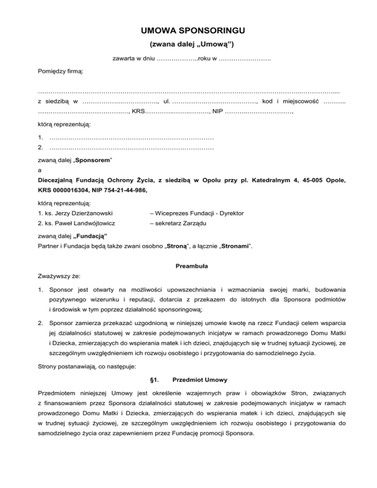 UMOWA SPONSORINGU (zwana dalej „Umową”) zawarta w dniu ………………..roku w ……………………. Pomiędzy firmą: ……………………………………………………………………………………………………………..…………….... z siedzibą w ……………….…………….., ul. …………….……………………, kod i miejscowość ……….. ………………………………….…, KRS…………..……..………, NIP ………..…………………, którą reprezentują: 1. …………………………………………………………………… 2. …………………………………………………………………… zwaną dalej „Sponsorem” a Diecezjalną Fundacją Ochrony Życia, z siedzibą w Opolu przy pl. Katedralnym 4, 45-005 Opole, KRS 0000016304, NIP 754-21-44-986, którą reprezentują: 1. ks. Jerzy Dzierżanowski – Wiceprezes Fundacji - Dyrektor 2. ks. Paweł Landwójtowicz – sekretarz Zarządu zwaną dalej „Fundacją” Partner i Fundacja będą także zwani osobno „Stroną”, a łącznie „Stronami”. Preambuła Zważywszy że: 1. Sponsor jest otwarty na możliwości upowszechniania i wzmacniania swojej marki, budowania pozytywnego wizerunku i reputacji, dotarcia z przekazem do istotnych dla Sponsora podmiotów i środowisk w tym poprzez działalność sponsoringową; 2. Sponsor zamierza przekazać uzgodnioną w niniejszej umowie kwotę na rzecz Fundacji celem wsparcia jej działalności statutowej w zakresie podejmowanych inicjatyw w ramach prowadzonego Domu Matki i Dziecka, zmierzających do wspierania matek i ich dzieci, znajdujących się w trudnej sytuacji życiowej, ze szczególnym uwzględnieniem ich rozwoju osobistego i przygotowania do samodzielnego życia. Strony postanawiają, co następuje: §1. Przedmiot Umowy Przedmiotem niniejszej Umowy jest określenie wzajemnych praw i obowiązków Stron, związanych z finansowaniem przez Sponsora działalności statutowej w zakresie podejmowanych inicjatyw w ramach prowadzonego Domu Matki i Dziecka, zmierzających do wspierania matek i ich dzieci, znajdujących się w trudnej sytuacji życiowej, ze szczególnym uwzględnieniem ich rozwoju osobistego i przygotowania do samodzielnego życia oraz zapewnieniem przez Fundację promocji Sponsora. §2. Zobowiązania Fundacji W okresie obowiązywania Umowy Fundacja zobowiązuje się do: 1. zrealizowania działań promocyjnych na rzecz Sponsora, w tym w szczególności: 1.1.1. promocji Sponsora poprzez informowanie mediów o podjętej współpracy, 1.1.2. nadanie Sponsorowi tytułu „Sponsora” i wykorzystywania tego tytułu w działaniach promocyjnych, 1.1.3. umieszczenie logo Sponsora na stronie www.dfoz.pl z linkiem do strony Sponsora, 2. przygotowania i przedstawienia Sponsorowi, nie później niż 14 po zakończeniu okresu obowiązywania Umowy, pisemnego raportu z wykonania Umowy §3. Uprawnienia Sponsora W okresie obowiązywania Umowy Sponsor uzyskuje prawo do wykorzystania wizerunku Fundacji w związku z prowadzonymi przez siebie działaniami sponsorskimi. §4. Zobowiązania Sponsora 1. Sponsor zobowiązuje się w ramach wykonania świadczenia wzajemnego z niniejszej Umowy do przekazania na rzecz Fundacji kwoty .......................................................................…………. PLN, (słownie ……………………………………………………………………………………………………………..…… złotych), z przeznaczeniem na sfinansowanie działalności statutowej Fundacji w zakresie opisanym w §1 umowy; 2. Płatność nastąpi przelewem na rachunek BZ WBK S.A. I O/Opole numer konta 67 1090 2138 0000 0005 5600 0551 w terminie ……………..………. dni od daty podpisania umowy; §5. Rozwiązanie i odstąpienie od Umowy 1. Strony zastrzegają sobie prawo natychmiastowego rozwiązania Umowy bez wypowiedzenia w przypadku zaistnienia naruszenia prawa w działalności regulowanej niniejszą Umową oraz korupcji. 2. Żadna ze Stron nie ponosi odpowiedzialności za niewykonanie lub nienależyte wykonanie obowiązków wynikających z niniejszej umowy w takim zakresie, w jakim było to spowodowane okolicznościami mającymi znamiona siły wyższej. §6. Postanowienia końcowe 1. Niniejsza Umowa została zawarta na okres ………………………..… miesięcy od daty podpisania Umowy. 2. Ewentualne spory wynikłe w trakcie realizacji Umowy rozstrzygane będą na drodze polubownej. W przypadku braku porozumienia, spór rozstrzygnie sąd powszechny właściwy dla siedziby Fundacji 3. W sprawach nienormowanych niniejszą umową, zastosowanie mają przepisy Kodeksu Cywilnego 4. Umowa została sporządzona w dwóch jednobrzmiących egzemplarzach, po jednym dla każdej ze Stron. 5. Zmiany Umowy wymagają formy pisemnej pod rygorem nieważności. ……………………………… Sponsor …………………………… Fundacja