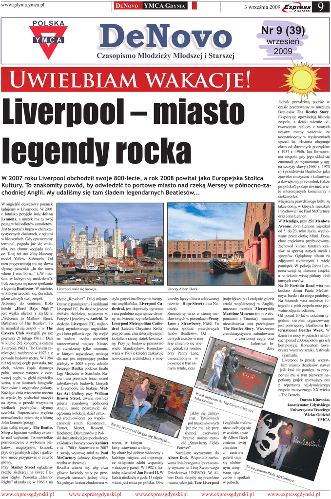 DENOVO YMCA GDYNIA www.gdynia.ymca.pl 3 września 2009 9 Nr 9 (39) wrzesień 2009 Uwielbiam wakacje! Liverpool – miasto legendy rocka W 2007 roku Liverpool obchodził swoje 800-lecie, a rok 2008 powitał jako Europejska Stolica Kultury. To znakomity powód, by odwiedzić to portowe miasto nad rzeką Mersey w północno-zachodniej Anglii. My udaliśmy się tam śladem legendarnych Beatlesów... W angielski deszczowy poranek lądujemy w Liverpoolu. W 2001 r. lotnisko przyjęło imię Johna Lennona, a muzyk ma tu swój posąg w hali odlotów samolotów. Jest to postać z brązu w charakterystycznych okularach, z rękami w kieszeniach. Gdy opuszczamy terminal, pogoda już się zmieniła, zza chmur wygląda słońce. Tutaj też stoi żółty blaszany model Yellow Submarin. Od razu przypominają mi się słowa słynnej piosenki: „In the town where I was born...” („W mieście, w którym się urodziłem”). I tak zaczyna się nasze spotkanie z legendą Beatlesów. W mieście, w którym urodzili się, dorastali, gdzie założyli swój zespół. Jedziemy do centrum. Koło hotelu „Hard Days Night” jest wąska uliczka z szyldem: „Welcome to Mathew Street, Birthplace of The Beatles”. To tu narodził się zespół – w The Cavern Club wystąpili po raz pierwszy 21 lutego 1961 r. Dali w klubie 292 koncerty, a ostatni 3 sierpnia 1963 r. The Cavern zamknięto i rozebrano w 1973 r. z powodu budowy metra. W 1984 r. z tej samej cegły powstała, tuż obok, wierna kopia słynnego pubu, surowe wnętrze z czerwonej cegły, w głębi niewielka scena, a na ścianach fotografie Beatlesów i oryginalne plakaty. Każdego dnia wieczorem można tu wpaść, by posłuchać muzyki na żywo, a przede wszystkim wielkich przebojów słynnej czwórki. Naprzeciwko wejścia nonszalancko opiera się o ścianę John Lennon (posąg). Idąc dalej, mijamy The Beatles Shop z figurami wielkiej czwórki nad wejściem. To niewielkie pomieszczenie z wyborem plakatów, magazynów, książek, płyt, oryginalnych zdjęć i gadżetów może przyprawić o zawrót głowy. Przy Stanley Street oglądamy rzeźbę siedzącej na ławce Eleanor Rigby. Piosenka „Eleanor Rigby” ukazała się w 1966 r. na www.expressgdynski.pl Liverpool stale się rozwija. płycie „Revolver”. Dalej mijamy kramy z pamiątkami i szalikami Liverpool FC. Po drodze jeszcze chińska dzielnica, najstarsza w Europie i jesteśmy w Anfield. To siedziba Liverpool FC, najbardziej utytułowanego angielskiego klubu piłkarskiego. By wejść na stadion, trzeba wcześniej zarezerwować miejsce. Niestety, zwiedzamy tylko muzeum, w którym największą atrakcją dla nas jest imponujący puchar zdobyty w 2005 r. przy udziale Jerzego Dudka podczas finału Ligi Mistrzów w Stambule. Nasza trasa prowadzi teraz wśród zabytkowych budowli, których w Liverpoolu nie brakuje. Walker Art Gallery przy William Brown Street, zwana również galerią narodową północnej Anglii, może poszczycić się ogromną kolekcją dzieł sztuki od średniowiecza po współczesność (m.in. Rembrandt, Turner, Monet, Rossetti, Hockney). Dla turystów z Polski dużą atrakcją jest pochodzący z Gdańska bursztynowy kabinet z ok. 1700 r. Natomiast w 2007 r. swoją wystawę miał tu Paul McCartney (obrazy, fotografie, rzeźba w drewnie). Rzadko zdarza się, aby dwa główne kościoły stały po przeciwnych stronach jednej ulicy. Na jednym końcu zbudowana w Uroczy Albert Dock. stylu gotyckim olbrzymia świątynia anglikańska, Liverpool Cathedral, jest doprawdy ogromna i ma podobno największe dzwony na świecie; rzymskokatolicka Liverpool Metropolitan Cathedral (katedra Chrystusa Króla) przypomina charakterystycznym kształtem raczej statek kosmiczny. Przy jej budowie pracowało wielu Irlandczyków. Konsekrowana w 1967 r. katedra zaskakuje nowoczesną architekturą i wnę- katedry łączy ulica o adekwatnej nazwie – Hope Street (ulica Nadziei). Zmierzamy teraz w stronę rozsławionych w piosenkach Penny Lane i Strawberry Field. Tu można spotkać prawdziwych fanów Beatlesów. Od tamtych czasów w mieście zmieniło się wiele, jednak na rondzie przy Penny Lane, uwiecznionym w piosence o tym samym tytule, czas (największa po Londynie galeria sztuki współczesnej w Anglii), muzeum morskie Merseyside Maritime Museum (m.in. z eksponatami z Titanica), muzeum niewolnictwa oraz przebojowe The Beatles Story. Wieczorem charakterystyczne zabudowania z czerwonej cegły oraz kolorowe łodzie Prze d John wejście m Lenn on. do The C a vern jakby się zatrzymał. Tytułowych pól truskawkowych Na t ej sc enie już nie ma, ale przy od la t gra słynnej czerwonej się B eatle bramie można zanusów. trzem, w którym cić „Strawberry Fields ławy ustawiono w okrąg, Forever”. by ołtarz był dobrze widoczny z Nazajutrz wyruszamy do każdego miejsca, zaś imponują- Albert Dock. Wspaniale zachoce sklepienie zdobi wspaniały wana linia brzegowa i port zostawitrażowy panel. W 1982 r. ka- ły wpisane na Listę Światowego tedrę odwiedził Jan Paweł II. W Dziedzictwa UNESCO. W Alkażdą niedzielę o godz.13 odpra- bert Dock skupiły się przeróżne wiana jest msza po polsku. Obie muzea, takie jak: Tate Liverpool www.expressgdynski.pl www.expressgdynski.pl Club stoi Jednak prawdziwą podróż w czasie przeżywamy w muzeum Beatlesów The Beatles Story. Ekspozycje opowiadają historię zespołu, a dzięki wiernie odtworzonym realiom z tamtych czasów mamy wrażenie, że uczestniczymy w wydarzeniach sprzed lat. Historia obejmuje okres od skromnych początków ( 1957 r.–1960r. lata formowania zespołu, gdy jego skład się zmieniał) po wyniesienie grupy na szczyty sławy (1960 r.–1970 r.) i przedstawia Beatlesów jako zjawisko muzyczne i kulturowe, a dźwiękowy przewodnik (także po polsku!) podaje również wiele interesujących komentarzy i ciekawostek. Miejscem prawdziwego kultu są także domy, w których mieszkali i wychowali się Paul McCartney oraz John Lennon. W Mendips, przy 251 Me