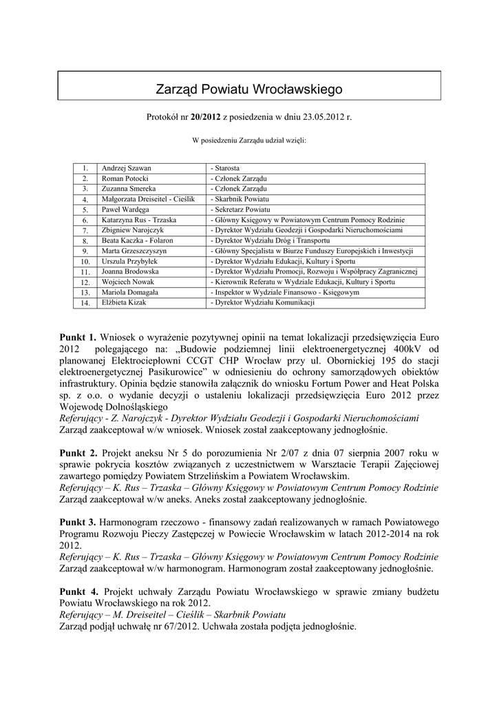 Zarząd Powiatu Wrocławskiego Protokół nr 20/2012 z posiedzenia w dniu 23.05.2012 r. W posiedzeniu Zarządu udział wzięli: 1. 2. 3. 4. 5. 6. 7. 8. 9. 10. 11. 12. 13. 14. Andrzej Szawan Roman Potocki Zuzanna Smereka Małgorzata Dreiseitel - Cieślik Paweł Wardęga Katarzyna Rus - Trzaska Zbigniew Narojczyk Beata Kaczka - Folaron Marta Grzeszczyszyn Urszula Przybyłek Joanna Brodowska Wojciech Nowak Mariola Domagała Elżbieta Kizak - Starosta - Członek Zarządu - Członek Zarządu - Skarbnik Powiatu - Sekretarz Powiatu - Główny Księgowy w Powiatowym Centrum Pomocy Rodzinie - Dyrektor Wydziału Geodezji i Gospodarki Nieruchomościami - Dyrektor Wydziału Dróg i Transportu - Główny Specjalista w Biurze Funduszy Europejskich i Inwestycji - Dyrektor Wydziału Edukacji, Kultury i Sportu - Dyrektor Wydziału Promocji, Rozwoju i Współpracy Zagranicznej - Kierownik Referatu w Wydziale Edukacji, Kultury i Sportu - Inspektor w Wydziale Finansowo - Księgowym - Dyrektor Wydziału Komunikacji Punkt 1. Wniosek o wyrażenie pozytywnej opinii na temat lokalizacji przedsięwzięcia Euro 2012 polegającego na: „Budowie podziemnej linii elektroenergetycznej 400kV od planowanej Elektrociepłowni CCGT CHP Wrocław przy ul. Obornickiej 195 do stacji elektroenergetycznej Pasikurowice” w odniesieniu do ochrony samorządowych obiektów infrastruktury. Opinia będzie stanowiła załącznik do wniosku Fortum Power and Heat Polska sp. z o.o. o wydanie decyzji o ustaleniu lokalizacji przedsięwzięcia Euro 2012 przez Wojewodę Dolnośląskiego Referujący - Z. Narojczyk - Dyrektor Wydziału Geodezji i Gospodarki Nieruchomościami Zarząd zaakceptował w/w wniosek. Wniosek został zaakceptowany jednogłośnie. Punkt 2. Projekt aneksu Nr 5 do porozumienia Nr 2/07 z dnia 07 sierpnia 2007 roku w sprawie pokrycia kosztów związanych z uczestnictwem w Warsztacie Terapii Zajęciowej zawartego pomiędzy Powiatem Strzelińskim a Powiatem Wrocławskim. Referujący – K. Rus – Trzaska – Główny Księgowy w Powiatowym Centrum Pomocy Rodzinie Zarząd zaakceptował w/w aneks. Aneks został zaakceptowany jednogłośnie. Punkt 3. Harmonogram rzeczowo - finansowy zadań realizowanych w ramach Powiatowego Programu Rozwoju Pieczy Zastępczej w Powiecie Wrocławskim w latach 2012-2014 na rok 2012. Referujący – K. Rus – Trzaska – Główny Księgowy w Powiatowym Centrum Pomocy Rodzinie Zarząd zaakceptował w/w harmonogram. Harmonogram został zaakceptowany jednogłośnie. Punkt 4. Projekt uchwały Zarządu Powiatu Wrocławskiego w sprawie zmiany budżetu Powiatu Wrocławskiego na rok 2012. Referujący – M. Dreiseitel – Cieślik – Skarbnik Powiatu Zarząd podjął uchwałę nr 67/2012. Uchwała została podjęta jednogłośnie. Punkt 5. Projekt uchwały Zarządu Powiatu Wrocławskiego w sprawie powołania komisji przetargowej do przeprowadzenia postępowania o udzielenie zamówienia publicznego na pełnienie nadzoru inwestorskiego dla zadania: „Rozwój obszarów wiejskich północnej części gminy Długołęka oraz podniesienie bezpieczeństwa w ruchu drogowym na drodze powiatowej nr 1453D po jej przebudowie w miejscowości Łozina w ramach zadania: Przebudowa odcinka drogi powiatowej nr 1453D – etap II: Węzeł Łozina – granica powiatu” Referujący – B. Kaczka-Folaron – Dyrektor Wydziału Dróg i Transportu Zarząd podjął uchwałę nr 68/2012. Uchwała została podjęta jednogłośnie. Punkt 6. Projekty umów przygotowane przez Wydział Dróg i Transportu Referujący – B. Kaczka-Folaron – Dyrektor Wydziału Dróg i Transportu Zarząd zaakceptował umowy: -SP.DT.273.37.2012 z Przedsiębiorstwem Robót Drogowo-Mostowych Sp. z o.o. z siedzibą w Brzegu, ul. Oławska 26a na realizację zadania pn.: Rozwój obszarów wiejskich północnej części gminy Długołęka oraz podniesienie bezpieczeństwa w ruchu drogowym na drodze powiatowej nr 1453D po jej przebudowie w miejscowości Łozina w ramach zadania: Przebudowa odcinka drogi powiatowej nr 1453D – etap II: Węzeł Łozina – granica powiatu. Całkowity koszt brutto: 2.997.683,91 zł -SP.DT.273.38.2012 z Panem Adrianem Skrobkiem prowadzącym działalność gospodarczą pod nazwą Transport Ciężarowy Adrian Skrobek, ul. Jagiellońska 5, 55-050 Sobótka na świadczenie usług transportowych samochodem ciężarowym – wywrotką o ładowności min. 8 ton, kiprującą na boki i do tyłu, w ilości do 1200 godzin, do prac na terenie Obwodu Drogowego w Mirosławicach. Całkowity koszt brutto: 94.464,00 zł Umowy zostały zaakceptowane jednogłośnie. Punkt 7. Projekt porozumienia przygotowany przez Wydział Dróg i Transportu Referujący – B. Kaczka-Folaron – Dyrektor Wydziału Dróg i Transportu Zarząd zaakceptował porozumienie: - SP-DT.032.15.2012 Porozumienie z firmą Tauron Dystrybucja S.A. z siedzibą w Krakowie przy ul. Zawiłej 65L, 30-390 Kraków, Oddział we Wrocławiu, pl. Powstańców Śl. 5, 53-329 Wrocław w sprawie ustalenia zasad zapewnienia gwarancji jakości robót wykonywanych w pasie drogowym podczas budowy przyłącza kablowego nn w celu zasilania w energię elektryczną działki nr 151/4 w obrębie Zaprężyn, gm. Długołęka Porozumienie zostało zaakceptowane jednogłośnie. Punkt 8. Projekt pisma dotyczący rozwiązania umowy z firmą FOJUD SA na usługę wykonania dokumentacji projektowej i przetargowej dla zadania: „Przebudowa drogi powiatowej nr 1535D w miejscowości Dobrzykowice, Nadolice Małe i Nadolice Wielkie oraz drogi powiatowej nr 1930D w Chrząstawie Małej i Chrząstawie Wielkiej” Referujący – B. Kaczka-Folaron – Dyrektor Wydziału Dróg i Transportu Zarząd jednogłośnie zaakceptował treść w/w pisma. Punkt 9. Informacja do Urzędu Marszałkowskiego Województwa Dolnośląskiego zakresie przesyłania korespondencji dotyczącej realizacji projektu "Różne formy terapii wspomagające rozwój uczniów Specjalnego Ośrodka Szkolno-Wychowawczego w Kątach Wrocławskich" nr WND-PO