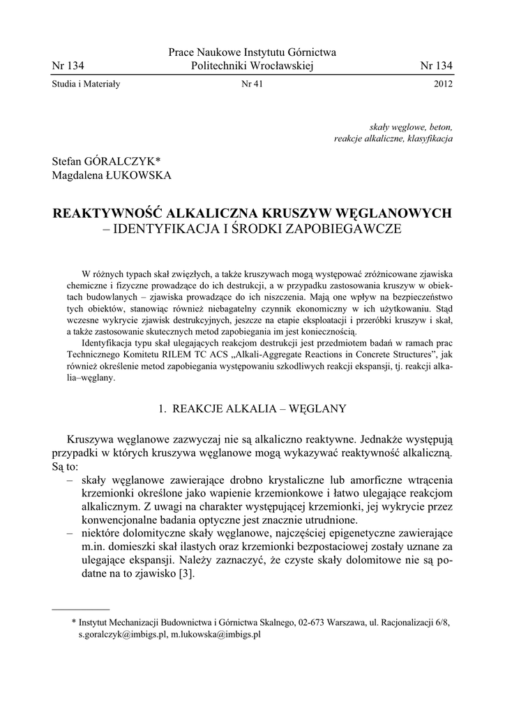 Nr 134 Prace Naukowe Instytutu Górnictwa Politechniki Wrocławskiej Studia i Materiały Nr 41 Nr 134 2012 skały węglowe, beton, reakcje alkaliczne, klasyfikacja Stefan GÓRALCZYK* Magdalena ŁUKOWSKA REAKTYWNOŚĆ ALKALICZNA KRUSZYW WĘGLANOWYCH – IDENTYFIKACJA I ŚRODKI ZAPOBIEGAWCZE W różnych typach skał zwięzłych, a także kruszywach mogą występować zróżnicowane zjawiska chemiczne i fizyczne prowadzące do ich destrukcji, a w przypadku zastosowania kruszyw w obiektach budowlanych – zjawiska prowadzące do ich niszczenia. Mają one wpływ na bezpieczeństwo tych obiektów, stanowiąc również niebagatelny czynnik ekonomiczny w ich użytkowaniu. Stąd wczesne wykrycie zjawisk destrukcyjnych, jeszcze na etapie eksploatacji i przeróbki kruszyw i skał, a także zastosowanie skutecznych metod zapobiegania im jest koniecznością. Identyfikacja typu skał ulegających reakcjom destrukcji jest przedmiotem badań w ramach prac Technicznego Komitetu RILEM TC ACS „Alkali-Aggregate Reactions in Concrete Structures”, jak również określenie metod zapobiegania występowaniu szkodliwych reakcji ekspansji, tj. reakcji alkalia–węglany. 1. REAKCJE ALKALIA – WĘGLANY Kruszywa węglanowe zazwyczaj nie są alkaliczno reaktywne. Jednakże występują przypadki w których kruszywa węglanowe mogą wykazywać reaktywność alkaliczną. Są to: – skały węglanowe zawierające drobno krystaliczne lub amorficzne wtrącenia krzemionki określone jako wapienie krzemionkowe i łatwo ulegające reakcjom alkalicznym. Z uwagi na charakter występującej krzemionki, jej wykrycie przez konwencjonalne badania optyczne jest znacznie utrudnione. – niektóre dolomityczne skały węglanowe, najczęściej epigenetyczne zawierające m.in. domieszki skał ilastych oraz krzemionki bezpostaciowej zostały uznane za ulegające ekspansji. Należy zaznaczyć, że czyste skały dolomitowe nie są podatne na to zjawisko [3]. __________ * Instytut Mechanizacji Budownictwa i Górnictwa Skalnego, 02-673 Warszawa, ul. Racjonalizacji 6/8, [email protected], [email protected] 86 Mechanizm ekspansji nadal budzi wiele kontrowersji. Jednym z mechanizmów wyjaśniających to zjawisko jest fakt, że w środowisku alkalicznym następuje rozpad (dedolimtyzacja) dolomitu przy jednoczesnym wytracaniu się brucytu i kalcytu [3, 6]. Jednakże, badania niektórych skał węglanowych sugerują, że szkodliwa ekspansja w kruszywach dolomitowych spowodowana jest przez reakcje alkalia–krzemionka amorficznego kwarcu, która nie jest wykrywalna pod mikroskopem optycznym [1]. Zgodnie z tym mechanizmem, dedolomityzacja nie powoduje ekspansji, lecz jest pierwszym etapem tego zjawiska powodującym rozluźnienie tekstury skały i umożliwienie wniknięcia w jej struktury roztworów alkalicznych i ich reagowania z krzemionką i minerałami ilastymi. Powoduje to możliwość wystąpienia ekspansji powstającej w wyniku reakcji alkalia–krzemionka bezpostaciowa (ASR) oraz mechaniczne pęcznienie „suchych” minerałów ilastych [3]. Niezależnie od samego mechanizmu, możliwości sterowania reakcjami alkalicznym w kruszywach dolomitowych są znacznie bardziej ograniczone niż w przypadku reakcji alkalia–krzemionka. Podstawową strategią, biorąc pod uwagę obecny poziom wiedzy na temat omawianego zjawiska, jest skoncentrowanie się na identyfikacji i nie stosowaniu takich kruszyw. Jednak doświadczenie sugeruje, że niektóre dolomitowe kruszywa węglanowe mogą być stosowane w betonie, o ile cement zawiera wysoki dodatek żużla hutniczego. W związku z powyższym można przyjąć, że metody zapobiegania występowania reakcji alkalicznych powinny opierać się na określeniu wymaganego stopnia środków zapobiegawczych oraz podjęciu realizacji zalecanych środków zapobiegawczych. 2. OKREŚLANIE STOPNIA ŚRODKÓW ZAPOBIEGAWCZYCH Kluczowe działania skupiają się na scharakteryzowaniu wymagań strukturalnych, cyklu życia i warunków środowiskowych. 2.1. WYMAGANIA STRUKTURALNE I CYKL ŻYCIA Szkodliwe reakcje alkaliczne w kruszywach przebiegają powoli i stopniowo. Zazwyczaj w umiarkowanym i chłodniejszym klimacie zaczynają powodować widoczne uszkodzenia po 5–10 latach, mogą następować przez kolejne 20, 30 lat, a nawet dłużej. W cieplejszym klimacie reakcje są często przyspieszone. Niektóre kruszywa podlegające reakcjom nie ulegają szybkiemu pogorszeniu ich stanu, ale w końcowym stadium ulegają większej destrukcji. W przypadku reakcji z udziałem potencjalnie reaktywnych kruszyw węglanowych, nawet w betonie zawierającym niewielką zawartość alkaliów pochodzących z cementu, zjawiska ekspansji i uszkodzenia struktur mogą być widoczne już po 3 latach. Uszkodzenia występują w formie pęknięć i destrukcji betonu, czasami prowadzą, także do przemieszczenia poszczególnych elementów konstrukcji. Szybkość występowania oznak reakcji alkalicznych 87 w betonie z kruszywami węglanowymi jest na tyle korzystna, że występuje najczęściej przed znaczącą destrukcją konstrukcji betonowych. Jest więc czas na działania zapobiegawcze i ochronę konstrukcji. W zależności od wysokości ryzyka wystąpienia reakcji alkalicznych i wynikającego stąd zagrożenia pogorszenia jakości konstrukcji betonowych wydziela się trzy poziomy ich kategorii: S1 – niskie ryzyko, S2 – normalne ryzyko, S3 – wysokie ryzyko. Obowiązkiem właściciela, lub organu odpowiedzialnego za konstrukcje budowlane przy współpracy z projektantem jest określenie odpowiedniego poziomu ryzyka. Na decyzję o jego poziomie będzie miało wpływ kilka czynników, m.in. skutki ekonomiczne pogorszenia stanu konstrukcji, kwestie związane z inżynierią i bezpieczeństwem. Inne czynniki, które mają być brane pod uwagę to łatwość, z jaką każde pogorszenie stabilności struktury może być wykryte, monitorowane i zarządzane, a także wygląd struktury betonu. Kryteria wpływające na określenie poziomu ryzyka przed