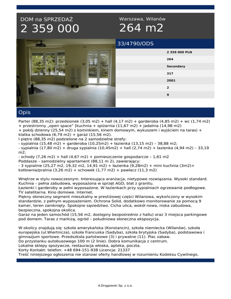 DOM na SPRZEDAŻ 2 359 000 Warszawa, Wilanów 264 m2 33/4790/ODS 2 359 000 PLN 264 Secondary 317 2001 2 9 Opis Parter (88,35 m2): przedsionek (3,05 m2) + hall (4,17 m2) + garderoba (4,85 m2) + wc (1,74 m2) + przestronny „open space” [kuchnia + spiżarnia (11,67 m2) + jadalnia (14,98 m2) + pokój dzienny (25,54 m2) z kominkiem, kinem domowym, wykuszem i wyjściem na taras) + klatka schodowa (6,79 m2) + garaż (15,56 m2). I piętro (88,35 m2) podzielone na 2 samodzielne strefy: - sypialnia (15,48 m2) + garderoba (10,25m2) + łazienka (13,15 m2) – 38,88 m2; - sypialnia (17,80 m2) + druga sypialnia (10,45m2) + hall (2,74 m2) + łazienka (4,94 m2) – 33,19 m2; - schody (7,26 m2) + hall (4,67 m2) + pomieszczenie gospodarcze – 1,61 m2 Poddasze – samodzielny apartament (88,11 m 2), zawierający: - 3 sypialnie (25,27 m2, 19,32 m2, 14,91 m2) + łazienka (9,28m2) + mini kuchnia (3m2)+ kotłownia/pralnia (3,26 m2) + schowek (1,77 m2) + pawlacz (11,3 m2) Wnętrze w stylu nowoczesnym. Interesująca aranżacja, nietypowe rozwiązania. Wysoki standard. Kuchnia – pełna zabudowa, wyposażona w sprzęt AGD, blat z granitu. Łazienki i garderoby w pełni wyposażone. W łazienkach przy sypialniach ogrzewanie podłogowe. TV satelitarna. Kino domowe. Internet. Piękny słoneczny segment mieszkalny w prestiżowej części Wilanowa, wykończony w wysokim standardzie, z pełnym wyposażeniem. Ochrona Solid, dodatkowo monitorowanie za pomocą 9 kamer, teren zamknięty. Spokojne sąsiedztwo. Cicha ulica, wokół nowa, niska zabudowa, bezpieczna, spokojna okolica. Garaż na jeden samochód (15,56 m2, dostępny bezpośrednio z hallu) oraz 3 miejsca parkingowe pod domem. Taras z markizą, ogród – południowa słoneczna ekspozycja. W okolicy znajdują się: szkoła amerykańska (Konstancin), szkoła niemiecka (Wilanów), szkoła europejska (ul.Wiertnicza), szkoła francuska (Sadyba), szkoła brytyjska (Sadyba), podstawowa i gimnazjum sportowe. Przedszkola państwowe (3) i prywatne (11). Plac zabaw. Do przystanku autobusowego 100 m (2 linie). Dobra komunikacja z centrum. Lokalne sklepy spożywcze, restauracja włoska, apteka, poczta. Korty Kontakt: telefon: +48 694-151-938 Licencja: 21337 Treść niniejszego ogłoszenia nie stanowi oferty handlowej w rozumieniu Kodeksu Cywilnego. A.Drągowski Sp. z o.o. Agnieszka Andruszkiewicz tel. 694151938 email: [email protected] A.Drągowski Sp. z o.o. Powered by TCPDF (www.tcpdf.org)