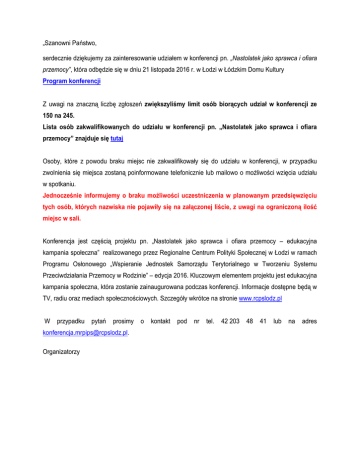„Szanowni Państwo, serdecznie dziękujemy za zainteresowanie udziałem w konferencji pn. „Nastolatek jako sprawca i ofiara przemocy”, która odbędzie się w dniu 21 listopada 2016 r. w Łodzi w Łódzkim Domu Kultury Program konferencji Z uwagi na znaczną liczbę zgłoszeń zwiększyliśmy limit osób biorących udział w konferencji ze 150 na 245. Lista osób zakwalifikowanych do udziału w konferencji pn. „Nastolatek jako sprawca i ofiara przemocy” znajduje się tutaj Osoby, które z powodu braku miejsc nie zakwalifikowały się do udziału w konferencji, w przypadku zwolnienia się miejsca zostaną poinformowane telefonicznie lub mailowo o możliwości wzięcia udziału w spotkaniu. Jednocześnie informujemy o braku możliwości uczestniczenia w planowanym przedsięwzięciu tych osób, których nazwiska nie pojawiły się na załączonej liście, z uwagi na ograniczoną ilość miejsc w sali. Konferencja jest częścią projektu pn. „Nastolatek jako sprawca i ofiara przemocy – edukacyjna kampania społeczna” realizowanego przez Regionalne Centrum Polityki Społecznej w Łodzi w ramach Programu Osłonowego „Wspieranie Jednostek Samorządu Terytorialnego w Tworzeniu Systemu Przeciwdziałania Przemocy w Rodzinie” – edycja 2016. Kluczowym elementem projektu jest edukacyjna kampania społeczna, która zostanie zainaugurowana podczas konferencji. Informacje dostępne będą w TV, radiu oraz mediach społecznościowych. Szczegóły wkrótce na stronie www.rcpslodz.pl W przypadku pytań prosimy o kontakt pod nr tel. 42 203 48 41 lub na adres [email protected]. Organizatorzy