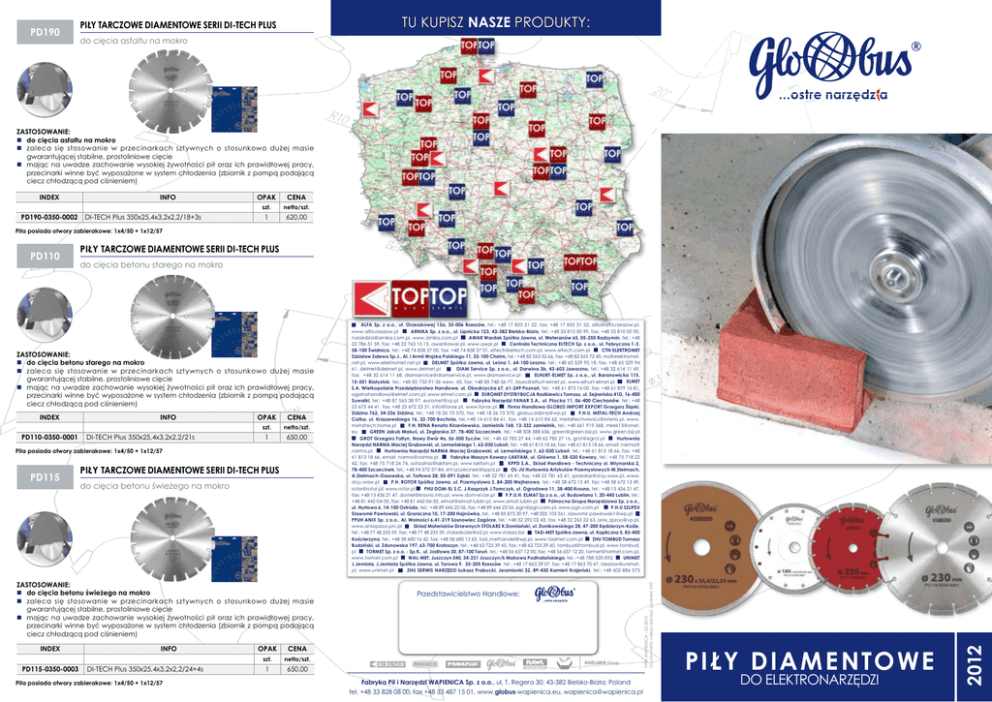 PD190 TU KUPISZ NASZE PRODUKTY: Piły tarczowe diamentowe serii DI-TECH Plus do cięcia asfaltu na mokro ZASTOSOWANIE: n do cięcia asfaltu na mokro n zaleca się stosowanie w przecinarkach sztywnych o stosunkowo dużej masie gwarantującej stabilne, prostoliniowe cięcie n mając na uwadze zachowanie wysokiej żywotności pił oraz ich prawidłowej pracy, przecinarki winne być wyposażone w system chłodzenia (zbiornik z pompą podającą ciecz chłodzącą pod ciśnieniem) INDEX PD190-0350-0002 INFO DI-TECH Plus 350x25,4x3,2x2,2/18+3s OPAK CENA szt. netto/szt. 1 620,00 Piła posiada otwory zabierakowe: 1x4/50 + 1x12/57 Piły tarczowe diamentowe serii DI-TECH Plus do cięcia betonu starego na mokro INDEX PD110-0350-0001 INFO DI-TECH Plus 350x25,4x3,2x2,2/21s OPAK CENA szt. netto/szt. 1 650,00 Piła posiada otwory zabierakowe: 1x4/50 + 1x12/57 PD115 Piły tarczowe diamentowe serii DI-TECH Plus do cięcia betonu świeżego na mokro ZASTOSOWANIE: n do cięcia betonu świeżego na mokro n z aleca się stosowanie w przecinarkach sztywnych o stosunkowo dużej masie gwarantującej stabilne, prostoliniowe cięcie n mając na uwadze zachowanie wysokiej żywotności pił oraz ich prawidłowej pracy, przecinarki winne być wyposażone w system chłodzenia (zbiornik z pompą podającą ciecz chłodzącą pod ciśnieniem) INDEX PD115-0350-0003 INFO DI-TECH Plus 350x25,4x3,2x2,2/24+4s Piła posiada otwory zabierakowe: 1x4/50 + 1x12/57 OPAK CENA szt. netto/szt. 1 650,00 Przedstawicielstwo Handlowe: Fabryka Pił i Narzędzi WAPIENICA Sp. z o.o., ul. T. Regera 30; 43-382 Bielsko-Biała; Poland tel. +48 33 828 08 00, fax +48 33 487 15 01, www.globus-wapienica.eu, [email protected] PIŁY D IAMENTOWE DO ELEKTRONARZĘDZI 2012 ZASTOSOWANIE: ndo cięcia betonu starego na mokro n z aleca się stosowanie w przecinarkach sztywnych o stosunkowo dużej masie gwarantującej stabilne, prostoliniowe cięcie n mając na uwadze zachowanie wysokiej żywotności pił oraz ich prawidłowej pracy, przecinarki winne być wyposażone w system chłodzenia (zbiornik z pompą podającą ciecz chłodzącą pod ciśnieniem) ALFA Sp. z o.o., ul. Orzeszkowej 13a, 35-006 Rzeszów, tel.: +48 17 853 31 22, fax: +48 17 853 31 22, [email protected], ARNIKA Sp. z o.o., ul. Lipnicka 123, 43-382 Bielsko-Biała, tel.: +48 33 810 00 99, fax: +48 33 810 00 90, www.alfa.rzeszow.pl AWAR Wardak Spółka Jawna, ul. Weteranów 65, 05-250 Radzymin, tel.: +48 [email protected], www.arnika.com.pl Centrala Techniczna ELTECH Sp. z o.o., ul. Fabryczna 1-3, 22 786 51 59, fax: +48 22 763 15 13, [email protected], www.awar.pl CTN ELEKTROMET 58-100 Świdnica, tel.: +48 74 858 27 00, fax: +48 74 858 27 01, [email protected], www.eltech.com.pl Zdzisław Zalewa Sp.J., Al. I Armii Wojska Polskiego 11, 22-100 Chełm, tel.: +48 82 565 52 66, fax: +48 82 565 72 40, mz@elektromet. DELMET Spółka Jawna, ul. Leśna 1, 64-100 Leszno, tel.: +48 65 529 95 18, fax: +48 65 529 94 net.pl, www.elektromet.net.pl DIAM Service Sp. z o.o., ul. Darwina 3b, 43-603 Jaworzno, tel.: +48 32 614 11 69, 61, [email protected], www.delmet.pl ELHURT-ELMET Sp. z o.o., ul. Baranowicka 115, fax: +48 32 614 11 68, [email protected], www.diamservice.pl ELMET 15-501 Białystok, tel.: +48 85 732-91-36 wew. 43, fax: +48 85 740-36-77, [email protected], www.elhurt-elmet.pl S.A. Wielkopolskie Przedsiębiorstwo Handlowe, ul. Obodrzycka 67, 61-249 Poznań, tel.: +48 61 873 16 00, fax: +48 61 879 16 81, [email protected], www.elmet.com.pl EUROMET DYSTRYBUCJA Radkiewicz Tomasz, ul. Sejneńska 41D, 16-400 Fabryka Narzędzi FANAR S.A., ul. Płocka 11, 06-400 Ciechanów, tel.: +48 Suwałki, tel.: +48 87 565 38 97, [email protected] Firma Handlowa GLOBUS IMPORT EXPORT Grzegorz Śląski, 23 672 44 41, fax: +48 23 672 23 31, [email protected], www.fanar.pl F.H.U. METAL-TECH Andrzej Sidzina 762, 34-236 Sidzina, tel.: +48 18 26 73 370, fax: +48 18 26 73 370, [email protected] Całka, ul. Kraszewskiego 16, 32-700 Bochnia, tel.:+48 14 610 84 61, fax: +48 14 610 84 62, [email protected], www. F.H. RENA Renata Kirzeniewska, Jamielnik 168, 13-332 Jamielnik, tel.: +48 661 919 368, mirek13@onet. metaltech.home.pl GREEN Jakub Makuś, ul. Żeglarska 37, 78-400 Szczecinek, tel.: +48 508 388 656, [email protected], www.green.biz.pl eu GROT Grzegorz Faltyn, Nowy Dwór 4a, 56-500 Syców, tel.: +48 62 785 27 44, +48 62 785 27 16, [email protected] Hurtownia Narzędzi NARMA Maciej Grabowski, ul. Lemańskiego 1, 62-030 Luboń, tel.: +48 61 813 18 66, fax: +48 61 813 18 66, email: narma@ Hurtownia Narzędzi NARMA Maciej Grabowski, ul. Lemańskiego 1, 62-030 Luboń, tel.: +48 61 813 18 66, fax: +48 narma.pl Fabryka Maszyn Kowary-LAKFAM, ul. Główna 1, 58-530 Kowary, tel.: +48 75 718 22 61 813 18 66, email: [email protected] KPPD S.A., Skład Handlowo - Techniczny ul. Młynarska 2, 42, fax: +48 75 718 24 74, [email protected], www.lakfam.pl OL-JU Hurtownia Artykułów Przemysłowych M.Stelmach, 78-400 Szczecinek, tel.: +48 94 372-37-84, [email protected] A.Stelmach-Ossowska, ul. Torfowa 28, 05-091 Ząbki, tel.: +48 22 781 65 41, fax: +48 22 781 65 41, [email protected], www. P.H. ROTOR Spółka Jawna, ul. Przemysłowa 3, 84-200 Wejherowo, tel.: +48 58 672 13 49, fax: +48 58 672 13 49, ol-ju.waw.pl PHU DOM-EL S.C. J.Kasprzyk J.Tomczyk, ul. Ogrodowa 11, 38-400 Krosno, tel.: +48 13 436 21 47, [email protected], www.rotor.pl fax: +48 13 436 21 47, [email protected], www.dom-el.rze.pl P.P.U.H. ELMAT Sp.z o.o., ul. Budowlana 1, 20-445 Lublin, tel.: +48 81 442-04-35, fax: +48 81 442-04-35, [email protected], www.emat.lublin.pl Północna Grupa Narzędziowa Sp. z o.o., ul. Hurtowa 6, 14-100 Ostróda, tel.: +48 89 646 22 06, fax: +48 89 646 22 06, [email protected], www.pgn.com.pl P.H.U SZLIFEX Sławomir Pawłowski, ul. Graniczna 10, 17-200 Hajnówka, tel.: +48 85 873 30 97, +48 505 103 361, [email protected] PPUH ANIX Sp. z o.o., Al. Wolności 6,41-219 Sosnowiec Zagórze, tel.: +48 32 292 02 43, fax: +48 32 263 22 63, [email protecte