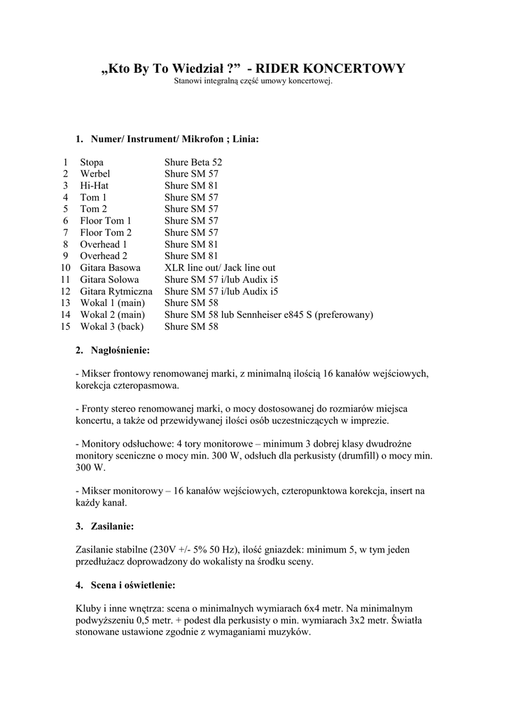 „Kto By To Wiedział ?” - RIDER KONCERTOWY Stanowi integralną część umowy koncertowej. 1. Numer/ Instrument/ Mikrofon ; Linia: 1 2 3 4 5 6 7 8 9 10 11 12 13 14 15 Stopa Werbel Hi-Hat Tom 1 Tom 2 Floor Tom 1 Floor Tom 2 Overhead 1 Overhead 2 Gitara Basowa Gitara Solowa Gitara Rytmiczna Wokal 1 (main) Wokal 2 (main) Wokal 3 (back) Shure Beta 52 Shure SM 57 Shure SM 81 Shure SM 57 Shure SM 57 Shure SM 57 Shure SM 57 Shure SM 81 Shure SM 81 XLR line out/ Jack line out Shure SM 57 i/lub Audix i5 Shure SM 57 i/lub Audix i5 Shure SM 58 Shure SM 58 lub Sennheiser e845 S (preferowany) Shure SM 58 2. Nagłośnienie: - Mikser frontowy renomowanej marki, z minimalną ilością 16 kanałów wejściowych, korekcja czteropasmowa. - Fronty stereo renomowanej marki, o mocy dostosowanej do rozmiarów miejsca koncertu, a takŜe od przewidywanej ilości osób uczestniczących w imprezie. - Monitory odsłuchowe: 4 tory monitorowe – minimum 3 dobrej klasy dwudroŜne monitory sceniczne o mocy min. 300 W, odsłuch dla perkusisty (drumfill) o mocy min. 300 W. - Mikser monitorowy – 16 kanałów wejściowych, czteropunktowa korekcja, insert na kaŜdy kanał. 3. Zasilanie: Zasilanie stabilne (230V +/- 5% 50 Hz), ilość gniazdek: minimum 5, w tym jeden przedłuŜacz doprowadzony do wokalisty na środku sceny. 4. Scena i oświetlenie: Kluby i inne wnętrza: scena o minimalnych wymiarach 6x4 metr. Na minimalnym podwyŜszeniu 0,5 metr. + podest dla perkusisty o min. wymiarach 3x2 metr. Światła stonowane ustawione zgodnie z wymaganiami muzyków. Na scenie, ku lepszemu występowi, powinna znajdować się woda mineralna i/lub piwo dla kaŜdego z muzyków. UWAGI: Jesteśmy świadomi, Ŝe w wielu klubach w naszym kraju powyŜsze wymagania nie mogą być spełnione w 100%. W celu ustalenia wszelakich róŜnic – kontakt poniŜej. „Kto By To Wiedział ?” – kontakt z zespołem: mail: [email protected] ; Marcin Węglarz tel.: 507.068.333 ; Dawid Zawartka tel.: 508.298.982 ; W sprawie wątpliwości odnośnie rideru, prosimy o kontakt na pierwszy z numerów powyŜej.