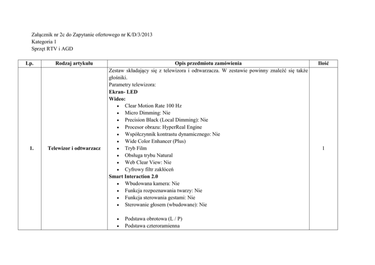 Załącznik nr 2c do Zapytanie ofertowego nr K/D/3/2013 Kategoria 1 Sprzęt RTV i AGD Lp. 1. Rodzaj artykułu Telewizor i odtwarzacz Opis przedmiotu zamówienia Zestaw składający się z telewizora i odtwarzacza. W zestawie powinny znaleźć się także głośniki. Parametry telewizora: Ekran- LED Wideo: • Clear Motion Rate 100 Hz • Micro Dimming: Nie • Precision Black (Local Dimming): Nie • Procesor obrazu: HyperReal Engine • Współczynnik kontrastu dynamicznego: Nie • Wide Color Enhancer (Plus) • Tryb Film • Obsługa trybu Natural • Web Clear View: Nie • Cyfrowy filtr zakłóceń Smart Interaction 2.0 • Wbudowana kamera: Nie • Funkcja rozpoznawania twarzy: Nie • Funkcja sterowania gestami: Nie • Sterowanie głosem (wbudowane): Nie • • Podstawa obrotowa (L / P) Podstawa czteroramienna Ilość 1 Audio Dźwięk 3D: Nie • Moc muzyczna (RMS): 10 W x 2 • Dolby Digital Plus / Dolby Pulse • SRS / DNSe+: DTS Studio Sound • dts 2.0 + Digital Out / DTS Premium Audio: DTS Premium Audio 5.1 • Typ głośników: Down Firing + Full Range • Sound Customizer: Nie • Głośnik niskotonowy: Nie System • Tuner DTV: DVB-T / C • Tuner analogowy • CI/CI+: CI+ (1.3) Eco • Klasa efektywności energetycznej A+ • Czujnik Eco Akcesoria • Przedłużacz do podczerwieni • Pilot TM1250A • Kabel zasilający • Instrukcja obsługi • Instrukcja w wersji elektronicznej • Baterie (do pilota) • Mozliwośc montowania pod wieszak Mini • Możliwość montowania pod wieszak Vesa Wyświetlacz • Rozmiar w calach (cm): min. 46 (117.18) • Rozdzielczość 1 920 x 1 080 • Ultra Clear Panel: Nie Smart TV 2.0 • Funkcja Smart Hub • Funkcja warto obejrzeć • Movies & TV Shows: Nie • Funkcja aplikacje • Funkcja sieci społecznościowe • Funkcja moje pliki • Samsung SMART View (tylko Clone View) • Intelligent Viewing: Nie • Funkcja S Recommendation • Przeglądarka internetowa Wejścia i Wyjścia • Wejście komponentowe (Y / Pb / Pr) x 1 • Wejście kompozytowe (AV) x 1 (w użyciu jako komponentowe Y) • Wyjście cyfrowe audio (optyczne) x 1 • Wejście DVI Audio (Mini Jack) x 1 • Ethernet (LAN) x 1 • HDMI x 3 • Wejście RF (naziemne / kablowe) x 1 • Wejście RF (satelitarne) x 1 • USB x 2 • Słuchawki x 1 • Scart x 1 • Gniazdo CI x 1 • IR out x 1 Zasilanie • Zasilacz: AC 220 – 240 V 50 / 60 Hz • Pobór mocy w trybie energooszczędnym: 24,0 W • Pobór mocy w trybie Stand-by: 0,30 W • Szczytowy współczynnik jasności: 67% • Pobór mocy (IEC 62087 Edition 2): 59 W • Rtęć: 0,0mg • Ołów: Obecny • Roczne zużycie energii (standard UE, kWh): 86 Parametry i funkcje • ConnectShare™ (USB 2.0): Film • Funkcja Historia • Wbudowany WLAN • Język menu: 26 języków europejskich • Wielozadaniowość • EPG • Teletekst (TTXT) • AllShare (udostępnianie treści) • All Share (Screen Mirroring) • Anynet+ (HDMI-CEC) • Automatyczne wyszukiwanie kanałów • Automatyczne wyłączanie zasilania • Automatyczne wyrównywanie poziomu dźwięku • Obsługa napisów • Zegar / timer wł./wył. • Tryb gra • Obraz w obrazie (PiP) • Wyłącznik czasowy • Zaawansowany tryb sportowy • Wbudowany Bluetooth HID: Nie • • • • • Obsługa USB HID PVR Obsługa przez smartfon WiFi Direct Parametry odtwarzacza i głośników: • Liczba kanałów: 5.1 • Moc całkowita: 1000 W Właściwości audio: • Dolby Digital • Dolby Pro Logic II • Dolby Digital Plus • Dolby True HD • DTS • DTS 96 / 24 • DTS HD • DTS Neo: Fusion • 3D Sound Plus • Inteligentne zarządzanie poziomem głośności (Smart Volume) • MP3 Enhancer • Power Bass – podbicie niskich tonów • Dźwięk wirtualny (7.1) • Ustawienia korektora dźwięku • Tryby dźwięku (DSP) x 9 • Crystal Amplifier Plus Tuner: • Tuner FM Wymiary: • Wymiary urządzenia: 430 x 55 x 250 mm (S x W x G) • Wymiary głośnika (niskotonowego): 155 x 350 x 285 mm (S x W x G) • Wymiary głośnika (przedniego): 95 x 144 x 75 mm (S x W x G) • Wymiary głośnika (centralnego): 227 x 95 x 75 mm (S x W x G) • Wymiary głośnika (surround): 95 x 144 x 75 mm (S x W x G) • Wymiary opakowania: 541 x 334 x 416 mm (S x W x G) Akcesoria • Antena Odtwarzane nośniki/formaty • Możliwość odtwarzania Blu-ray 3D • Wideo Blu-ray • DVD-Video / DVD±R / DVD±RW • CD DA / CD-R / CD-RW • Format VCD 1.1 Parametry wideo • BD Wise 3.0 • BD Live • Skalowanie obrazu z płyt DVD do rozdzielczości Full HD Funkcje dodatkowe • Procesor dwurdzeniowy • Konwertowanie Audio CD do plików MP3 • Funkcja TV Sound On • Przeglądarka internetowa • Smart Hub – dostęp do aplikacji i usług Format dekodowania • AVCHD • DivX, DivX HD LPCM • AAC • MP3 • MKV • WMA, WMV (1 / 2 / 3 / 7 / 9) • FLAC • JPEG (HD) Możliwość podłączenia • Anynet+ (HDMI-CEC) • DLNA • Udostępnianie treści za pomocą technologii AllShare • Obsługa USB Host 2.0 • Wbudowana bezprzewodowa karta sieciowa • Obsługa Bluetooth • ARC (Audio Return Channel) • Wyjście HDMI • 1 wejście HDMI • 1 wejście audio • 1 wejście optyczne Głośnik • 4 głośniki satelitarne • Pasywny głośnik niskotonowy • Pełnozakresowe głośniki przednie • Pełnozakresowy głośnik dialogowy • Pełnozakresowe głośniki surround Zasilanie • Zużycie energii w trybie czuwania: 0,5 W • Zużycie energii w trakcie działania: 72,5 W • Zamawiający dopuszcza złożenie ofert równoważnych, ale o parametrach nie gorszych niż w specyfikacji powyżej. 2. Lodówka Parametry lodówki: Kolor: stal nierdzewna/biały Położenie zamrażarki- dół Wysokość min. 201 cm Szerokość min. 59 cm Głębokość min. 65 cm Liczba agregatów 1 Liczba termosów- 1 Zdolność zamrażania [kg/24h] 4 Czas utrzymania temperatury w przypadku braku zasilania- min. 18 godzin Sposób odszraniania (rozmrażania) chłodziarki automatyczny/ mechan