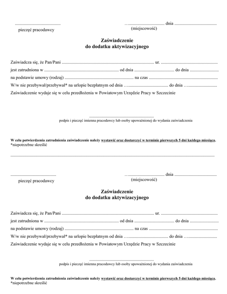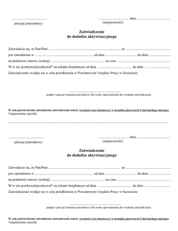 ......................................... pieczęć pracodawcy …................................ dnia ...................................... (miejscowość) Zaświadczenie do dodatku aktywizacyjnego Zaświadcza się, że Pan/Pani ................................................................................... ur. ................................................... jest zatrudniona w ................................................................... od dnia .................................... do dnia .......................... na podstawie umowy (rodzaj) .............................................................. na czas .............................................................. W/w nie przebywał/przebywał* na urlopie bezpłatnym od dnia ….................................... do dnia ….......................... Zaświadczenie wydaje się w celu przedłożenia w Powiatowym Urzędzie Pracy w Szczecinie .......................................................... podpis i pieczęć imienna pracodawcy lub osoby upoważnionej do wydania zaświadczenia W celu potwierdzenia zatrudnienia zaświadczenie należy wystawić oraz dostarczyć w terminie pierwszych 5 dni każdego miesiąca. *niepotrzebne skreślić ______________________________________________________________________________________________________________ ......................................... pieczęć pracodawcy …................................ dnia ...................................... (miejscowość) Zaświadczenie do dodatku aktywizacyjnego Zaświadcza się, że Pan/Pani ................................................................................... ur. ................................................... jest zatrudniona w ................................................................... od dnia .................................... do dnia .......................... na podstawie umowy (rodzaj) .............................................................. na czas .............................................................. W/w nie przebywał/przebywał* na urlopie bezpłatnym od dnia ….................................... do dnia ….......................... Zaświadczenie wydaje się w celu przedłożenia w Powiatowym Urzędzie Pracy w Szczecinie .......................................................... podpis i pieczęć imienna pracodawcy lub osoby upoważnionej do wydania zaświadczenia W celu potwierdzenia zatrudnienia zaświadczenie należy wystawić oraz dostarczyć w terminie pierwszych 5 dni każdego miesiąca. *niepotrzebne skreślić