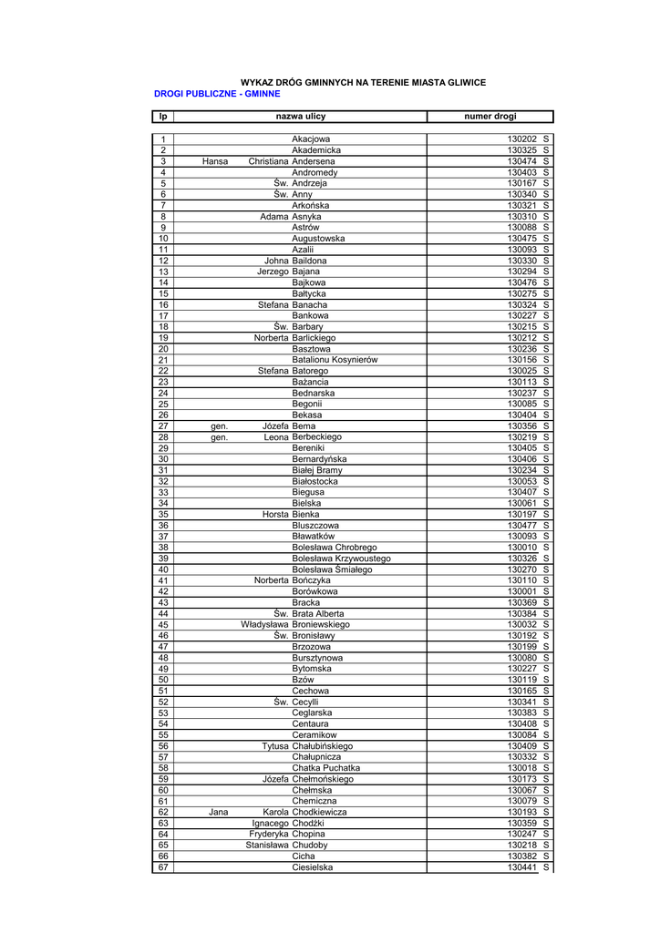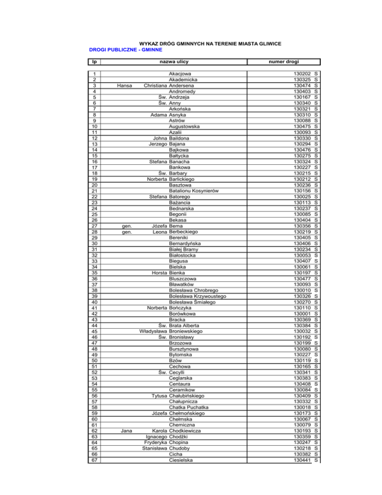 WYKAZ DRÓG GMINNYCH NA TERENIE MIASTA GLIWICE DROGI PUBLICZNE - GMINNE nazwa ulicy lp 1 2 3 4 5 6 7 8 9 10 11 12 13 14 15 16 17 18 19 20 21 22 23 24 25 26 27 28 29 30 31 32 33 34 35 36 37 38 39 40 41 42 43 44 45 46 47 48 49 50 51 52 53 54 55 56 57 58 59 60 61 62 63 64 65 66 67 Hansa Christiana Św. Św. Adama Johna Jerzego Stefana Św. Norberta Stefana gen. gen. Józefa Leona Horsta Norberta Św. Władysława Św. Św. Tytusa Józefa Jana Karola Ignacego Fryderyka Stanisława Akacjowa Akademicka Andersena Andromedy Andrzeja Anny Arkońska Asnyka Astrów Augustowska Azalii Baildona Bajana Bajkowa Bałtycka Banacha Bankowa Barbary Barlickiego Basztowa Batalionu Kosynierów Batorego Bażancia Bednarska Begonii Bekasa Bema Berbeckiego Bereniki Bernardyńska Białej Bramy Białostocka Biegusa Bielska Bienka Bluszczowa Bławatków Bolesława Chrobrego Bolesława Krzywoustego Bolesława Śmiałego Bończyka Borówkowa Bracka Brata Alberta Broniewskiego Bronisławy Brzozowa Bursztynowa Bytomska Bzów Cechowa Cecylli Ceglarska Centaura Ceramikow Chałubińskiego Chałupnicza Chatka Puchatka Chełmońskiego Chełmska Chemiczna Chodkiewicza Chodźki Chopina Chudoby Cicha Ciesielska numer drogi 130202 130325 130474 130403 130167 130340 130321 130310 130088 130475 130093 130330 130294 130476 130275 130324 130227 130215 130212 130236 130156 130025 130113 130237 130085 130404 130356 130219 130405 130406 130234 130053 130407 130061 130197 130477 130093 130010 130326 130270 130110 130001 130369 130384 130032 130192 130199 130080 130227 130119 130165 130341 130383 130408 130084 130409 130332 130018 130173 130067 130079 130193 130359 130247 130218 130382 130441 S S S S S S S S S S S S S S S S S S S S S S S S S S S S S S S S S S S S S S S S S S S S S S S S S S S S S S S S S S S S S S S S S S S lp 68 69 70 71 72 73 74 75 76 77 78 79 80 81 82 83 84 85 86 87 88 89 90 91 92 nazwa ulicy Stefana Aleksandra Jana Konstantego Jana Bolesława Ignacego Michała Stanisława Ksawerego 93 94 95 96 97 98 99 100 101 102 103 104 105 106 107 108 109 110 111 112 113 114 115 116 117 Konstantego 118 119 120 121 122 123 124 125 126 127 128 129 130 131 132 133 134 135 136 137 138 139 Benedykta Jana Tomasza Gustawa Alberta Św. Juliana Teodora Małgorzaty Aleksandra Jurija Jana Ildefonsa Antonio Aleksandra Bartosza Poli Karola Maksyma Wiktora Antoniego Cieszyńska Cmentarna Cyraneczki Czajki Czarnieckiego Czekanowskiego Czeremchowa Czerskiego Damrota Darz Bór Dekabrystów Derkacza Dębowa Diamentowa Długa Długosza Dojazdowa Dolnych Wałów Domańskiego Domeyki Dożynkowa Drozdów Drzymały Dubois Dunikowskiego Dworcowa (nitka północna przy kościele św. Barbary) Dworska Dybowskiego Dzierżona Dziewanny Dzionkarzy Edisona Eiffel'a Einsteina Ekonomistów Elektryków Elżbiety Fabryczna Fałata Ficka Fiołkowa Fizyków Floriańska Folwarczna Fornalskiej Fredry Gagarina Gajdy Galaktyki Gałczyńskiego Gaudiego Gankowa Gdańska Gdyńska Geodetów Gierymskiego Gipsowa Glebowa Głogowska Głowackiego Gnieźnieńska Gojawiczyńskiej Goduli Goplany Gorkiego Gorzołki Goździkowa Górna Górników Góry Chełmskiej Grabowskiego Graniczna numer drogi 130117 130393 130442 130291 130191 130478 130443 130444 130262 130479 130075 130445 130203 130078 130259 130252 130470 130222 130149 130410 130389 130289 130353 130210 130319 S S S S S S S S S S S S S S S S S S S S S S S S S 130480 130145 130124 130297 130164 130399 130074 130411 130481 130099 130100 130204 130011 130172 130278 130019 130098 130155 130157 130307 130211 130412 130206 130382 130024 130072 130348 130343 130130 130098 130169 130292 130384 130364 130281 130070 130413 130345 130277 130483 130318 130092 130379 130382 130264 130484 130122 S S S S S S S S S S S S S S S S S S S S S S S S S S S S S S S S S S S S S S S S S S S S S S S lp 140 141 142 143 144 145 146 147 148 149 150 151 152 153 154 155 156 157 158 159 160 161 162 163 164 165 166 167 168 169 170 171 172 173 174 175 176 177 178 179 180 181 182 183 184 185 186 187 188 189 190 191 192 193 194 195 196 197 198 199 200 201 202 203 204 205 206 207 208 209 210 211 212 nazwa ulicy Tadeusza Jana Władysława Św. Władysława Stefana Jakuba Alojzego Św. Wincentego Jana Św. Władysława Jana Oskara Stanisława Marii Mikołaja Bronisława Wojciecha Juliusza Grażyny Grodowa Gromadzka 15-go Grudnia Gruszczyńskiego Grzybowa Gutenberga Gwarków Gwiazdy Polarnej Harcerska Helska Hibnera Huberta Husarska Hutnicza Idy Inwalidów Wojennych Pl. Jabłoni Jagiełły Jagodowa Jaracza Jarzębinowa Jasińskiego Jaskółcza Jaśminu Pl. Jedności Jesienna Jesionowa Jodłowa Jondy Jowisza Józefa Kaczyniec Kadłubka Kalinowa Kaliska Kanałowa Kapliczna Karolinki Karpacka Kasprowicza Kasztanowa Kaszubska Katarzyny Kazimierza Wielkiego Kielecka Klasztorna Klonowa Kłodnicka Kłosista Kniejowa Kniewskiego Kochanowskiego Kokoszki Kolberga Kolejarzy Kolejowa Kona Konarskiego Konopnickiej Kopalniana Kopernika Koraszewskiego Korfantego Kormoranów Kosmonautów Kossaka Kosynierów Koszalińska Kościelna Kotlarska Kowalska Kozłowska numer drogi 130485 130229 130361 130026 130221 130003 130072 130283 130414 130109 130274 130304 130138 130265 130338 130207 130223 130114 130009 130001 130009 130189 130308 130287 130090 130375 130446 130200 130198 130276 130416 130381 130226 130140 130190 130068 130047 130201 130270 130347 130352 130144 130323 130397 130249 130057 130043 130382 130214 130159 130486 130303 130283 130447 130162 130183 130002 130075 130328 130394 130417 130418 130419 130251 130420 130028 130171 130267 130058 130223 130148 130150 130273 S S S S S S S S S S S S S S S S S S S S S S S S S S S S S S S S S S S S S S S S S S S S S S S S S S S S S S S S S S S S S S S S S S S S S S S S S lp 213 214 215 216 217 218 219 220 221 222 223 224 225 226 227 228 229 230 231 232 233 234 235 236 237 238 239 240 241 242 243 244 245 246 247 248 249 250 251 252 253 254 255 256 257 258 259 260 261 262 263 264 265 266 267 268 269 270 271 272 273 274 275 276 277 278