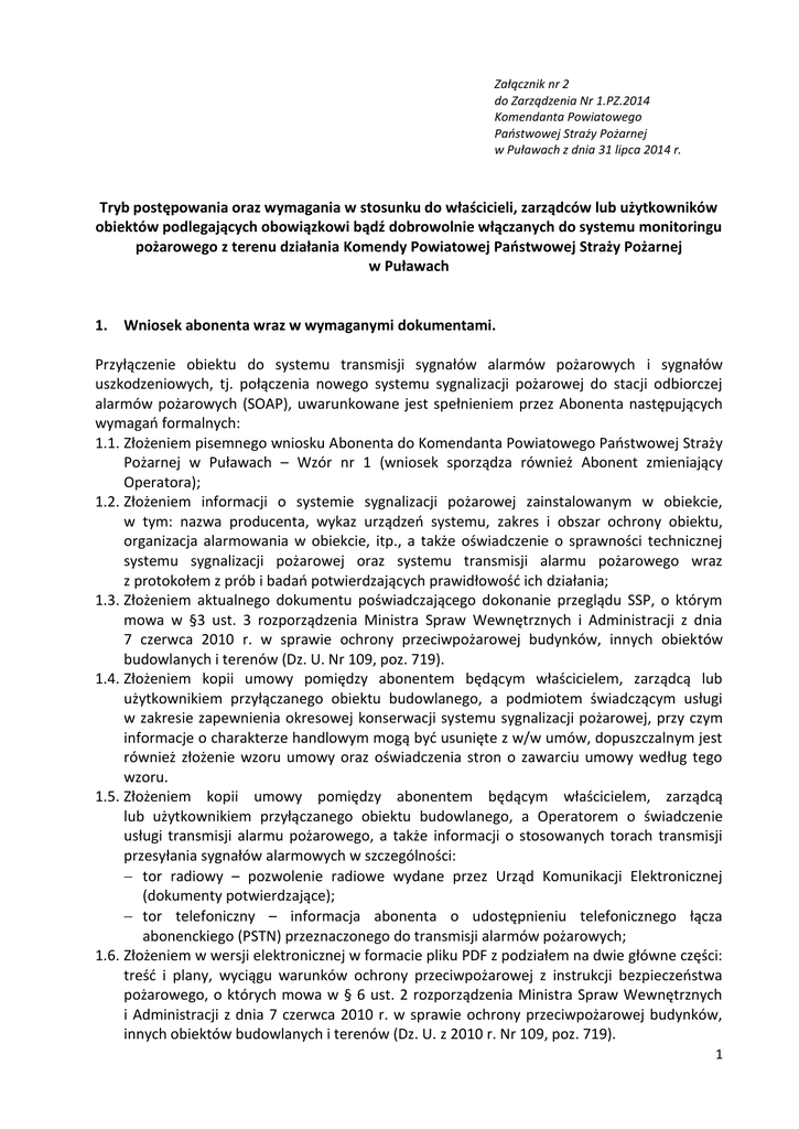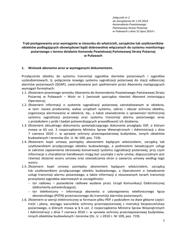Załącznik nr 2 do Zarządzenia Nr 1.PZ.2014 Komendanta Powiatowego Państwowej Straży Pożarnej w Puławach z dnia 31 lipca 2014 r. Tryb postępowania oraz wymagania w stosunku do właścicieli, zarządców lub użytkowników obiektów podlegających obowiązkowi bądź dobrowolnie włączanych do systemu monitoringu pożarowego z terenu działania Komendy Powiatowej Państwowej Straży Pożarnej w Puławach 1. Wniosek abonenta wraz w wymaganymi dokumentami. Przyłączenie obiektu do systemu transmisji sygnałów alarmów pożarowych i sygnałów uszkodzeniowych, tj. połączenia nowego systemu sygnalizacji pożarowej do stacji odbiorczej alarmów pożarowych (SOAP), uwarunkowane jest spełnieniem przez Abonenta następujących wymagań formalnych: 1.1. Złożeniem pisemnego wniosku Abonenta do Komendanta Powiatowego Państwowej Straży Pożarnej w Puławach – Wzór nr 1 (wniosek sporządza również Abonent zmieniający Operatora); 1.2. Złożeniem informacji o systemie sygnalizacji pożarowej zainstalowanym w obiekcie, w tym: nazwa producenta, wykaz urządzeń systemu, zakres i obszar ochrony obiektu, organizacja alarmowania w obiekcie, itp., a także oświadczenie o sprawności technicznej systemu sygnalizacji pożarowej oraz systemu transmisji alarmu pożarowego wraz z protokołem z prób i badań potwierdzających prawidłowość ich działania; 1.3. Złożeniem aktualnego dokumentu poświadczającego dokonanie przeglądu SSP, o którym mowa w §3 ust. 3 rozporządzenia Ministra Spraw Wewnętrznych i Administracji z dnia 7 czerwca 2010 r. w sprawie ochrony przeciwpożarowej budynków, innych obiektów budowlanych i terenów (Dz. U. Nr 109, poz. 719). 1.4. Złożeniem kopii umowy pomiędzy abonentem będącym właścicielem, zarządcą lub użytkownikiem przyłączanego obiektu budowlanego, a podmiotem świadczącym usługi w zakresie zapewnienia okresowej konserwacji systemu sygnalizacji pożarowej, przy czym informacje o charakterze handlowym mogą być usunięte z w/w umów, dopuszczalnym jest również złożenie wzoru umowy oraz oświadczenia stron o zawarciu umowy według tego wzoru. 1.5. Złożeniem kopii umowy pomiędzy abonentem będącym właścicielem, zarządcą lub użytkownikiem przyłączanego obiektu budowlanego, a Operatorem o świadczenie usługi transmisji alarmu pożarowego, a także informacji o stosowanych torach transmisji przesyłania sygnałów alarmowych w szczególności: tor radiowy – pozwolenie radiowe wydane przez Urząd Komunikacji Elektronicznej (dokumenty potwierdzające); tor telefoniczny – informacja abonenta o udostępnieniu telefonicznego łącza abonenckiego (PSTN) przeznaczonego do transmisji alarmów pożarowych; 1.6. Złożeniem w wersji elektronicznej w formacie pliku PDF z podziałem na dwie główne części: treść i plany, wyciągu warunków ochrony przeciwpożarowej z instrukcji bezpieczeństwa pożarowego, o których mowa w § 6 ust. 2 rozporządzenia Ministra Spraw Wewnętrznych i Administracji z dnia 7 czerwca 2010 r. w sprawie ochrony przeciwpożarowej budynków, innych obiektów budowlanych i terenów (Dz. U. z 2010 r. Nr 109, poz. 719). 1 1.7. W uzasadnionych przypadkach Komendant Powiatowy ma prawo zwolnić z obowiązku złożenia dokumentów, o których mowa w punkcie 1.6 na pisemny wniosek abonenta. 1.8. Złożeniem „Karty Informacji o obiekcie w systemie monitorowania alarmów pożarowych” – wzór nr 2. 1.9. Dopuszcza się realizację w/w procedury, związanej ze złożeniem wniosku Abonenta, przez Operatora posiadającego stosowne Pełnomocnictwo abonenta. 2. Rozpatrywanie wniosku abonenta. 2.1. W ramach rozpatrzenia wniosku Abonenta, wyznaczeni funkcjonariusze tut. Komendy, przeprowadzą czynności kontrolno-rozpoznawcze mające na celu stwierdzenie poprawności działania systemu sygnalizacji pożarowej (SSP) oraz systemu transmisji alarmu pożarowego. Abonent zobowiązany jest zapewnić udział w w/w czynnościach przedstawicieli Operatora systemu transmisji alarmu pożarowego oraz podmiotu świadczącego usługi w zakresie konserwacji systemu sygnalizacji pożarowej w chronionym obiekcie. 2.2. Stwierdzenie poprawności działania SSP oraz systemu transmisji alarmów pożarowych odbywa się w drodze testów, zgodnie z poniższym zakresem: 2.2.1. W teście uczestniczą: właściciel lub zarządca obiektu; przedstawiciel operatora systemu posiadający niezbędną wiedzę techniczną na temat systemu (odłączanie torów transmisji); przedstawiciel instalatora SSP; przedstawiciel Komendy Powiatowej PSP. 2.2.2. Test przeprowadza się na każdym obiekcie włączanym do systemu monitoringu pożarowego przez Operatora. 2.2.3. Test polega na: a) wywołaniu alarmu pożarowego w obiekcie przez wzbudzenie np. czujki pożarowej i ROP – próbę uznaje się za zaliczoną jeżeli sygnał zostanie odebrany i potwierdzony przez służbę dyżurną SK KP PSP w Puławach (w uzasadnionych przypadkach dopuszcza się wywołanie sygnału alarmu pożarowego na urządzeniu transmisji sygnałów alarmów pożarowych i uszkodzeniowych); b) próby z ppkt. a) powtórzyć niezależnie dla każdego kanału transmisji wykorzystywanego w obiekcie. Próbę uznaje się za zaliczoną jeżeli sygnał pożarowy zostanie każdorazowo odebrany i potwierdzony przez służbę dyżurną SK KP PSP w Puławach. 2.2.4. Z przeprowadzonego testu sporządza się protokół, który zawiera informację o wyniku poszczególnych prób oraz zapis dotyczący zaliczenia lub niezaliczenia testu. 2.3. Komendant Powiatowy Państwowej Straży Pożarnej, w ramach rozpatrywania wniosku abonenta może żądać od Abonenta i/lub Operatora dodatkowych dokumentów i informacji ważnych z punktu widzenia oceny prowadzonego postępowania. 2.4. W ramach rozpatrywania wniosku Abonenta, sporządza się protokół obejmujący ocenę kompletności oraz zgodności z wymaganiami niniejszych warunków organizacyjno – technicznych, dokumentacji złożonej przez abonenta. 2.5. Po 