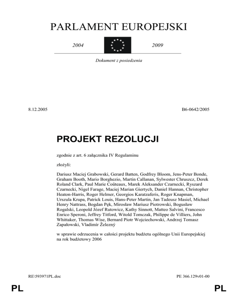 PARLAMENT EUROPEJSKI 2004 2009 Dokument z posiedzenia 8.12.2005 B6-0642/2005 PROJEKT REZOLUCJI zgodnie z art. 6 załącznika IV Regulaminu złożyli: Dariusz Maciej Grabowski, Gerard Batten, Godfrey Bloom, Jens-Peter Bonde, Graham Booth, Mario Borghezio, Martin Callanan, Sylwester Chruszcz, Derek Roland Clark, Paul Marie Coûteaux, Marek Aleksander Czarnecki, Ryszard Czarnecki, Nigel Farage, Maciej Marian Giertych, Daniel Hannan, Christopher Heaton-Harris, Roger Helmer, Georgios Karatzaferis, Roger Knapman, Urszula Krupa, Patrick Louis, Hans-Peter Martin, Jan Tadeusz Masiel, Michael Henry Nattrass, Bogdan Pęk, Mirosław Mariusz Piotrowski, Bogusław Rogalski, Leopold Józef Rutowicz, Kathy Sinnott, Matteo Salvini, Francesco Enrico Speroni, Jeffrey Titford, Witold Tomczak, Philippe de Villiers, John Whittaker, Thomas Wise, Bernard Piotr Wojciechowski, Andrzej Tomasz Zapałowski, Vladimír Železný w sprawie odrzucenia w całości projektu budżetu ogólnego Unii Europejskiej na rok budżetowy 2006 RE\593971PL.doc PL PE 366.129v01-00 PL B6-0642/2005 Rezolucja Parlamentu Europejskiego w sprawie odrzucenia w całości projektu budżetu ogólnego Unii Europejskiej na rok budżetowy 2006 Parlament Europejski, – uwzględniając projekt budżetu na rok 2006 złożony przez Radę, jak i jego drugie czytanie, – uwzględniając pierwsze czytanie budżetu na rok 2006, – uwzględniając ogólny kompromis zawarty w ramach procedury pojednawczej w dniu 24 listopada 2005 r., – uwzględniając art. 69 oraz art. 6 zał. IV Regulaminu, A. mając na uwadze, że wyzwania, przed którymi stoi Europa to: spadające tempo wzrostu gospodarczego, pogarszająca się konkurencyjność przedsiębiorstw przedsiębiorstw amerykańskich i azjatyckich, bezrobocie i powiększające się rozwarstwienie społeczne na biednych i bogatych, brak woli i pomysłu zdynamizowania gospodarczego krajów nowoprzyjętych, budowa Europy "dwóch prędkości", a w konsekwencji utrwalenie zacofania i zależności gospodarczej krajów postkomunistycznych, forsowanie przez przywódców Unii odrzucanego przez większość obywateli pomysłu włączenia Turcji przy jednoczesnym braku woli i wizji pomocy, a w konsekwencji programu przyłączenia Ukrainy, wobec B. mając na uwadze fakt, że budżet na rok 2006 żadnych z wyżej wymienionych kwestii nie próbuje rozwiązać, przeciwnie stanowi kontynuację strategii lat poprzednich, co oznacza, że prowadzi do dalszego spowolnienia wzrostu, utrwalenia negatywnych zjawisk społecznych i gospodarczych. C. mając na uwadze fakt, że struktura wydatków budżetu na rok 2006 jest bez mała identyczna ze strukturą lat poprzednich, co przesądza, że wielkie kwoty zostaną wydatkowane na działy o niskiej efektywności ekonomicznej, a jednocześnie zabraknie środków na badania i rozwój, finansowanie wielkich projektów infrastrukturalnych oraz programy pomocowe dla regionów i państw zacofanych, D. mając na uwadze fakt, że rozmiary budżetu na rok 2006 i jego struktura całkowicie nie uwzględniają faktu rozszerzenia UE o 10 nowych państw i wynikających stąd konsekwencji ekonomicznych i społecznych przejawiających się głównie w różnicach w poziomie rozwoju gospodarczego i konsumpcji, E. mając na uwadze fakt, że projekt budżetu nie uwzględnia także w dostatecznym stopniu faktu, że począwszy od 2007 roku UE zostanie powiększona o dwa kolejne biedne państwa, PE 366.129v01-00 PL europejskich 2/3 RE\593971PL.doc F. mając na uwadze fakt, że budżet na rok 2006 zawiera listę wydatków zbędnych na wszelkiego rodzaju doradztwo, promocje itp., a także zwiększone nakłady na administrację i biurokrację. Miast ułatwiać i upraszczać procedury, przyjęte rozwiązania mechanizmy te utrudniają i komplikują, 1. uznaje projekt budżetu 2006 za zły i sprzeczny z takimi założeniami jak szybki rozwój gospodarczy, pokój społeczny, solidarność dla regionów i państw zacofanych; 2. odrzuca, z powodów przedstawionych powyżej, projekt budżetu ogólnego Unii Europejskiej na rok budżetowy 2006; 3. zobowiązuje swojego Przewodniczącego do przekazania niniejszej rezolucji Radzie oraz Komisji i parlamentom Państw Członkowskich. RE\593971PL.doc 3/3 PE 366.129v01-00 PL