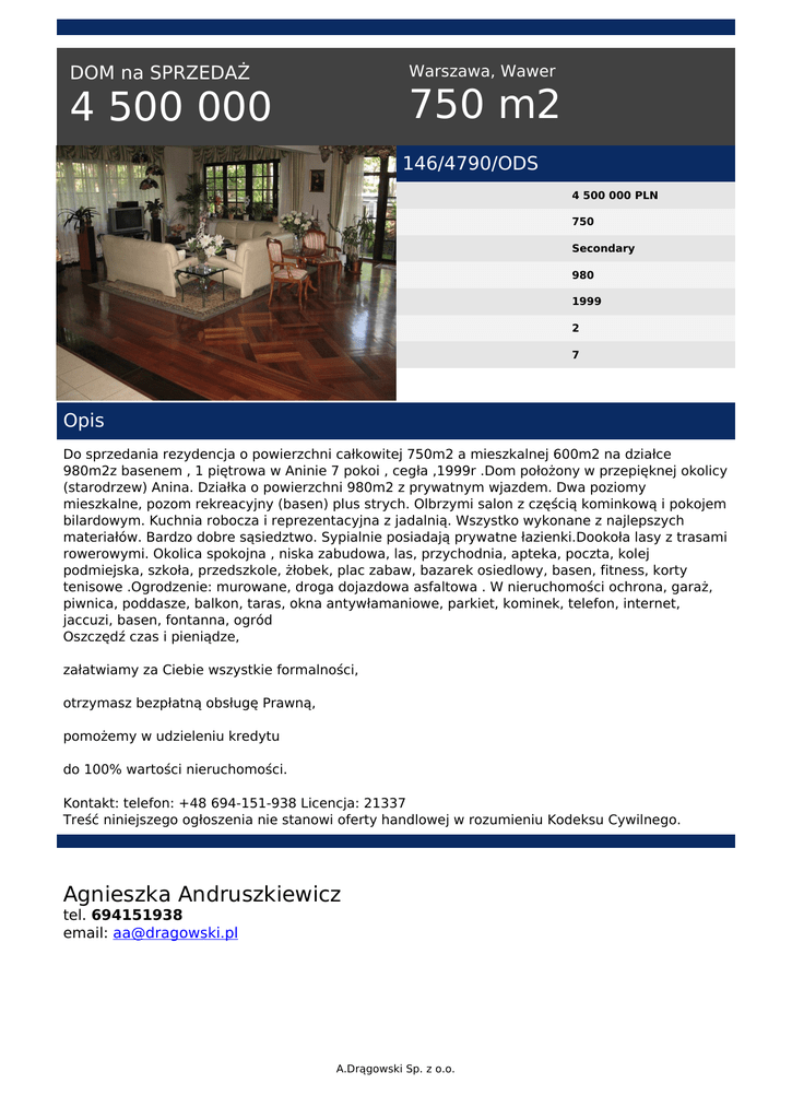 Warszawa, Wawer DOM na SPRZEDAŻ 750 m2 4 500 000 146/4790/ODS 4 500 000 PLN 750 Secondary 980 1999 2 7 Opis Do sprzedania rezydencja o powierzchni całkowitej 750m2 a mieszkalnej 600m2 na działce 980m2z basenem , 1 piętrowa w Aninie 7 pokoi , cegła ,1999r .Dom położony w przepięknej okolicy (starodrzew) Anina. Działka o powierzchni 980m2 z prywatnym wjazdem. Dwa poziomy mieszkalne, pozom rekreacyjny (basen) plus strych. Olbrzymi salon z częścią kominkową i pokojem bilardowym. Kuchnia robocza i reprezentacyjna z jadalnią. Wszystko wykonane z najlepszych materiałów. Bardzo dobre sąsiedztwo. Sypialnie posiadają prywatne łazienki.Dookoła lasy z trasami rowerowymi. Okolica spokojna , niska zabudowa, las, przychodnia, apteka, poczta, kolej podmiejska, szkoła, przedszkole, żłobek, plac zabaw, bazarek osiedlowy, basen, fitness, korty tenisowe .Ogrodzenie: murowane, droga dojazdowa asfaltowa . W nieruchomości ochrona, garaż, piwnica, poddasze, balkon, taras, okna antywłamaniowe, parkiet, kominek, telefon, internet, jaccuzi, basen, fontanna, ogród Oszczędź czas i pieniądze, załatwiamy za Ciebie wszystkie formalności, otrzymasz bezpłatną obsługę Prawną, pomożemy w udzieleniu kredytu do 100% wartości nieruchomości. Kontakt: telefon: +48 694-151-938 Licencja: 21337 Treść niniejszego ogłoszenia nie stanowi oferty handlowej w rozumieniu Kodeksu Cywilnego. Agnieszka Andruszkiewicz tel. 694151938 email: [email protected] A.Drągowski Sp. z o.o. Powered by TCPDF (www.tcpdf.org)