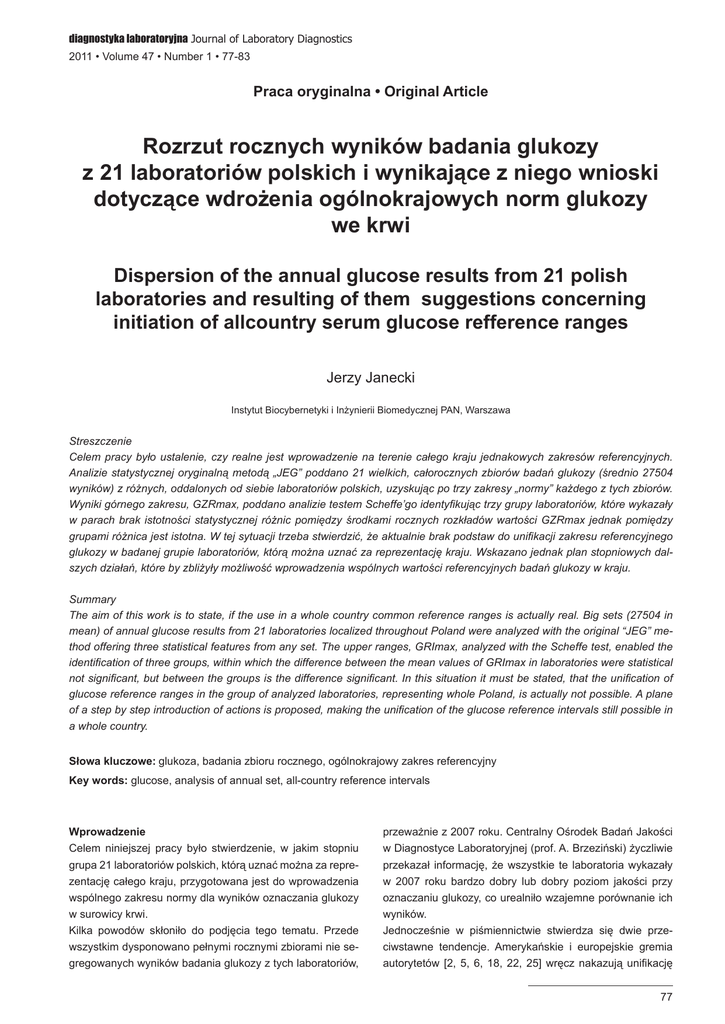 diagnostyka laboratoryjna Journal of Laboratory Diagnostics 2011 • Volume 47 • Number 1 • 77-83 Praca oryginalna • Original Article Rozrzut rocznych wyników badania glukozy z 21 laboratoriów polskich i wynikające z niego wnioski dotyczące wdrożenia ogólnokrajowych norm glukozy we krwi Dispersion of the annual glucose results from 21 polish laboratories and resulting of them suggestions concerning initiation of allcountry serum glucose refference ranges Jerzy Janecki Instytut Biocybernetyki i Inżynierii Biomedycznej PAN, Warszawa Streszczenie Celem pracy było ustalenie, czy realne jest wprowadzenie na terenie całego kraju jednakowych zakresów referencyjnych. Analizie statystycznej oryginalną metodą „JEG” poddano 21 wielkich, całorocznych zbiorów badań glukozy (średnio 27504 wyników) z różnych, oddalonych od siebie laboratoriów polskich, uzyskując po trzy zakresy „normy” każdego z tych zbiorów. Wyniki górnego zakresu, GZRmax, poddano analizie testem Scheffe’go identyfikując trzy grupy laboratoriów, które wykazały w parach brak istotności statystycznej różnic pomiędzy środkami rocznych rozkładów wartości GZRmax jednak pomiędzy grupami różnica jest istotna. W tej sytuacji trzeba stwierdzić, że aktualnie brak podstaw do unifikacji zakresu referencyjnego glukozy w badanej grupie laboratoriów, którą można uznać za reprezentację kraju. Wskazano jednak plan stopniowych dalszych działań, które by zbliżyły możliwość wprowadzenia wspólnych wartości referencyjnych badań glukozy w kraju. Summary The aim of this work is to state, if the use in a whole country common reference ranges is actually real. Big sets (27504 in mean) of annual glucose results from 21 laboratories localized throughout Poland were analyzed with the original “JEG” method offering three statistical features from any set. The upper ranges, GRImax, analyzed with the Scheffe test, enabled the identification of three groups, within which the difference between the mean values of GRImax in laboratories were statistical not significant, but between the groups is the difference significant. In this situation it must be stated, that the unification of glucose reference ranges in the group of analyzed laboratories, representing whole Poland, is actually not possible. A plane of a step by step introduction of actions is proposed, making the unification of the glucose reference intervals still possible in a whole country. Słowa kluczowe:glukoza, badania zbioru rocznego, ogólnokrajowy zakres referencyjny Key words:glucose, analysis of annual set, all-country reference intervals Wprowadzenie Celem niniejszej pracy było stwierdzenie, w jakim stopniu grupa 21 laboratoriów polskich, którą uznać można za reprezentację całego kraju, przygotowana jest do wprowadzenia wspólnego zakresu normy dla wyników oznaczania glukozy w surowicy krwi. Kilka powodów skłoniło do podjęcia tego tematu. Przede wszystkim dysponowano pełnymi rocznymi zbiorami nie segregowanych wyników badania glukozy z tych laboratoriów, przeważnie z 2007 roku. Centralny Ośrodek Badań Jakości w Diagnostyce Laboratoryjnej (prof. A. Brzeziński) życzliwie przekazał informację, że wszystkie te laboratoria wykazały w 2007 roku bardzo dobry lub dobry poziom jakości przy oznaczaniu glukozy, co urealniło wzajemne porównanie ich wyników. Jednocześnie w piśmiennictwie stwierdza się dwie przeciwstawne tendencje. Amerykańskie i europejskie gremia autorytetów [2, 5, 6, 18, 22, 25] wręcz nakazują unifikację 77 Rozrzut rocznych wyników badania glukozy z 21 laboratoriów polskich i wynikające z niego wnioski ... zakresu „normy”, zwłaszcza w zakresie glukozy. Z drugiej strony od wielu lat utrzymuje się pogląd, że każde laboratorium powinno opierać się przede wszystkim na odpowiednio opracowanych własnych zakresach referencyjnych [1, 8, 10, 13, 19, 20, 21,24, 26] lepiej dostosowanych do lokalnych warunków. Dyskusji podlega dobór i kryteria oceny zdrowia osób, których wyniki stanowiłyby podstawę zakresu referencyjnego. Wątpliwości budzi także koszt oraz przesłanki etyczne oparcia tych „norm” na badaniu „zdrowych” osób. Nowe światło na ten problem rzucają prace nad tym tematem, oparte na wieloletnich badaniach metodą „JEG” opracowaną w naszym Instytucie Biocybernetyki i Inżynierii Biomedycznej PAN w Warszawie [9, 11-16]. Materiał i metody Współpracujące laboratoria, przeważnie prywatne, rzadziej regionalne lub specjalistyczne, reprezentowały, jak to wynika z ryc.1 i z tabeli I i II, rozsiane po Kraju regiony, różną wielkość ośrodka, posługiwały się standardowymi, ale nie jednakowymi analizatorami i zestawami odczynników. Laboratoria dostarczyły wszystkie, bez jakiejkolwiek selekcji, wyniki badań glukozy w surowicy, wykonane w 2007 roku. Średnio badań było 27504, ale z rozrzutem od 2329 do 111390. Każdy zbiór zawierał także daty badań, wiek i płeć pacjentów, nie zawierał natomiast rozpoznań ani innych informacji klinicznych. Zbiory otrzymywano przesyłką internetową w Pracowni Informatyki Klinicznej IBIB PAN w Warszawie. Każdy zbiór, podzielony na dzienne, tygodniowe lub miesięczne porcje (zależnie od dostarczonej liczebności zbioru), podlegał opracowaniu zgodnie z opublikowaną wcześniej Kartą Metody [16]. Żaden ze zbiorów nie budził wątpliwości jakościowej, chociaż procentowe współczynniki zmienności odtwarzalności wartości górnej (GZRmax) wa- Rycina 1. Mapka Polski z lokalizacją 21 współpracujących laboratoriów. 78 hały się od 1,913 do 6,145 co jeszcze ciągle było korzystniejsze od pożądanego TEA% dla glukozy, równego 7,6 [ 7]. Analizę statystyczną wszystkich porcji wyników (najczęściej tygodniowych) za zbioru rocznego przeprowadzono metodą „JEG” opracowaną przez Janeckiego [11-16] i Hosera [9] w IBIB PAN w Warszawie i zweryfikowaną w latach 1997Tabela I. Alfabetyczny