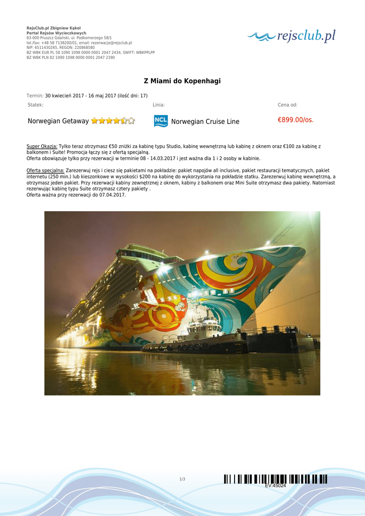 RejsClub.pl Zbigniew Kąkol Portal Rejsów Wycieczkowych 83-000 Pruszcz Gdański, ul. Podkomorzego 58/1 tel./fax: +48 58 7138200/01, email: [email protected] NIP: 6511430265, REGON: 220868580 BZ WBK EUR PL 58 1090 1098 0000 0001 2047 2434, SWIFT: WBKPPLPP BZ WBK PLN 82 1090 1098 0000 0001 2047 2390 Z Miami do Kopenhagi Termin: 30 kwiecień 2017 - 16 maj 2017 (ilość dni: 17) Statek: Norwegian Getaway Linia: Cena od: Norwegian Cruise Line €899.00/os. Super Okazja: Tylko teraz otrzymasz €50 zniżki za kabinę typu Studio, kabinę wewnętrzną lub kabinę z oknem oraz €100 za kabinę z balkonem i Suite! Promocja łączy się z ofertą specjalną. Oferta obowiązuje tylko przy rezerwacji w terminie 08 - 14.03.2017 i jest ważna dla 1 i 2 osoby w kabinie. Oferta specjalna: Zarezerwuj rejs i ciesz się pakietami na pokładzie: pakiet napojów all inclusive, pakiet restauracji tematycznych, pakiet internetu (250 min.) lub kieszonkowe w wysokości $200 na kabinę do wykorzystania na pokładzie statku. Zarezerwuj kabinę wewnętrzną, a otrzymasz jeden pakiet. Przy rezerwacji kabiny zewnętrznej z oknem, kabiny z balkonem oraz Mini Suite otrzymasz dwa pakiety. Natomiast rezerwując kabinę typu Suite otrzymasz cztery pakiety . Oferta ważna przy rezerwacji do 07.04.2017. 1/3 EV:45024 RejsClub.pl Zbigniew Kąkol Portal Rejsów Wycieczkowych 83-000 Pruszcz Gdański, ul. Podkomorzego 58/1 tel./fax: +48 58 7138200/01, email: [email protected] NIP: 6511430265, REGON: 220868580 BZ WBK EUR PL 58 1090 1098 0000 0001 2047 2434, SWIFT: WBKPPLPP BZ WBK PLN 82 1090 1098 0000 0001 2047 2390 TRASA REJSU dzień 1 Data Port Wpłynięcie Wypłynięcie niedziela 30.04.2017 Miami, Floryda --:-- 16:00 Stany Zjednoczone dzień 2 poniedziałek 01.05.2017 Dzień na morzu --:-- --:-- dzień 3 wtorek 02.05.2017 Dzień na morzu --:-- --:-- dzień 4 środa 03.05.2017 Dzień na morzu --:-- --:-- dzień 5 czwartek 04.05.2017 Dzień na morzu --:-- --:-- dzień 6 piątek 05.05.2017 Dzień na morzu --:-- --:-- dzień 7 sobota 06.05.2017 Dzień na morzu --:-- --:-- dzień 8 niedziela 07.05.2017 Ponta Delgada, Azory 08:00 17:00 dzień 9 poniedziałek 08.05.2017 Dzień na morzu --:-- --:-- dzień 10 wtorek 09.05.2017 Dzień na morzu --:-- --:-- dzień 11 środa 10.05.2017 Dzień na morzu --:-- --:-- dzień 12 czwartek 11.05.2017 Brest 08:00 16:00 Francja piątek 12.05.2017 08:00 20:00 Wielka Brytania 10:00 19:00 dzień 13 dzień 14 sobota 13.05.2017 Portugalia Southampton Zeebrugge, Bruksela Belgia 2/3 EV:45024 Legenda RejsClub.pl Zbigniew Kąkol Portal Rejsów Wycieczkowych 83-000 Pruszcz Gdański, ul. Podkomorzego 58/1 tel./fax: +48 58 7138200/01, email: [email protected] NIP: 6511430265, REGON: 220868580 BZ WBK EUR PL 58 1090 1098 0000 0001 2047 2434, SWIFT: WBKPPLPP BZ WBK PLN 82 1090 1098 0000 0001 2047 2390 Data Port Wpłynięcie Wypłynięcie niedziela 14.05.2017 Rotterdam 08:00 18:00 dzień 16 poniedziałek 15.05.2017 Dzień na morzu --:-- --:-- dzień 17 wtorek 16.05.2017 Kopenhaga 08:00 --:-- dzień 15 Legenda Holandia Dania CENNIK Cena katalogowa Kabina wewnętrzna od €899.00 Kabina zewnętrzna z oknem od €1 079.00 Kabina zewnętrzna z balkonem od €1 199.00 Suite (apartament) od €1 429.00 Kabina jednoosobowa na zapytanie 3 i 4 osoba dorosła w kabinie na zapytanie dziecko do 17 lat jako 3 i 4 osoba w kabinie na zapytanie Opłaty portowe Cena promocyjna w cenie Uwaga! Ceny za osobę w kabinie dwuosobowej. Cena zawiera: zakwaterowanie w kabinie wybranej kategorii; wyżywienie - 3 główne posiłki, przekąski między posiłkami, bufet lub przekąski o północy; napoje serwowane do śniadania i w bufetach samoobsługowych; serwis bagażowy podczas wejścia i zejścia ze statku; serwis kabinowy; korzystanie ze wszystkich urządzeń sportowo - rekreacyjnych znajdujących się na pokładzie statku (basen, jacuzzi, sala fitness, itp.); udział we wszystkich imprezach organizowanych na statku (przedstawienia w teatrze, koncerty, programy animacyjne itp.). Cena nie zawiera: kosztów dojazdu do portu; ewentualnych noclegów w hotelu przed/po rejsie i transferów; wycieczek fakultatywnych w trakcie rejsu; korzystania z barów, mini baru w kabinie oraz napojów zamawianych w restauracji; korzystania z punktów usługowych (fryzjer, pralnia, fotograf, salon piękności i odnowy biologicznej, internet) i wydatków osobistych; napiwków dla obsługi na statku (kwota uzależniona od długości rejsu); ubezpieczenia KL, NNW i bagaż, kosztów wiz (tam gdzie wymagane). 3/3 EV:45024