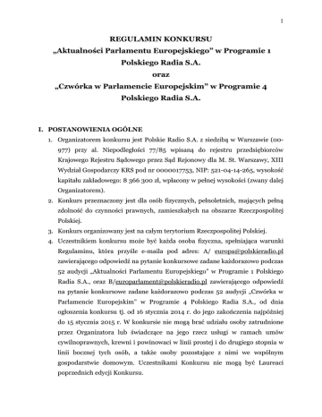 1 REGULAMIN KONKURSU „Aktualności Parlamentu Europejskiego” w Programie 1 Polskiego Radia S.A. oraz „Czwórka w Parlamencie Europejskim” w Programie 4 Polskiego Radia S.A. I. POSTANOWIENIA OGÓLNE 1. Organizatorem konkursu jest Polskie Radio S.A. z siedzibą w Warszawie (00977) przy al. Niepodległości 77/85 wpisaną do rejestru przedsiębiorców Krajowego Rejestru Sądowego przez Sąd Rejonowy dla M. St. Warszawy, XIII Wydział Gospodarczy KRS pod nr 0000017753, NIP: 521-04-14-265, wysokość kapitału zakładowego: 8 366 300 zł, wpłacony w pełnej wysokości (zwany dalej Organizatorem). 2. Konkurs przeznaczony jest dla osób fizycznych, pełnoletnich, mających pełną zdolność do czynności prawnych, zamieszkałych na obszarze Rzeczpospolitej Polskiej. 3. Konkurs organizowany jest na całym terytorium Rzeczpospolitej Polskiej. 4. Uczestnikiem konkursu może być każda osoba fizyczna, spełniająca warunki Regulaminu, która przyśle e-maila pod adres: A/ [email protected] zawierającego odpowiedź na pytanie konkursowe zadane każdorazowo podczas 52 audycji „Aktualności Parlamentu Europejskiego” w Programie 1 Polskiego Radia S.A., oraz B/[email protected] zawierającego odpowiedź na pytanie konkursowe zadane każdorazowo podczas 52 audycji „Czwórka w Parlamencie Europejskim” w Programie 4 Polskiego Radia S.A., od dnia ogłoszenia konkursu tj. od 16 stycznia 2014 r. do jego zakończenia najpóźniej do 15 stycznia 2015 r. W konkursie nie mogą brać udziału osoby zatrudnione przez Organizatora lub świadczące na jego rzecz usługi w ramach umów cywilnoprawnych, krewni i powinowaci w linii prostej i do drugiego stopnia w linii bocznej tych osób, a także osoby pozostające z nimi we wspólnym gospodarstwie domowym. Uczestnikami Konkursu nie mogą być Laureaci poprzednich edycji Konkursu. 2 5. Kontrola poprawności prowadzenia konkursu i jego zgodności z postanowieniami regulaminu spoczywa na trzyosobowej komisji konkursowej, złożonej z osób wyznaczonych przez koordynatorów konkursu z Programu 1 Polskiego Radia S.A., Programu 4 Polskiego Radia SA a także z Portalu polskieradio.pl Decyzje ww. komisja podejmuje zwykłą większością głosów. Każdy z członków komisji dysponuje jednym głosem. 6. Regulamin znajduje się na stronie www.polskieradio.pl/jedynka oraz na stronie www.polskieradio.pl/czworka, a także na stronie www.polskieradio.pl/europarlament. II. ZASADY KONKURSU 1. Konkurs odbędzie się w okresie od 16 stycznia 2014 r. do 15 stycznia 2015 r. (raz w tygodniu – w czwartki o godz. 8.50 w Programie 1 Polskiego Radia SA oraz o godz. 9.04 w Programie 4 Polskiego Radia SA, natomiast podczas Świąt wypadających w czwartki dzień później - w piątki, z wyjątkiem poniedziałku 22 grudnia 2014 r. , o tej samej porze). Zadaniem uczestnika jest przesłanie maila pod adres: A/ [email protected] zawierającego odpowiedź na pytanie konkursowe zadane każdorazowo podczas 52 audycji „Aktualności Parlamentu Europejskiego” w Programie 1 Polskiego Radia SA, oraz B/ [email protected] zawierającego odpowiedź na pytanie konkursowe zadane każdorazowo podczas 52 audycji „Czwórka w Parlamencie Europejskim” w Programie 4 Polskiego Radia SA. Odpowiedzi będzie można przesyłać do końca dnia, w którym ogłoszono pytanie konkursowe, a informacja o rozstrzygnięciu konkursu zostanie podana podczas następnej audycji konkursowej, z wyjątkiem ostatniej 52 audycji, kiedy informacja podana zostanie po 24 godzinach na stronie www.polskieradio.pl/europarlament Na tej stronie będzie ukazywać się krzyżówka zawierająca już odgadnięte hasła i litery ułatwiające podanie prawidłowej odpowiedzi na zadane danego dnia pytanie konkursowe. 2. Trzyosobowa komisja konkursowa spośród nadesłanych maili wybierze te, które zawierają prawidłowe odpowiedzi na zadane pytanie konkursowe. Następnie wskaże e-mail, który wpłynął pierwszy na: A/ skrzynkę pocztową [email protected] i wyłoni zwycięzcę cotygodniowego konkursu 3 „Aktualności Parlamentu Europejskiego” w Programie 1 Polskiego Radia S.A. oraz B/ skrzynkę pocztową [email protected] i wyłoni zwycięzcę cotygodniowego konkursu „Czwórka w Parlamencie Europejskim” w Programie 4 Polskiego Radia S.A. Wszystkie prawidłowe odpowiedzi wezmą udział w drugiej części konkursu. 3. Wysłanie e-maila z prawidłową odpowiedzią konkursową, jest równoznaczne ze zgłoszeniem przez uczestnika chęci wzięcia udziału w Konkursie, akceptacją postanowień niniejszego regulaminu oraz wyrażeniem zgody na ewentualną publikację jego danych osobowych (imienia, nazwiska i miejsca zamieszkania) na stronach Polskiego Radia S.A. oraz na antenach Programu 1 i 4 Polskiego Radia SA 4. Jeden e-mail jest traktowany jako jedno zgłoszenie do Konkursu. III. NAGRODY 1. W pierwszym etapie konkursu (cotygodniowe pytanie konkursowe) Organizator przewiduje przyznanie nagród rzeczowych w postaci drobnych upominków od Programu 1 i 4 Polskiego Radia SA. 2. Organizator wspólnie z Biurem Informacyjnym Parlamentu Europejskiego w Polsce przewiduje w drugim etapie konkursu przyznanie jednej głównej nagrody w postaci trzydniowego wyjazdu do brukselskiej siedziby Parlamentu Europejskiego. IV. SPOSÓB WYŁANIANIA ZWYCIĘZCÓW 1. Nagrody: rzeczowe i główną wygrają uczestnicy konkursu, którzy spełnią wszystkie warunki opisane w niniejszym Regulaminie. 2. Laureatem nagrody głównej zostanie osoba, która przesłała najwięcej prawidłowych odpowiedzi w trakcie trwania całego konkursu. V. WYDANIE NAGRÓD 1. Nagroda w postaci trzydniowego wyjazdu Laureata konkursu do brukselskiej siedziby Parlamentu Europejskiego zostanie zrealizowana najpóźniej w ciągu 30 dni od zakończenia konkursu. 4 2. Realizacja nagrody odbędzie się po odprowadzeniu 10% wartości nagrody przez Laureata, na rachunek bankowy podany przez Organizatora Konkursu. Niewpłacenie przez Laureata kwoty podatku od nagrody w terminie 