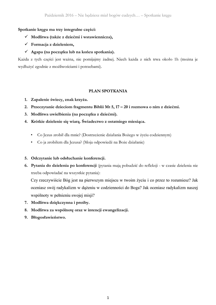 Październik 2016 – Nie będziesz miał bogów cudzych… – Spotkanie kręgu Spotkanie kręgu ma trzy integralne części: Modlitwa (także z dziećmi i wstawiennicza), Formacja z dzieleniem, Agapa (na początku lub na końcu spotkania). Każda z tych części jest ważna, nie pomijajmy żadnej. Niech każda z nich trwa około 1h (można je wydłużyć zgodnie z możliwościami i potrzebami). PLAN SPOTKANIA 1. Zapalenie świecy, znak krzyża. 2. Przeczytanie dzieciom fragmentu Biblii Mt 5, 17 – 20 i rozmowa o nim z dziećmi. 3. Modlitwa uwielbienia (na początku z dziećmi). 4. Krótkie dzielenie się wiarą. Świadectwo z ostatniego miesiąca. • Co Jezus zrobił dla mnie? (Dostrzeżenie działania Bożego w życiu codziennym) • Co ja zrobiłem dla Jezusa? (Moja odpowiedź na Boże działanie) 5. Odczytanie lub odsłuchanie konferencji. 6. Pytania do dzielenia po konferencji (pytania mają pobudzić do refleksji - w czasie dzielenia nie trzeba odpowiadać na wszystkie pytania): Czy rzeczywiście Bóg jest na pierwszym miejscu w twoim życiu i co przez to rozumiesz? Jak oceniasz swój radykalizm w dążeniu w codzienności do Boga? Jak oceniasz radykalizm naszej wspólnoty w pełnieniu swojej misji? 7. Modlitwa dziękczynna i prośby. 8. Modlitwa za wspólnotę oraz w intencji ewangelizacji. 9. Błogosławieństwo. 1 Październik 2016 – Nie będziesz miał bogów cudzych… – Spotkanie kręgu PAŹDZIERNIK 2016. KONFERENCJA: Bóg jest pierwszy 1. „Jeśli Mnie miłujecie, będziecie zachowywać moje przykazania” J 14,15 Są ludzie, którzy mówią, że przykazania ich ograniczają, godzą w ich wolność. Tyle nakazów i zakazów można znaleźć w Biblii. Przecież mamy być wolni – wolność jest najważniejsza. Wolność czynią wartością nadrzędną. Jezus mówi - ci, którzy Mnie miłują zachowują przykazania, żyją według nich. Miłość i przykazania, prawo. W tym roku będziemy na spotkaniach domowych rozważali i zastanawiali się nad Dekalogiem, czyli nad przykazaniami Bożymi. Najpierw trzeba uświadomić sobie, że Bóg jest dobry, kocha nas i nie chce naszej zguby. Grzech jest złem – godzi w nasze życie, niszczy je. Tam gdzie grzech – tam śmierć. Bóg wyprowadził Izraelitów z Egiptu i zawarł z nimi przymierze. Przymierze jest więzią między Bogiem a narodem. Izraelici z woli Boga stali się Jego szczególną własnością, narodem wybranym. Bóg wziął Izraelitów w swoje ręce – błogosławił im i troszczył się o nich – szczególnie ich umiłował, stali się narodem wybranym spośród wszystkich narodów. Ale przymierze to umowa obustronna. Izrael został zobowiązany do relacji z Bogiem opartej na wierze, zaufaniu, miłości. Ta relacja wyraziła się w Dekalogu, który Izrael otrzymał od Boga jako przykazania według których ma żyć. Dekalog to rodzaj kodeksu, drogowskazów, aby według nich żyć. Przykazania Boże są dla naszego dobra. Izraelici otrzymali Dekalog jako drogowskazy na pustyni, przez którą podążali do Ziemi Obiecanej, ale nawet w Ziemi Obiecanej przykazania nie straciły aktualności. Gdy Jezus przyszedł sam mówi, że nie przyszedł znieść prawo, ale je wypełnić. Wypełnić tzn. ukazać pełny sens, znaczenie dla naszego życia. Jezus zapytany, które przykazanie jest najważniejsze - powiedział o dwóch, które nie były zapisane w Dekalogu. Znajdowały się w dwóch różnych księgach Starego Testamentu – przykazanie miłości Boga i bliźniego. Te dwa przykazania streszczają w sobie cały Dekalog. Pierwsze trzy przykazania Dekalogu odnoszą się do Boga, następne siedem do człowieka, do bliźniego. W naszej formacji duchowej, we Wspólnocie pochylimy się nad Dekalogiem w taki sposób, aby odkryć i uświadomić sobie, że Prawo Boże nie ogranicza nas, nie pozbawią nas czegoś, co uważamy, że jest konieczne dla naszego życia, ale będziemy próbowali rozpoznać w jaki sposób Dekalog jest prawem miłości, jak drogowskazem ku wolności. Św. Jakub Prawo Boże nazywa Prawem wolności. Pisze tak: ”Mówcie i czyńcie tak, jak ludzie, którzy będą sądzeni na podstawie Prawa wolności.” Jk 2,12. Tak jest, gdy z pomocą Ducha Świętego odkrywamy całą prawdę o Dekalogu. Jezus w Kazaniu na Górze i wielu innych miejscach wyjaśnia, interpretuje Dekalog. W KKK trzecia część jest zatytułowana – „Życie w Chrystusie” – i tu pierwszy dział to: „Powołanie człowieka i życie w Duchu Świętym”, natomiast drugi to „Dziesięć przykazań”. Będziemy się w naszych spotkaniach odwoływali do treści KKK całej tej część. Szczególnie dział drugi, który interpretuje i wyjaśnia przykazania Boże. Będę prosił was, abyście mieli KKK i czytali poszczególne części, aby głębiej wejść w tematykę. Tak więc poza konferencją, która nie może być zbyt długa, trzeba będzie wcześniej przeczytać sobie tekst, to co KKK dotyczący danego przykazania, aby móc potem na spotkaniu, po wysłuchaniu konferencji wejść w pogłębienie tematyki danego przykazania w zastosowaniu praktycznym. Formacja bowiem nie polega tylko na teoretycznych rozważaniach, ale ma mieć odniesienie do naszego życia, mamy to przenieść w naszą codzienność. 2. Co by było, gdyby nie było Dekalogu? Katastrofa, po prostu nas by nie było. Wyobraź sobie: masz samochód i chcesz z Warszawy jechać do Krakowa, nie znasz przepisów drogowych, bo po prostu ich nie ma, co więcej na drogach nie ma żadnych znaków ani drogowskazów ostrzegających o niebezpiecznych zakrętach, zwężeniach dróg itd. Są drogi, ale nie wiesz, która prowadzi do Krakowa, 2 Październik 2016 – Nie będziesz miał bogów cudzych… – Spotkanie kręgu nie wiesz jaką szybkość możesz rozwinąć, jakie są zakazy. Wydaje się to absurdalne, nie dojechałbyś do Krakowa. Gdyby w życiu nie było żadnych nakazów i zakazów życie byłoby niemożliwe, tak więc Prawo jest konieczne w życiu człowieka. 