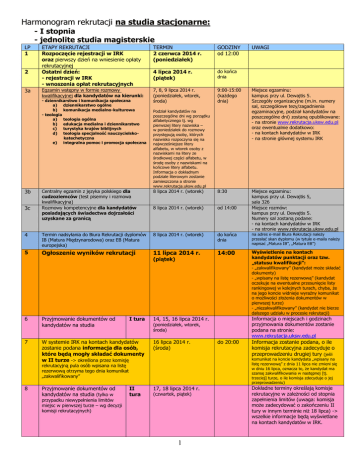 Harmonogram rekrutacji na studia stacjonarne: - I stopnia - jednolite studia magisterskie LP 1 2 3a ETAPY REKRUTACJI Rozpoczęcie rejestracji w IRK oraz pierwszy dzień na wniesienie opłaty rekrutacyjnej Ostatni dzień: - rejestracji w IRK - wnoszenia opłat rekrutacyjnych TERMIN 2 czerwca 2014 r. (poniedziałek) GODZINY od 12:00 4 lipca 2014 r. (piątek) do końca dnia Egzamin wstępny w formie rozmowy kwalifikacyjnej dla kandydatów na kierunki: 7, 8, 9 lipca 2014 r. (poniedziałek, wtorek, środa) 9:00-15:00 (każdego dnia) Miejsce egzaminu: kampus przy ul. Dewajtis 5. Szczegóły organizacyjne (m.in. numery sal, szczegółowe tezy/zagadnienia egzaminacyjne, podział kandydatów na poszczególne dni) zostaną opublikowane: - na stronie www.rekrutacja.uksw.edu.pl oraz ewentualnie dodatkowo: - na kontach kandydatów w IRK - na stronie głównej systemu IRK Miejsce egzaminu: kampus przy ul. Dewajtis 5, sala 326 Miejsce rozmów: kampus przy ul. Dewajtis 5. Numery sal zostaną podane: - na kontach kandydatów w IRK - na stronie www.rekrutacja.uksw.edu.pl - dziennikarstwo i komunikacja społeczna a) dziennikarstwo ogólne b) komunikacja medialno-kulturowa - teologia a) teologia ogólna b) edukacja medialna i dziennikarstwo c) turystyka krajów biblijnych d) teologia specjalność nauczycielskokatechetyczna e) integralna pomoc i promocja społeczna Podział kandydatów na poszczególne dni wg porządku alfabetycznego tj. wg pierwszej litery nazwiska – w poniedziałek do rozmowy przystępują osoby, których nazwisko rozpoczyna się na najwcześniejsze litery alfabetu, w wtorek osoby z nazwiskami na litery ze środkowej części alfabetu, w środę osoby z nazwiskami na końcowe litery alfabetu. Informacja o dokładnym podziale literowym zostanie zamieszczona a stronie www.rekrutacja.uksw.edu.pl UWAGI Centralny egzamin z języka polskiego dla cudzoziemców (test pisemny i rozmowa kwalifikacyjna) Rozmowy kompetencyjne dla kandydatów posiadających świadectwa dojrzałości uzyskane za granicą 8 lipca 2014 r. (wtorek) 8:30 8 lipca 2014 r. (wtorek) od 14:00 4 Termin nadsyłania do Biura Rekrutacji dyplomów IB (Matura Międzynarodowa) oraz EB (Matura europejska) 8 lipca 2014 r. (wtorek) do końca dnia na adres e-mail Biura Rekrutacji należy przesłać skan dyplomu (w tytule e-maila należy napisać „Matura IB”, „Matura EB”) 5 Ogłoszenie wyników rekrutacji 11 lipca 2014 r. 14:00 Wyświetlenie na kontach kandydatów punktacji oraz tzw. „statusu kwalifikacji”: 3b 3c (piątek) - „zakwalifikowany” (kandydat może składać dokumenty) - „wpisany na listę rezerwową” (kandydat oczekuje na ewentualne przesunięcie listy rankingowej w kolejnych turach, chyba, że na jego koncie widnieje wyraźny komunikat o możliwości złożenia dokumentów w pierwszej turze) - „niezakwalifikowany” (kandydat nie bierze dalszego udziału w procesie rekrutacji) 6 Przyjmowanie dokumentów od kandydatów na studia I tura 7 W systemie IRK na kontach kandydatów zostanie podana informacja dla osób, które będą mogły składać dokumenty w II turze -> określona przez komisję 16 lipca 2014 r. (środa) Przyjmowanie dokumentów od kandydatów na studia (tylko w 17, 18 lipca 2014 r. (poniedziałek, wtorek, środa) przypadku niewypełnienia limitów miejsc w pierwszej turze – wg decyzji komisji rekrutacyjnych) II tura do 20:00 Informacja zostanie podana, o ile komisja rekrutacyjna zadecyduje o przeprowadzeniu drugiej tury (jeśli komunikat na koncie kandydata „wpisany na listę rezerwową” z dnia 11 lipca nie zmieni się w dniu 16 lipca, oznacza to, że kandydat ma szansę zakwalifikowania w następnej [tj. trzeciej] turze, o ile komisja zdecyduje o jej przeprowadzeniu) rekrutacyjną pula osób wpisana na listę rezerwową otrzyma tego dnia komunikat „zakwalifikowany” 8 Informacja o miejscach i godzinach przyjmowania dokumentów zostanie podana na stronie: www.rekrutacja.uksw.edu.pl 14, 15, 16 lipca 2014 r. (czwartek, piątek) 1 Dokładne terminy określają komisje rekrutacyjne w zależności od stopnia zapełnienia limitów (uwaga: komisja może zadecydować o zakończeniu II tury w innym terminie niż 18 lipca) -> wszelkie informacje będą wyświetlane na kontach kandydatów w IRK. 9 W systemie IRK na kontach kandydatów zostanie podana informacja dla osób, które będą mogły składać dokumenty w III turze -> określona przez komisję 18 lipca 2014 r. (piątek) Przyjmowanie dokumentów od kandydatów na studia (tylko w 21, 22 lipca 2014 r. (poniedziałek, wtorek) do 20:00 komunikat na koncie kandydata „wpisany na listę rezerwową” z dnia 11 lipca nie zmieni się w dniu 18 lipca, oznacza to, że kandydat ma szansę zakwalifikowania w następnej [tj. czwartej] turze, o ile komisja zdecyduje o jej przeprowadzeniu) rekrutacyjną pula osób wpisana na listę rezerwową otrzyma tego dnia komunikat „zakwalifikowany” 10 przypadku niewypełnienia limitów miejsc w poprzednich turach – wg decyzji komisji rekrutacyjnych) III tura Informacja zostanie podana, o ile komisja rekrutacyjna zadecyduje o przeprowadzeniu trzeciej tury (jeśli Dokładne terminy określają komisje rekrutacyjne w zależności od stopnia zapełnienia limitów (uwaga: komisja może zadecydować o zakończeniu III tury w innym terminie niż 22 lipca) -> wszelkie informacje będą wyświetlane na kontach kandydatów w IRK UWAGA: Komisje mogą zadecydować o przeprowadzeniu kolejnych tur (IV, V) w dniach: 23, 24, 25 lipca (śr.-pt.) oraz 28, 29, 30 lipca (pon.-śr.), o czym poinformują kandydatów na ich kontach w IRK w polu „UWAGI” w zakładce „wyniki rekrutacji”. REKRUTACJA DODATKOWA 11 Rozpoczęcie dodatkowej rejestracji na studia w IRK na kierunkach, na których nie zostały wypełnione limity 6 sierpnia 2014 r. (środa) od 12:00 12 Ostatni dzień: - rejestracji dodatkowej w IRK - wnoszenia opłat rekrutacyjnych w ramach rejestracji dodatkowej Posiedzenie odwoławcze Uczelnianej Komisji Rekrutac
