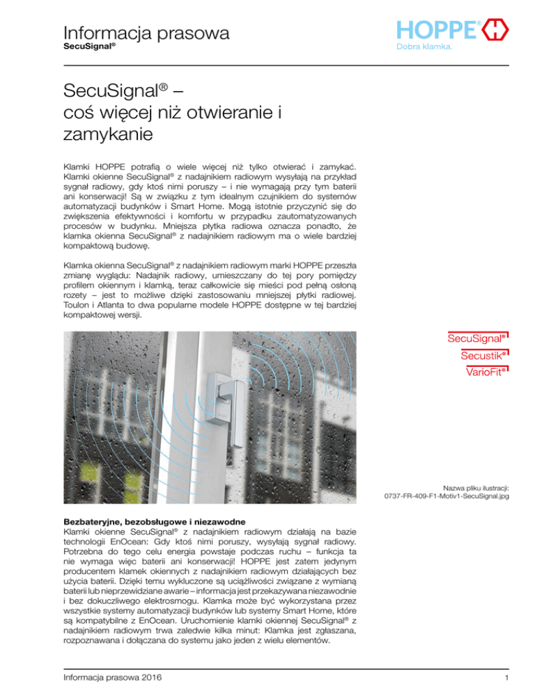 Informacja prasowa SecuSignal® SecuSignal® – coś więcej niż otwieranie i zamykanie Klamki HOPPE potrafią o wiele więcej niż tylko otwierać i zamykać. Klamki okienne SecuSignal® z nadajnikiem radiowym wysyłają na przykład sygnał radiowy, gdy ktoś nimi poruszy – i nie wymagają przy tym baterii ani konserwacji! Są w związku z tym idealnym czujnikiem do systemów automatyzacji budynków i Smart Home. Mogą istotnie przyczynić się do zwiększenia efektywności i komfortu w przypadku zautomatyzowanych procesów w budynku. Mniejsza płytka radiowa oznacza ponadto, że klamka okienna SecuSignal® z nadajnikiem radiowym ma o wiele bardziej kompaktową budowę. Klamka okienna SecuSignal® z nadajnikiem radiowym marki HOPPE przeszła zmianę wyglądu: Nadajnik radiowy, umieszczany do tej pory pomiędzy profilem okiennym i klamką, teraz całkowicie się mieści pod pełną osłoną rozety – jest to możliwe dzięki zastosowaniu mniejszej płytki radiowej. Toulon i Atlanta to dwa popularne modele HOPPE dostępne w tej bardziej kompaktowej wersji. Nazwa pliku ilustracji: 0737-FR-409-F1-Motiv1-SecuSignal.jpg Bezbateryjne, bezobsługowe i niezawodne Klamki okienne SecuSignal® z nadajnikiem radiowym działają na bazie technologii EnOcean: Gdy ktoś nimi poruszy, wysyłają sygnał radiowy. Potrzebna do tego celu energia powstaje podczas ruchu – funkcja ta nie wymaga więc baterii ani konserwacji! HOPPE jest zatem jedynym producentem klamek okiennych z nadajnikiem radiowym działających bez użycia baterii. Dzięki temu wykluczone są uciążliwości związane z wymianą baterii lub nieprzewidziane awarie – informacja jest przekazywana niezawodnie i bez dokuczliwego elektrosmogu. Klamka może być wykorzystana przez wszystkie systemy automatyzacji budynków lub systemy Smart Home, które są kompatybilne z EnOcean. Uruchomienie klamki okiennej SecuSignal® z nadajnikiem radiowym trwa zaledwie kilka minut: Klamka jest zgłaszana, rozpoznawana i dołączana do systemu jako jeden z wielu elementów. Informacja prasowa 2016 1 Informacja prasowa SecuSignal® Idealne do systemów automatyzacji budynków Klamki okienne SecuSignal® z nadajnikiem radiowym to idealne komponenty wszelkiego rodzaju systemów automatyzacji budynków, przyczyniające się do zwiększenia komfortu. Zarówno do zastosowań Smart Home w sferze prywatnej, jak i w dużych kompleksach budynków: Informacja o tym, w jakiej pozycji znajduje się klamka, może na tyle polepszyć automatyczne procesy zachodzące w budynku – na przykład sieciowe ogrzewanie, wentylacja lub oświetlenie – że odczuwalnie wzrośnie efektywność energetyczna i komfort. Sprawdzona jakość HOPPE Klamki okienne SecuSignal® z nadajnikiem radiowym firmy HOPPE są bardzo proste w montażu. Dzięki VarioFit® – opatentowanemu rozwiązaniu pozwalającemu pokonać problem różnych głębokości montażu w profilu okiennym o różnicy do 10 mm – można z reguły bez trudu wymienić zwykłą klamkę okienną na klamkę SecuSignal® z nadajnikiem radiowym. Dzięki standardowo zintegrowanemu mechanizmowi Secustik® klamka zapewnia podstawowe zabezpieczenie przed włamaniem, które może zostać zwiększone, gdy zostaną zastosowane warianty zamykane z funkcją Secu100® + Secustik®. Klamki okienne SecuSignal® z nadajnikiem radiowym, tak jak wszystkie okucia marki HOPPE, są wysokiej jakości produktem wytworzonym w Europie. (3129 znaków) Grupa HOPPE jest liderem rynku europejskiego w zakresie projektowania, produkcji i sprzedaży systemów okuć do drzwi i okien. Utworzona w 1952 roku firma rodzinna z siedzibą w Szwajcarii zatrudnia na całym świecie ponad 2600 pracowników. W drugim pokoleniu kieruje nią Wolf Hoppe i Christoph Hoppe. Dane kontaktowe dla prasy: HOPPE s.r.o. Pražská 5377 CZ-43001 Chomutov Tel. +4420 474 930 011 Faks+ 420 474 930 010 [email protected] Informacja prasowa 2016 HOPPE s.r.o. Renata Nádaská Pražská 5377 CZ-43001 Chomutov Tel. + 420 474 9300-63 [email protected] 2