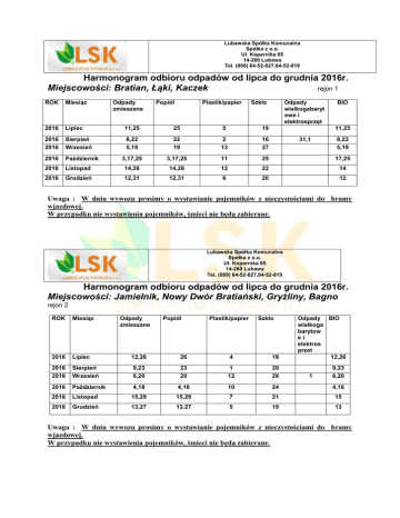 Lubawska Spółka Komunalna Spółka z o.o. Ul. Kopernika 65 14-260 Lubawa Tel. (089) 64-52-827,64-52-819 Harmonogram odbioru odpadów od lipca do grudnia 2016r. Miejscowości: Bratian, Łąki, Kaczek rejon 1 ROK Miesiąc 2016 Lipiec 11,25 25 5 19 2016 2016 Sierpień Wrzesień 8,22 5,19 22 19 2 13 16 27 2016 Październik 3,17,25 3,17,25 11 25 17,25 2016 Listopad 14,28 14,28 12 22 14 2016 Grudzień 12,31 12,31 6 20 12 Odpady zmieszane Popiół Plastik/papier Szkło Odpady wielkogabaryt owe i elektrosprzęt BIO 11,25 31,1 8,22 5,19 Uwaga : W dniu wywozu prosimy o wystawianie pojemników z nieczystościami do bramy wjazdowej. W przypadku nie wystawienia pojemników, śmieci nie będą zabierane. Lubawska Spółka Komunalna Spółka z o.o. Ul. Kopernika 65 14-260 Lubawa Tel. (089) 64-52-827,64-52-819 Harmonogram odbioru odpadów od lipca do grudnia 2016r. Miejscowości: Jamielnik, Nowy Dwór Bratiański, Gryźliny, Bagno rejon 2 ROK Miesiąc 2016 Lipiec 12,26 26 4 18 2016 2016 Sierpień Wrzesień 9,23 6,20 23 20 1 12 20 26 2016 Październik 4,18 4,18 10 24 4,18 2016 Listopad 15,29 15,29 7 21 15 2016 Grudzień 13,27 13,27 5 19 13 Odpady zmieszane Popiół Plastik/papier Szkło Odpady BIO wielkoga barytow ei elektros przet 12,26 1 9,23 6,20 Uwaga : W dniu wywozu prosimy o wystawianie pojemników z nieczystościami do bramy wjazdowej. W przypadku nie wystawienia pojemników, śmieci nie będą zabierane. Lubawska Spółka Komunalna Spółka z o.o. Ul. Kopernika 65 14-260 Lubawa Tel. (089) 64-52-827,64-52-819 Harmonogram odbioru odpadów od lipca do grudnia 2016r. Miejscowości: Chrośle, Lekarty, Skarlin, Radomno, Pustki rejon 3 ROK Miesiąc 2016 Lipiec 13,27 27 4 18 2016 2016 Sierpień Wrzesień 10,24 7,21 24 21 1 12 20 26 2016 Październik 5,19 5,19 10 24 5,19 2016 Listopad 2,16,30 2,16,30 7 21 16 2016 Grudzień 14,28 14,28 5 19 14 Odpady zmieszane Popiół Plastik/papier Szkło Odpad BIO y wielko gabary towe i elektro sprzęt 13,27 1 10,24 7,21 Uwaga : W dniu wywozu prosimy o wystawianie pojemników z nieczystościami do bramy wjazdowej. W przypadku nie wystawienia pojemników, śmieci nie będą zabierane. Lubawska Spółka Komunalna Spółka z o.o. Ul. Kopernika 65 14-260 Lubawa Tel. (089) 64-52-827,64-52-819 Harmonogram odbioru odpadów od lipca do grudnia 2016r. Miejscowości: Pacółtowo, Nawra, Mszanowo rejon 4 Odpady zmieszane Popiół Plastik/papier Szkło ROK Miesiąc Odpady BIO wielkoga barytow ei elektros przet 14,28 2016 Lipiec 14,28 28 4,5 18,19 2016 2016 Sierpień Wrzesień 11,25 8,22 25 22 1,2 1213 20,16 26,27 2016 Październik 6,20 6,20 10,11 24,25 6,20 2016 Listopad 3,17 3,17 7,12 21,22 17 2016 Grudzień 1,15,29 1,15,29 5,6 19,20 15 31 11,25 8,22 Uwaga : W dniu wywozu prosimy o wystawianie pojemników z nieczystościami do bramy wjazdowej. W przypadku nie wystawienia pojemników, śmieci nie będą zabierane. Lubawska Spółka Komunalna Spółka z o.o. Ul. Kopernika 65 14-260 Lubawa Tel. (089) 64-52-827,64-52-819 Harmonogram odbioru odpadów od lipca do grudnia 2016r. Miejscowości: Tylice, Gwiździny rejon 5 ROK Miesiąc 2016 Lipiec 2016 2016 Odpady zmieszane Popiół Plastik/papier Szkło Odpady BIO wielkog abaryto we i elektros przet 15,29 1,15,29 29 5 19 Sierpień Wrzesień 12,26 9,23 26 23 2 13 16 27 2016 Październik 7,21 7,21 11 25 7,21 2016 Listopad 4,18 4,18 12 22 18 2016 Grudzień 2,16,30 2,16,30 6 20 16 31 12,26 9,23 Uwaga : W dniu wywozu prosimy o wystawianie pojemników z nieczystościami do bramy wjazdowej. W przypadku nie wystawienia pojemników, śmieci nie będą zabierane.