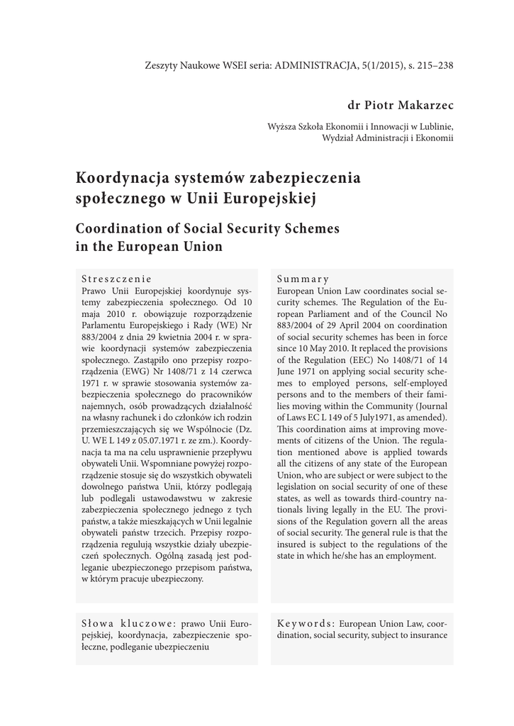Zeszyty Naukowe WSEI seria: ADMINISTRACJA, 5(1/2015), s. 215–238 dr Piotr Makarzec Wyższa Szkoła Ekonomii i Innowacji w Lublinie, Wydział Administracji i Ekonomii Koordynacja systemów zabezpieczenia społecznego w Unii Europejskiej Coordination of Social Security Schemes in the European Union Streszczenie Summar y S ł o w a k l u c z o w e : prawo Unii Euro- K e y w o r d s : European Union Law, coordination, social security, subject to insurance Prawo Unii Europejskiej koordynuje systemy zabezpieczenia społecznego. Od 10 maja 2010 r. obowiązuje rozporządzenie Parlamentu Europejskiego i Rady (WE) Nr 883/2004 z dnia 29 kwietnia 2004 r. w sprawie koordynacji systemów zabezpieczenia społecznego. Zastąpiło ono przepisy rozporządzenia (EWG) Nr 1408/71 z 14 czerwca 1971 r. w sprawie stosowania systemów zabezpieczenia społecznego do pracowników najemnych, osób prowadzących działalność na własny rachunek i do członków ich rodzin przemieszczających się we Wspólnocie (Dz. U. WE L 149 z 05.07.1971 r. ze zm.). Koordynacja ta ma na celu usprawnienie przepływu obywateli Unii. Wspomniane powyżej rozporządzenie stosuje się do wszystkich obywateli dowolnego państwa Unii, którzy podlegają lub podlegali ustawodawstwu w zakresie zabezpieczenia społecznego jednego z tych państw, a także mieszkających w Unii legalnie obywateli państw trzecich. Przepisy rozporządzenia regulują wszystkie działy ubezpieczeń społecznych. Ogólną zasadą jest podleganie ubezpieczonego przepisom państwa, w którym pracuje ubezpieczony. pejskiej, koordynacja, zabezpieczenie społeczne, podleganie ubezpieczeniu European Union Law coordinates social security schemes. The Regulation of the European Parliament and of the Council No 883/2004 of 29 April 2004 on coordination of social security schemes has been in force since 10 May 2010. It replaced the provisions of the Regulation (EEC) No 1408/71 of 14 June 1971 on applying social security schemes to employed persons, self-employed persons and to the members of their families moving within the Community (Journal of Laws EC L 149 of 5 July1971, as amended). This coordination aims at improving movements of citizens of the Union. The regulation mentioned above is applied towards all the citizens of any state of the European Union, who are subject or were subject to the legislation on social security of one of these states, as well as towards third-country nationals living legally in the EU. The provisions of the Regulation govern all the areas of social security. The general rule is that the insured is subject to the regulations of the state in which he/she has an employment. Zeszyty Naukowe WSEI seria: ADMINISTRACJA, 5(1/2015) 216 Piotr Makarzec Koordynacja systemów zabezpieczenia społecznego w Unii Europejskiej Wstęp Prawo Unii Europejskiej w zakresie koordynacji systemów zabezpieczenia społecznego ma na celu ułatwienie swobodnego przepływu obywateli Unii Europejskiej1. Nie przewidziano zastąpienia systemów krajowych jednym systemem wspólnotowym2. Podstawą jest jednak współpraca krajowych funduszy zabezpieczenia społecznego3. Każdy kraj ma swobodę decydowania o tym kogo obejmie ubezpieczeniem społecznym w oparciu o swoją kulturę i tradycję. Ustawodawstwo danego kraju określa również warunki oraz rodzaje przyznawanych na ich podstawie świadczeń. Przepisy wspólnotowe mają na celu ochronę praw następujących podmiotów: a. obywateli Unii Europejskiej w sytuacji, gdy są lub byli ubezpieczeni w jednym z krajów Unii. b. obywateli Islandii, Liechtensteinu, Norwegii i Szwajcarii oraz ich rodzin, którzy są lub byli ubezpieczeni w jednym z tych krajów lub na terenie Unii. c. bezpaństwowców i uchodźców, którzy są lub byli ubezpieczeni w jednym z powyższych krajów oraz do członków ich rodzin; d. obywateli krajów nienależących do Unii, legalnie mieszkających na terytorium UE, którzy przeprowadzają się między tymi krajami oraz do członków ich rodzin4. W stosunku do osób podlegających koordynacji mają zastosowanie następujące zasady: 1. Zasada równego traktowania lub niedyskryminacji tj. zasada posiadania takich samych praw i obowiązków jak obywatele kraju, którego przepisom podlegają. O tym jakie przepisy mają tu zastosowanie decydują właściwe instytucje zabezpieczenia społecznego. 2. Zasada zrównywania zdarzeń i okoliczności. 3. Zasada sumowania okresów ubezpieczenia lub zamieszkania tj. zasada uwzględniania przy przyznawaniu świadczenia w danym kraju, w razie konieczności poprzednich okresów ubezpieczenia, pracy lub pobytu w innych krajach5. 1 2 3 4 5 Por. M. Fuchs, Europeisches Sozialrecht. Kommentar, [In:] Gemeinschaft mit Helbing & Lichtenhahn und Manz Verlag Wien, Mainz 2010. E. Borowczyk, Unia Europejska a krajowe systemy emerytalne, „Ubezpieczenia Społeczne. Teoria i Praktyka” 2013, Nr 3, s. 19–22. Por. D. Dzienisiuk, Zabezpieczenie społeczne w Unii Europejskiej - koordynacja świadczeń, Difin, Warszawa 2004 oraz T. Bińczycka-Majewska, Koordynacja systemów zabezpieczenia społecznego w Unii Europejskiej, Zakamycze, Kraków 1999. A. Pochylska, Prawa obywateli państw trzecich w koordynacji systemów zabezpieczenia społecznego UE, „Ubezpieczenia Społeczne. Teoria i Praktyka” 2010, Nr 3, s. 9–13. K. Ślebzak, Koordynacja systemów zabezpieczenia społecznego. Komentarz, Wolters Kluwer, Warszawa 2012, s. 473 i n. Zeszyty Naukowe WSEI seria: ADMINISTRACJA, 5(1/2015) Piotr Makarzec Koordynacja systemów zabezpieczenia społecznego w Unii Europejskiej 217 4. Zasada zachowania praw nabytych w tym zasada transferu świadczeń polegająca na tym, że w sytuacji gdy przysługują podmiotowi świadczenia pieniężne w danym kraju, zasadniczo może je otrzymać, nawet jeśli mieszka w innym kraju6. Kształtowanie się przepisów unijnych dotyczących koordynacji systemów zabezpieczenia społecznego Pierwsze uregulowania dotyczące koordynacji systemów zabezpiecze
