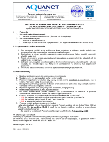 Aquanet Laboratorium sp. z o.o. 61-492 Poznań, ul. Dolna Wilda 126 tel: 61 8 359 284 fax: 61 8 324 773 e-mail:[email protected] 62-028 Koziegłowy, ul. Gdyńska 1 tel: 61 8 359 960 fax: 61 8111 512 e-mail:[email protected] INSTRUKCJA POBIERANIA PRZEZ KLIENTA PRÓBEK WODY DO ANALIZ MIKROBIOLOGICZNYCH I CHEMICZNYCH (zgodnie z PN-EN ISO 5667-3:2005; PN-EN ISO 5667-5:2003, PN-EN ISO 19458:2007) I. Pojemniki 1. Do analiz mikrobiologicznych 2. - sterylne, pobrane w laboratorium ( Poznań lub Koziegłowy) Do analiz chemicznych - pobrane w laboratorium lub - butelka po wodzie mineralnej o pojemności 1,5 l , wypłukana kilkakrotnie badaną wodą, II. Przygotowanie punktu pobierania 1. Do pobierania próbki wody wybieramy kran metalowy w dobrym stanie technicznym wewnątrz budynku, ewentualnie pompę ręczną lub hydrant. 2. Zdejmujemy z niego wszelkie urządzenia przeciwrozbryzgowe (sitka, zwężki, uszczelki, plastiki, węże itp.). 3. Przed pobieraniem, w celu usunięcia wody zalegającej w rurach należy ją odpuścić, aż do ustalenia się temperatury. 4. Zakręcić kran, oczyścić szczoteczką ( bez środków chemicznych), opłukać i opalić ( tylko ze względu na mikrobiologię) np. tamponem zamoczonym w alkoholu lub zapalaczem gazowym. 5. Ponownie odkręcić kran tak, aby woda płynęła umiarkowanym strumieniem. III. Pobieranie wody 1. Najpierw pobieramy wodę do pojemnika na mikrobiologię. 2. Uważamy, aby nie zanieczyścić korka i szyjki butelki. 3. Pojemniki napełniamy wodą tak, aby u góry została wolna przestrzeń z powietrzem – np. w butelce nalewamy wodę do jej zwężenia. 4. Następnie napełniamy pojemnik do badań chemicznych do pełna tak, aby nastąpił przelew i wówczas ostrożnie zakręcamy korkiem. 5. Pojemniki wyraźnie opisujemy miejscem pobierania, datą i godziną. 6. Próbki najlepiej pobierać w dniu jej dostarczenia. 7. Do czasu dostarczenia, próbka powinna być przechowywana w lodówce, a podczas transportu do laboratorium, zaleca się umieścić ją w termotorbie. 8. Czas od momentu pobrania do wykonania badania nie może przekroczyć: - 12 h dla badania ogólnej liczby mikroorganizmów, paciorkowców, gronkowców - 18 h dla badania na grupę coli, E. coli i paciorkowców, - 24 h w przypadku badań chemicznych . 9. Pobrane próbki wody przyjmujemy do badań: - dla mikrobiologii tylko w laboratorium oddział Poznań (wejście od ulic Dolna Wilda 126 lub Wiśniowa 13), do godziny 13.00. ( jeżeli to nie będzie możliwe, prosimy o wcześniejsze uzgodnienie telefoniczne) - dla chemii w oddziałach Poznań oraz Koziegłowy ul.Gdyńska 1 do godziny 15:30 IV. Informacja o wynikach Informację o wynikach badań mikrobiologicznych można uzyskać pod numerami: 61 8359 162 oraz 61 8359 215, najwcześniej po 3 dniach od ich rozpoczęcia, w godzinach 11.00 – 15.00, chemicznych: 61 8359 168 oraz 61 8359 284. Aktualizacja 01.11.2014 IK-3 z dnia 1.11.2014