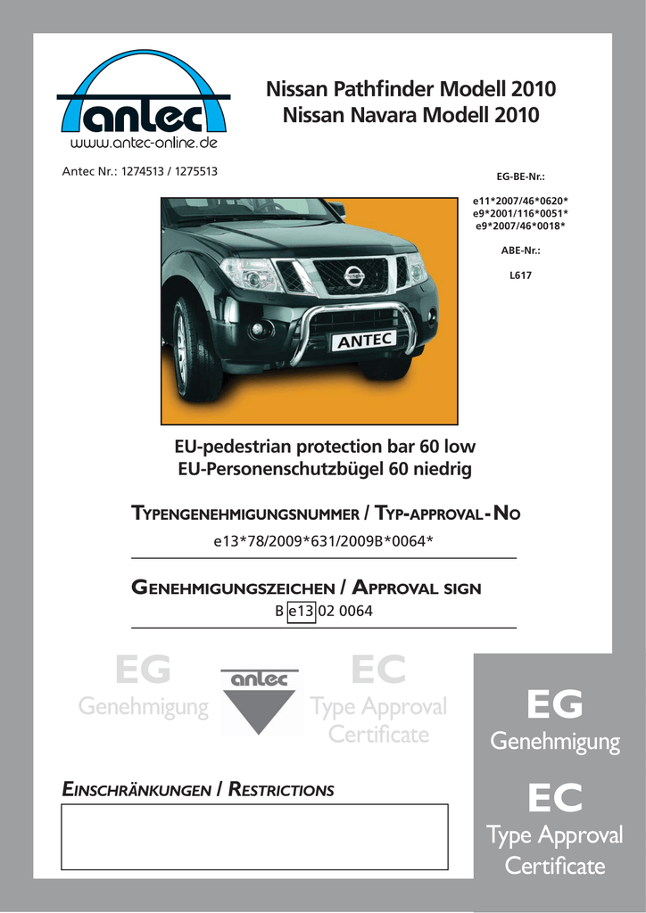 Nissan Pathfinder Modell 2010 Nissan Navara Modell 2010 Antec Nr.: 1274513 / 1275513 EG-BE-Nr.: e11*2007/46*0620* e9*2001/116*0051* e9*2007/46*0018* ABE-Nr.: L617 EU-pedestrian protection bar 60 low EU-Personenschutzbügel 60 niedrig TYPENGENEHMIGUNGSNUMMER / TYP-APPROVAL - NO e13*78/2009*631/2009B*0064* GENEHMIGUNGSZEICHEN / APPROVAL SIGN B e13 02 0064 EG Genehmigung EC Type Approval Certificate EINSCHRÄNKUNGEN / RESTRICTIONS EG Genehmigung EC Type Approval Certificate GRAND-DUCHÉ DE LUXEMBOURG SOCIÉTÉ NATIONALE DE CERTIFICATION ET D'HOMOLOGATION Ministère du Développement durable et des Infrastructures s.à r.l. Registre de Commerce: B 27180 Département des Transports L-5201 Sandweiler L-2938 Luxembourg Référence: e13*78/2009*631/2009B*0064*03 Annexes: - Rapport Technique - Fiche de Renseignements du constructeur Sandweiler, le 26 mars 2014 FICHE DE RECEPTION CE PAR TYPE EC TYPE-APPROVAL CERTIFICATE Communication concernant: Communication concerning the: - la réception CE par type (1) EC type-approval (1) - l'extension de la réception CE par type (1) extension of EC type-approval (1) - le refus de la réception CE par type (1) refusal of EC type-approval (1) - le retrait de la réception CE par type (1) withdrawal of EC type-approval (1) d'un type de système de protection frontale à fournir comme entité technique distincte en application du règlement (CE) Nº 78/2009 du Parlement européen et du Conseil, tel que mis en œuvre par le règlement (CE) N° 631/2009 modifié en dernier lieu par le règlement (CE) Nº 631/2009 (2). of a type of frontal protection system to be supplied as a separate technical unit with regard to Regulation (EC) N° 78/2009 of the European Parliament and of the Council of 14 January 2009 as implemented by Regulation (EC) N° 631/2009 last amended by Regulation (EC) N° 631/2009 (2). Numéro de réception CE par type: e13*78/2009*631/2009B*0064*03 EC type-approval number: Motif de l'extension: refer to Annex A of technical report Reason for extension: SECTION I SECTION I 0.1. Marque (raison sociale du constructeur): Make (trade name of manufacturer): 0.2. ANTEC Fahrzeugtechnik GmbH Type: Type: B-Line Description(s) commerciale(s) générale(s): General commercial description(s): 0.3. Moyens d'identification du type, s'il est indiqué sur le système de protection frontale (3): Means of identification of type if marked on the frontal protection system (3): 0.3.1. see item 0.2., Pages 1 to 5 of manufacturer's information document on manufacturer’s plate Emplacement de ce marquage: Location of that marking: see item 0.7. Page 1 of 5 e13*78/2009*631/2009B*0064*03 0.5. ANTEC Fahrzeugtechnik GmbH Im Brühl 78 D-74348 Lauffen a.N. Nom et adresse du constructeur: Name and address of manufacturer: 0.7. Emplacement et mode d’apposition de la marque de réception CE: Location and method of the affixing of the EC approval mark: 0.8. see item 0.7., Pages 6 to 8 of manufacturer’s information document Ototek Metal Isleme, Sanayi ve Ticaret A.S. Organize Sanayi Bölgesi, P.K.21 TR 59500 Cerkezköy-Tekirdag Nom(s) et adresse(s) du ou des ateliers de montage: Name(s) and address(es) of assembly plant(s): ANTEC Fahrzeugtechnik GmbH Im Brühl 78 D-74348 Lauffen a.N. 0.9. Nom et adresse du mandataire du constructeur (le cas échéant): Name and address of the manufacturer’s representative (if any): not applicable SECTION II SECTION II 1. 2. Informations complémentaires: Additional information: see Addendum Autorité déléguée: Société Nationale de Certification et d'Homologation L-5201 Sandweiler Assigned authority: Service technique chargé d'effectuer les essais: Technical service responsible for carrying out the tests: 3. Date du procès-verbal d'essai: Date of test report: 4. 21.03.2014 Numéro du procès-verbal d'essai: Number of test report: 5. Luxcontrol SA B.P. 349 L-4004 Esch-sur-Alzette LCA 51 0566 001 14 Remarques (le cas échéant): Remarks (if any): see Addendum Page 2 of 5 e13*78/2009*631/2009B*0064*03 6. Lieu: Sandweiler Place: 7. Date: 26 mars 2014 Date: 8. Signature: Signature: Pour le Département des Transports Pour la SNCH Marco FELTES Inspecteur Principal 1er en rang Claude LIESCH Directeur - Information package; - Test report. Annexes: Attachments: (see index to type-approval report) __________________ Biffer la mention inutile. (1) Delete where not applicable. (2) Veuillez insérer le numéro du règlement modificatif. Insert number of amending Regulation. (3) Si le moyen d'identification du type contient des caractères n’intéressant pas la description des types de véhicule, de composant ou d’entité technique couverts par la présente fiche, ces caractères doivent être remplacés par le symbole "?" dans la documentation (exemple ABC??123??). If the means of identification of type contains characters not relevant to describe the vehicle, component or separate technical unit types covered by this information, such characters shall be represented in the documentation by the symbol "?" (e.g. ABC??123??). Page 3 of 5 e13*78/2009*631/2009B*0064*03 Addendum Addendum à la fiche de réception CE par type N° e13*78/2009*631/2009B*0064*03 relative à la réception par type d’un type de système de protection frontale à fournir comme entité technique distincte en application du règlement n° 78/2009 to EC type-approval certificate N° e13*78/2009*631/2009B*0064*03 concerning the type-approval of a type of frontal protection system to be supplied as a separate technical unit with regard to Regulation (EC) N° 78/2009 1. Informations complémentaires Additional information 1.1. Méthode de fixation: see manufacturer’s information document Method of attachment: 1.2. Instructions d'assemblage et de montage: see manufacturer's information document Assembly and mounting instructions: 1.3. Liste des véhicules sur lesquels le système de protection frontale peut être monté, restrictions éventuelles d’utilisation et conditions 