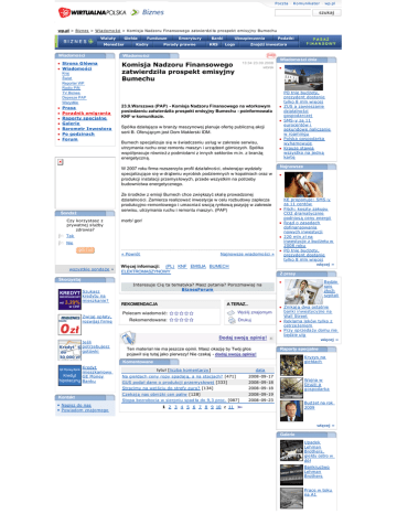 Poczta · Komunikator · wp.pl szukaj wp.pl > Biznes > Wiadomo ści > Komisja Nadzoru Finansowego zatwierdzi ła prospekt emisyjny Bumechu Waluty Giełda Menedżer Wiadomości Emerytury Porady prawne Banki KRS Ubezpieczenia Logo 13:34 23.09.2008 wtorek Komisja Nadzoru Finansowego zatwierdziła prospekt emisyjny Bumechu Kraj Świat Reporter WP Radio PiN TV Biznes Depesze PAP Wszystkie Podatki Znajdź inwestora Wiadomości • Strona G łówna • Wiadomo ści • Prasa • Poradnik emigranta • Raporty specjalne • Galerie • Barometr Inwestora • Po godzinach • Forum Fundusze Kadry 23.9.Warszawa (PAP) - Komisja Nadzoru Finansowego na wtorkowym posiedzeniu zatwierdziła prospekt emisyjny Bumechu - poinformowała KNF w komunikacie. Spółka działająca w branży maszynowej planuje ofertę publiczną akcji serii B. Oferującym jest Dom Maklerski IDM. Bumech specjalizuje si ę w świadczeniu usług w zakresie serwisu, utrzymania ruchu oraz remontu maszyn i urządzeń górniczych. Spółka wspó łpracuje również z podmiotami z innych sektorów m.in. z branżą energetyczną. Wiadomości dnia • PO tnie budżety, prezydent dostanie tylko 8 mln więcej • ZUS a zawieszanie działalności gospodarczej • SMS-y za 11 eurocentów i sekundowe naliczanie w roamingu • Polska gospodarka wyhamowuje • Krauze stawia wszystko na jedn ą kartę Najnowsze W 2007 roku firma rozszerzyła profil działalności, otwierając wydziały specjalizujące się w drążeniu wyrobisk podziemnych w kopalniach oraz w • produkcji instalacji przemysłowych, przede wszystkim na potrzeby budownictwa energetycznego. Ze środków z emisji Bumech chce zwiększyć skalę prowadzonej działalności. Zamierza realizować inwestycje w celu rozbudowy zaplecza produkcyjno-remontowego i umacnia ć swoj ą rynkową pozycję w zakresie serwisu, utrzymania ruchu i remontu maszyn. (PAP) Sondaż Czy korzystasz z prywatnej służby zdrowia? morb/ gor/ j Tak k l m n j Nie k l m n Najnowsze wiadomo ści » « Powrót wszystkie sonda że » więcej » Więcej informacji: (PL) KNF EMISJA BUMECH ELEKTROMASZYNOWY Z prasy Skorzystaj Interesuje Ci ę ta tematyka? Masz pytania? Porozmawiaj na BiznesForum Szukasz kredytu na mieszkanie? REKOMENDACJA A TERAZ... Polecam wiadomo ść: Zwijaj opłaty, rozwijaj firmę Drukuj Rekomendowana: Jeśli potrzebujesz gotówki Dodaj swoją opinię! Ten materiał nie ma jeszcze opinii. Masz okazję by Twój głos pojawił się tutaj jako pierwszy! Nie czekaj - dodaj swoją opinię! banki inwestycyjne na Wall Street • Reklama leków tylko z ostrzeżeniem • Przy sprzeda ży domu nie będzie ulg więcej » Raporty specjalne Kryzys na giełdach Komentowane Kredyt mieszkaniowy GE Money Banku tytuł [liczba komentarzy ] data Kontakt • Napisz do nas • Powiadom znajomego Będzie spis złych szpitali • • Znikają dwa ostatnie Wyślij znajomym KE proponuje: SMS -y za 11 centów • Fitch: koszty zakupu CO2 dramatycznie podniosą ceny energii • Rząd o zasadach dofinansowania nowych inwestycji • 220 mln zł na inwestycje z bud żetu w 2008 roku • PO tnie budżety, prezydent dostanie tylko 8 mln więcej Na giełdach ceny ropy spadaj ą, a na stacjach? [471] 2008-09-17 GUS poda ł dane o produkcji przemys łowej [333] 2008-09-18 Stracimy na wej ściu do strefy euro? [134] 2008-09-18 Czekaj ą nas obniżki cen paliw [128] 2008-09-19 Stopa bezrobocia w sierpniu spad ła do 9,3 proc. [087] 2008-09-23 Wojna w Gruzji a gospodarka Budżet na rok 2009 1 2 3 4 5 6 7 8 9 10 z 11 więcej » Galerie Upadek Lehman Brothers, giełdy ostro w dół Bankructwo Lehman Brothers Prace w toku na A1 więcej » Indeksy Polska ON-LINE 16:03 23.09.2008 nazwa WIG20 wart. [pkt] zm. [%] 2 373,66 -2,38 15:47 23.09.2008 nazwa mWIG40 sWIG80 WIG wart. [pkt] zm. [%] 2 300,08 -1,96 9 447,91 -1,47 37 367,57 -2,38 O firmie | Dla prasy | Reklama | Biznes z WP | Skontaktuj się z WP | Praca | Prywatność | Polityka antyspamowa Zobacz wszystkie serwisy | RSS Copyright © 1995-2008 Wirtualna Polska