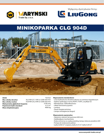 MINIKOPARKA CLG 904D Yanmar Silnik 36,3 KM (27,1 kW) @ 2200 obr/min Moc silnika (brutto) 33,8 KM (25,2 kW) @ 2200 obr/min Moc silnika (netto) 3100 mm Maksymalna głębokość kopania 0,12 m Pojemność łyżki standard 4000 kg Masa eksploatacyjna Wyposażenie standardowe - Linia hydrauliczna dwukierunkowa na ramieniu koparkowym - Kabina spełniająca normy ROPS i FOPS, cery kat CE - Klimatyzacja, radioodtwarzacz - Układ sterowania joystick - Lemiesz - Zawór bezpieczeństwa - Lampa ostrzegawcza (kogut) Wyposażenie opcjonalne - Gąsienice stalowe lub gumowe 600 mm - Szybkozłącze mechaniczne - Krata ochronna na szybę przednią, lampy robocze przednie LED - Pompa do tankowania paliwa - Łyżka 0,058 m zwężana, łyżka 0,14 m , łyżka 0,30 m www.warynski-trade.com.pl MINIKOPARKA CLG 904D SILNIK Producent Norma emisji spalin Moc silnik (brutto) Moc silnika (netto) Maksymalny moment obrotowy Pojemność skokowa Ilość cylindrów Yanmar Tier 4 Interim / Stage IIIA 36,3 KM (27,1 kW) @ 2200 obr/min 33,8 KM (25,2 kW) @ 2200 obr/min 141,7 Nm @ 1320 obr/min 2,2 l 4 PARAMETRY JAZDY Maksymalna prędkość jazdy Zdolność pokonywania wzniesień Siła uciągu 4,4 km/h 58% 17,7 kN PODWOZIE Szerokość płyty gąsienicowej Ilość płyt gąsienicowych (na jednej stronie) Ilość rolek jezdnych (na jednej stronie) Ilość kół nośnych (na jednej stronie) 300 mm 82 4 1 UKŁAD HYDRAULICZNY Maksymalny przepływ Ciśnienie układu roboczego Wydajność pompy sterującej 128,6 l/min 20,6 MPa 10,8 l/min UKŁAD OBROTU Ilość obrotów PARAMETRY RAMIENIA Długość ramienia Siła skrawająca ramienia przy normalnym ciśnieniu, ISO 1360 mm 17,6 kN PARAMETRY UKŁADU ROBOCZEGO Maksymalna głębokość kopania 3100 mm Maksymalny zasięg na poziomie gruntu 5220 mm Maks. głębokość kopania przy zachowaniu bezpiecznej odległości 2620 mm Maksymalna wysokość skrawania 5000 mm Maksymalna wysokość wysypu 3600 mm Maksymalny pionowy zasięg kopania 2040 mm PARAMETRY ŁYŻKI Pojemność łyżki standard Minimalna pojemność łyżki opcjonalnej Maksymalna pojemność łyżki opcjonalnej Siła skrawająca łyżki przy normalnym ciśnieniu, ISO 0,12 m3 0,06 m3 0,30 m3 28,3 kN POJEMNOŚCI UKŁADÓW Zbiornik paliwa Olej silnikowy Układ chłodzenia Zbiornik hydrauliczny Układ hydrauliczny 55 l 6,5 l 9l 58 l 75 l 11,1 obr/min Łyżka: SAE 0,12 m3 *** Wysięgnik: 2600 mm *** Ramię: 1360 mm *** Płyta gąsienicowa: 300 mm Wysokość podnoszenia Maksymalny zasięg 3m 2m Przód 4m ¤580 ¤580 ¤590 Tył 570 mm 4180 ¤770 ¤640 590 ¤610 470 4580 850 ¤740 560 ¤640 440 4690 ¤1230 810 ¤810 540 ¤690 450 4540 ¤1190 800 ¤770 530 ¤740 510 4100 3m kg 2m kg ¤770 1m kg ¤2210 1500 ¤1060 0 kg ¤2330 1450 -1 m kg ¤2080 1460 1. ¤ Ograniczone obciążenie przez wydajność hydrauliczną układu, a nie przez możliwość wywrócenia. 2. Powyższe obciążenia są zgodne z normą ISO 10567 (maszyny do robót ziemnych) 3. Ocena przy haku zamontowanym na łyżce. www.warynski-trade.com.pl ul. Chełmżyńska 249, 04-458 Warszawa tel.: (+48) 22 632 39 56, fax: (+48) 22 632 67 69 e-mail: [email protected] UWAGA! Producent zastrzega sobie możliwość wprowadzania zmian do przedstawionego modelu bez podania przyczyny.