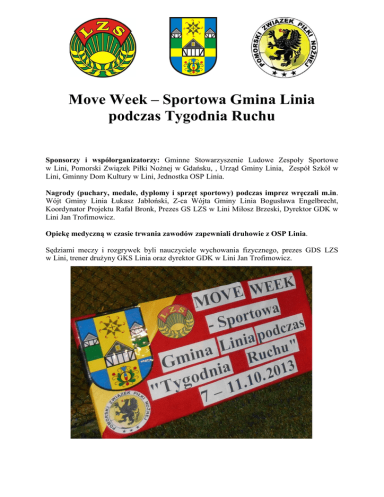 Move Week – Sportowa Gmina Linia podczas Tygodnia Ruchu Sponsorzy i współorganizatorzy: Gminne Stowarzyszenie Ludowe Zespoły Sportowe w Lini, Pomorski Związek Piłki Nożnej w Gdańsku, , Urząd Gminy Linia, Zespół Szkół w Lini, Gminny Dom Kultury w Lini, Jednostka OSP Linia. Nagrody (puchary, medale, dyplomy i sprzęt sportowy) podczas imprez wręczali m.in. Wójt Gminy Linia Łukasz Jabłoński, Z-ca Wójta Gminy Linia Bogusława Engelbrecht, Koordynator Projektu Rafał Bronk, Prezes GS LZS w Lini Miłosz Brzeski, Dyrektor GDK w Lini Jan Trofimowicz. Opiekę medyczną w czasie trwania zawodów zapewniali druhowie z OSP Linia. Sędziami meczy i rozgrywek byli nauczyciele wychowania fizycznego, prezes GDS LZS w Lini, trener drużyny GKS Linia oraz dyrektor GDK w Lini Jan Trofimowicz. 5/6.10.2013 r. VII Mistrzostwa Gminy Linia w Tenisie Stołowym W dnia 5-6 października 2013 r. w Strzepczu odbyły się VII Mistrzostwa Gminy Linia w Tenisie Stołowym. Organizatorami zawodów byli: Gminny Dom Kultury w Lini, Gminne Stowarzyszenie LZS w Lini, Urząd Gminy w Lini i Zespół Szkół w Strzepczu. Nad sprawnym przebiegiem zawodów w obu dniach czuwali dyrektor GDK Jan Trofimowicz oraz sędzia techniczny Joanna Gajewska. W gronie dziewcząt rocznik 2001 i młodsze zwyciężyła Magdalena Labuda z Miłoszewa. W tej samej kategorii wśród chłopców najlepszym okazał się Paweł Skrzypkowski ze Strzepcza. Wśród kadetek rocznik 1998 – 2000 zwyciężyła Julianna Papke ze Strzepcz, natomiast wśród kadetów I miejsce zajął zwycięzca wszystkich pojedynków Kamil Skrzypkowski również ze Strzepcza. W kategorii juniorów – rocznik 1993 – 1997 bezapelacyjnym zwyciężył Karol Stankowski ze Strzepcza. W kategorii seniorek roczni 1992 i starsze zwyciężyła Alicja Hinz ze Smażyna, natomiast wśród seniorów Adam Kozerski ze Strzepcza. Troje najlepszych zawodników w każdej kategorii wiekowej otrzymało dyplomy i medale, a zwycięzcy okazałe pucharki. Dekoracji dokonali organizatorzy. W zawodach udział wzięli reprezentanci 8 wsi sołeckich. W klasyfikacji generalnej drużyn bezapelacyjnie zwyciężyła reprezentacja gospodarzy ze Strzepcza. Kolejna miejsca zajęły: Smażyno, Miłoszewo, Pobłocie, Linia, Lewino, Lewinko i Niepoczołowice. 07.10.2013 r. Turniej Piłkarski rocznika 2000/2001 Do turnieju zgłosiło się 7 drużyn: 2 ze Strzepcza, 3 z Lini, po 1 z Pobłocia i z Sierakowic. Bezkonkurencyjni okazali się zawodnicy z Sierakowic, którzy wygrali wszystkie spotkania. Spotkania przyniosły sporo emocji, atmosfera była bardzo przyjazna a kibice zobaczyli sporo ładnych bramek. Klasyfikacja końcowa: 1. Orlik Sierakowice w składzie: Wnuk- Lipiński Radosław, Okroj Oliwier, Paniński Kacper, Drewniak Kamil, Abramowski Mateusz, Penkowski Maksymilian, WnukLipiński Patryk 2. Sparta II Linia w składzie: Elwart Fabian, Grzenkowicz Adrian, Patryk Barembruch, Ellwart Dominik, Kalkowski Oskar, Narewski Oskar, 3. KS Linia w składzie: Choszcz Adam, Pipka Karol, Dawidowski Cezary, Kreft Mateusz, Kobiella Dawid, Klein Karol, 4. Pobłocie w składzie: Stenka Dominik, Stenka Nikodem, Patelczyk Jakub, Dosz Patryk, Perszon Daniel, Cyman Grzegorz, Stefanowski Dawid 5. Chelsea Linia w składzie: Bobrucki Przemysław, Baranowski Kacper, Fuczka Kacper, Marszałkiewicz Bartłomiej, Olszewski Mieszko, Orlikowski Filip 6. Strzepcz I w składzie: Gafke Michał, Myszka Jan, Skrzypkowski Paweł, Kobiela Przemysław, Jankowski Aleksander, Solski Jakub 7. Strzepcz II w składzie: Skrzypkowski Marcin, Wenta Dawid, Rzepa Jakub, Sikora Paweł, Brylowski Adam, Wenta Paweł Przyznana została również nagroda dla najwszechstronniejszego zawodnika turnieju, został nim Dominik Ellwart (Sparta II Linia). 08.10.2013 r. Turniej piłkarski rocznika 1998 / 1999 Do turnieju zgłosiło się 6 drużyn - KS Linia, ZS Strzepcz, Sparta II Linia, FC Maślaki Linia, PZU Linia, Orlik Sierakowice. Mecze rozgrywane były systemem "każdy z każdym". Zwycięstwo w turnieju zapewnili sobie zawodnicy PZU Linia, którzy wyprzedzili Orlika Sierakowice oraz Spartę II Linia. Klasyfikacja końcowa: 1. PZU Linia w składzie: Ptasiński Rafał, Tymoteusz Gruba, Patelczyk Artur, Elwart Dawid, Rybicki Dawid, Grzenkowicz Arkadiusz 2. Orlik Sierakowice w składzie: Goitowski Jakub, Marszałkowski Szymon, Dampc Krzysztof, Wenta Sebastian, Kuczkowski Robert, Różnicki Krzysztof 3. Sparta II Linia w składzie: Adrian Grzenkowicz, Oskar Kalkowski, Oskar Narewski, Fabian Elwart, Patryk Barembruch 4. FC Maślaki Linia 5. ZS Strzepcz 6. KS Linia Zostały przyznane 2 nagrody dla najwszechstronniejszych zawodników, pierwsza nagroda powędrowała do Patryka Barembruch (Sparta II Linia) a druga do Szymona Marszałkowskiego ( Orlik Sierakowice). 09.10.2013 r. Turniej Piłki Nożnej rocznika 1997 i starsi. Do turnieju zgłosiło się 9 drużyn, Młodzi Oldboje Linia, Oldboje Linia, GKS I Linia, GKS II Linia, FC Bawarczycy, Lechia Linia, Strzepcz, Zakrzewo, PZU Linia. Rozgrywki toczyły się w 2 grupach, każdy mecz trwał 10 minut. Zwycięzcą turnieju okazała się drużyna GKS II Linia która pokonała w finale rewelację turnieju PZU Linia. W meczu o trzecie miejsce GKS I Linia pokonał FC Bawarczyków. Piąte miejsce zajęli Oldboje Linia, szóste Zakrzewo. W meczu o 7 miejsce Lechia Linia po zaciętym meczu pokonała Młodych Oldbojów. Na 9 miejscu uplasowali się zawodnicy ze Strzepcza. Przyznano też indywidualne wyróżnienia, najlepszymi zawodnikami okazali się Michał Choszcz ( GKS II Linia) Arkadiusz Grzenkowicz (PZU Linia) 10.10.2013 r. Turniej Piłki Siatkowej Na placu boju stawiło się 12 drużyn, to rekord jeśli chodzi o wszystkie turnieje w ramach Move Week w naszej miejscowości. Drużyny zostały podzielone na 4 grupy. GRUPA A Lp. Drużyna 1. ZAKSA II LINIA 2. SPARTA LINIA 3. SKRA PLEJBOJE LINIA GRUPA B Lp. Drużyna 1. DZIEWCZYNY LINIA 2. DREAM TEAM LINIA 3. ASECCO LINIA GRUPA C Lp. Drużyna 1. GKS I LINIA 2. LIN
