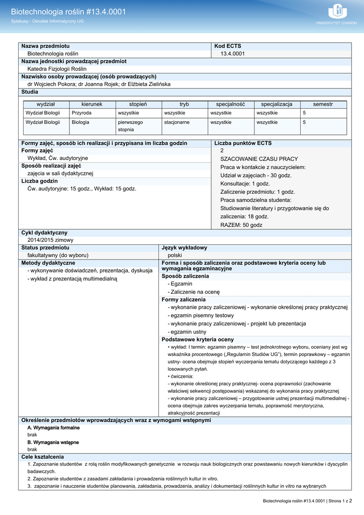 Biotechnologia roślin #13.4.0001 Sylabusy - Ośrodek Informatyczny UG Nazwa przedmiotu Biotechnologia roślin Nazwa jednostki prowadzącej przedmiot Katedra Fizjologii Roślin Nazwisko osoby prowadzącej (osób prowadzących) dr Wojciech Pokora; dr Joanna Rojek; dr Elżbieta Zielińska Studia wydział kierunek stopień Kod ECTS 13.4.0001 tryb specjalność specjalizacja semestr Wydział Biologii Przyroda wszystkie wszystkie wszystkie wszystkie 5 Wydział Biologii Biologia pierwszego stopnia stacjonarne wszystkie wszystkie 5 Formy zajęć, sposób ich realizacji i przypisana im liczba godzin Formy zajęć Wykład, Ćw. audytoryjne Sposób realizacji zajęć zajęcia w sali dydaktycznej Liczba godzin Ćw. audytoryjne: 15 godz., Wykład: 15 godz. Cykl dydaktyczny 2014/2015 zimowy Status przedmiotu fakultatywny (do wyboru) Metody dydaktyczne - wykonywanie doświadczeń, prezentacja, dyskusja - wykład z prezentacją multimedialną Liczba punktów ECTS 2 SZACOWANIE CZASU PRACY Praca w kontakcie z nauczycielem: Udział w zajęciach - 30 godz. Konsultacje: 1 godz. Zaliczenie przedmiotu: 1 godz. Praca samodzielna studenta: Studiowanie literatury i przygotowanie się do zaliczenia: 18 godz. RAZEM: 50 godz Język wykładowy polski Forma i sposób zaliczenia oraz podstawowe kryteria oceny lub wymagania egzaminacyjne Sposób zaliczenia - Egzamin - Zaliczenie na ocenę Formy zaliczenia - wykonanie pracy zaliczeniowej - wykonanie określonej pracy praktycznej - egzamin pisemny testowy - wykonanie pracy zaliczeniowej - projekt lub prezentacja - egzamin ustny Podstawowe kryteria oceny • wykład: I termin: egzamin pisemny – test jednokrotnego wyboru, oceniany jest wg wskaźnika procentowego („Regulamin Studiów UG”), termin poprawkowy – egzamin ustny- ocena obejmuje stopień wyczerpania tematu dotyczącego każdego z 3 losowanych pytań. • ćwiczenia: - wykonanie określonej pracy praktycznej- ocena poprawności (zachowanie właściwej sekwencji postępowania) wskazanej do wykonania pracy praktycznej - wykonanie pracy zaliczeniowej – przygotowanie ustnej prezentacji multimedialnej ocena obejmuje zakres wyczerpania tematu, poprawność merytoryczna, atrakcyjność prezentacji Określenie przedmiotów wprowadzających wraz z wymogami wstępnymi A. Wymagania formalne brak B. Wymagania wstępne brak Cele kształcenia 1. Zapoznanie studentów z rolą roślin modyfikowanych genetycznie w rozwoju nauk biologicznych oraz powstawaniu nowych kierunków i dyscyplin badawczych. 2. Zapoznanie studentów z zasadami zakładania i prowadzenia roślinnych kultur in vitro. 3. zapoznanie i nauczenie studentów planowania, zakładania, prowadzenia, analizy i dokumentacji roślinnych kultur in vitro na wybranych Biotechnologia roślin #13.4.0001 | Strona 1 z 2 Biotechnologia roślin #13.4.0001 Sylabusy - Ośrodek Informatyczny UG przykładach (kultury organów wegetatywnych i generatywnych); wykazanie praktycznego wykorzystania roślinnych kultur in vitro w życiu człowieka (rolnictwo, ogrodnictwo) Treści programowe A. Problematyka wykładu: Rola roślin w zaspokajaniu potrzeb człowieka. Procesy rozwojowe w roślinnych kulturach in vitro. Typy kultur in vitro. Tworzenie konstrukcji genowych do modyfikacji roślin. Transformacja genetyczna komórek roślinnych. Rośliny modyfikowane genetycznie. Społeczne i prawne aspekty biotechnologii roślin. B. Ćwiczenia: Podstawowe metody przygotowania, zakładania i prowadzenia kultur in vitro.Specyficzne metody przygotowania, zakładania i prowadzenia kultur in vitro organów generatywnych wykorzystywanych w nowoczesnym rolnictwie i ogrodnictwie. Wykaz literatury A. Literatura wymagana do ostatecznego zaliczenia zajęć: A.1. wykorzystywana podczas zajęć Malepszy S. (red.). 2009. Biotechnologia roślin, PWN, Warszawa. A.2. studiowana samodzielnie przez studenta Malepszy S. (red.). 2009. Biotechnologia roślin, PWN, Warszawa. Kopcewicz J. (red.). 2007. Fizjologia roślin, PWN, Warszawa. B. Literatura uzupełniająca Loyola-Vargas V.M., Vázquez-Flota F. (red.). 2006. Plant Culture Protocols. W: Methods in molecular Biology, Humana Press, Totowa, New Jersey. Efekty uczenia się Przedmiot realizuje: Efekty kształcenia dla kierunku Biologia UG w bloku "Biotechnologia": B_W10, B_W14, B_W16, B_U06, B_U07, B_U08, B_U10, B_K01, B_K08 Wiedza - orientuje się w rozwoju i obecnym stanie wiedzy oraz najnowszych trendach z zakresu podstaw biotechnologii roślin oraz wskazuje ich związek z innymi dyscyplinami przyrodniczymi (B_W10), - objaśnia podstawy teoretyczne metod doświadczalnych i najważniejszych technik stosowanych przy prowadzeniu roślinnych kultur in vitro oraz tworzeniu roślinnych organizmów modyfikowanych genetycznie (B_W14), - objaśnia związki między osiągnięciami w biotechnologii roślin a możliwościami ich wykorzystania w życiu społeczno -gospodarczym (B_W16). Umiejętności -czyta ze zrozumieniem proste naukowe teksty w języku polskim (B_U06), -samodzielnie wyszukuje i korzysta z dostępnych źródeł informacji biologicznej, w tym ze źródeł elektronicznych (B_U07), -uczy się samodzielnie w sposób ukierunkowany (B_U08), - posiada umiejętność wystąpień ustnych w języku polskim dotyczących zagadnień z zakresu biotechnologii roślin (B_U10). Kompetencje społeczne (postawy) - zna ograniczenia własnej wiedzy i rozumie potrzebę stałego uczenia się i rozwoju oraz jest otwarty na nowe idee (B_K01), - rozumie potrzebę uczciwości i rzetelności w pracy naukowej i zawodowej (B_K08). Kontakt [email protected] Biotechnologia roślin #13.4.0001 | Strona 2 z 2