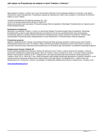 Jaki wpływ na Prezydencję ma wejście w życie Traktatu z Lizbony? Wprowadzenie Traktatu z Lizbony ma na celu wzmocnienie zdolności Unii do spójnego działania na zewnątrz, oraz lepsze realizowanie zadań wewnętrznych. Prezydencja uzyskała do realizacji tych celów nowe narzędzia, a mianowicie od momentu wejścia w życie Traktatu: •formalnie potwierdzono Prezydencje grupowe, tzw. „trio”, •zmienił się sposób podejmowania decyzji w Radzie UE. Utworzono ponadto nowe stanowiska: Przewodniczącego Rady Europejskiej i Wysokiego Przedstawiciela ds. Zagranicznych i Polityki Bezpieczeństwa. Rozdzielenie kompetencji Mianowani na podstawie Traktatu z Lizbony na stanowiska Stałego Przewodniczącego Rady Europejskiej i Wysokiego Przedstawiciela, przejmą część odpowiedzialności przynależnych do tej pory przedstawicielowi kraju sprawującego Prezydencję, głównie w zakresie działań zewnętrznych (bezpieczeństwo, handel, działania humanitarne). Premier kraju sprawującego Prezydencję będzie współpracował w innych dziedzinach z Przewodniczącym Rady Europejskiej. Prezydencja grupowa Zgodnie z postanowieniami Traktatu Lizbońskiego Prezydencję Rady sprawują uprzednio ustalone grupy trzech Państw Członkowskich [trio] przez okres 18 miesięcy. Każdy członek grupy kolejno przewodniczy przez okres sześciu miesięcy, a pozostali członkowie grupy wspierają kraj przewodniczący we wszystkich jego obowiązkach na podstawie wspólnego programu. Podejmowanie decyzji w Radzie UE Zmiana sposobu podejmowania decyzji w Radzie UE dokonana przez Traktat z Lizbony dotyczy tych dziedzin, w których stanowiono kwalifikowaną większością głosów. Mimo że Traktat z Lizbony wszedł już w życie, na wniosek Polski przywódcy Państw Członkowskich uzgodnili, że do 1 listopada 2014 roku będą obowiązywały dotychczasowe zasady głosowania, z Traktatu z Nicei. Do 31 marca 2017 roku, każdy kraj będzie mógł zażądać powtórnego głosowania w systemie nicejskim i w ten sposób skutecznie blokować podejmowanie niekorzystnych dla niego decyzji. Od listopada 2014 r. będzie mógł mieć zastosowanie tzw. kompromis z Joaniny, pozwalający na odwlekanie podejmowania decyzji w Radzie przez „rozsądny czas”. www.prezydencjaue.gov.pl strona 1 / 1