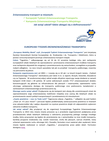 Biuro Regionalne Województwa Lubuskiego w Brukseli Zrównoważony transport w miastach: Europejski Tydzień Zrównoważonego Transportu Kampania Zrównoważonego Transportu Miejskiego Jak wziąć udział? Gdzie ubiegać się o dofinansowanie? EUROPEJSKI TYDZIEŃ ZROWNOWAŻONEGO TRANSPORTU „European Mobility Week” czyli „Europejski Tydzień Zrównoważonego Transportu” jest inicjatywą Dyrekcji Generalnych Komisji Europejskiej: ds. Środowiska i ds. Transportu i Mobilności, która w postaci corocznej kampanii promuje zrównoważony transport miejski. Celem “Tygodnia…” odbywającego się od 16 do 22 września każdego roku, jest zachęcenie europejskich władz lokalnych do wprowadzania i promowania zrównoważonych środków transportu oraz zachęcenie obywateli do rezygnacji z przemieszczania się samochodem, szczególnie w przypadku małych odległości, na rzecz innych sposobów tak jak na przykład transportu publicznego, rowerów czy poruszania się pieszo. Kampania organizowana jest od 2002 r. i rozwija się w UE jak i w innych krajach świata. „Tydzień Zrównoważonego Transportu” obchodzony jest także m.in. w Japonii, Brazylii, Kolumbii, Ekwadorze czy na Tajwanie. W zeszłorocznej edycji udział wzięło oficjalnie rejestrując swoje działania w ramach kampanii 2158 miast z 39 państw. W sumie wdrożonych zostało 7717 zrównoważonych działań, koncentrujących się głównie na infrastrukturze dla pieszych i rowerzystów, opanowaniu ruchu ulicznego, polepszaniu dostępu do transportu publicznego oraz podnoszeniu świadomości o zachowaniach zrównoważonego przemieszczania się. Dlaczego warto wziąć udział? Przyłączenie się do kampanii jest okazją dla uczestniczących miast do zaprezentowania wagi zrównoważonej mobilności miejskiej oraz szansą dla lokalnych władz na przetestowanie swoich polityk transportowych i przedstawienia ich mieszkańcom. „Czyste powietrze – czas na Twój ruch!” Tegoroczna edycja „Tygodnia…” odbędzie się pod hasłem „Clean air. It’s your move!” i poruszać będzie problematykę zanieczyszczenia powietrza w miastach oraz odzwierciedlać siłę i wpływ obywateli na czystsze powietrze dzięki ich odpowiednim wyborom odnośnie środków transportu. Jak wziąć udział? Aby przyłączyć się do organizacji Europejskiego Tygodnia Zrównoważonego Transportu w 2013 roku miasta miasta proszone są o przesłanie organizatorom podpisanej przez przedstawiciela władz lokalnych deklaracji o wdrożeniu przynajmniej jednego nowego trwałego środka, który przyczyniać się będzie do przeniesienia się z samochodów na inne środki transportu, bardziej przyjazne środowisku (np. ścieżki rowerowe, strefy dla pieszych, szersze chodniki, nowy schemat opanowania ruchu ulicznego itd.). Ponadto, formularz musi zawierać plan wydarzeń, które miasto będzie realizować w ramach „Tygodnia…” przynajmniej przez jeden dzień. Formularz dostępny tutaj. 1 Biuro Regionalne Województwa Lubuskiego w Brukseli Uczmy się od najlepszych! Kampanie przeprowadzone z sukcesem, mogą zostać zgłoszone do konkursu organizowanego przez Komisję Europejską we współpracy z EUROCITIES na najlepszą kampanię promującą działania „Tygodnia…”. W 2012 r. Krosno Odrzańskie po raz pierwszy i jako jedyne miasto w województwie lubuskim przyłączyło się do „Europejskiego Tygodnia Zrównoważonego Transportu”. Miasto zrealizowało wraz z lokalnymi partnerami przy ogromnym zaangażowaniu mieszkańców, szereg działań i aktywności promujących zrównoważony transport a także zdrowy i aktywny tryb życia pod hasłem „Zostań Eko jeźdźcem!”. Sukces 18-sto tysięcznego Krosna Odrzańskiego doceniło Ministerstwo Środowiska oceniając kampanię jako drugą najlepszą w Polsce. Trud miasta został dostrzeżony również na szczeblu europejskim, w konkursie kampania została jedną z dziesięciu najlepszych Europejskiego Tygodnia Zrównoważonego Transportu w UE a przedstawiciele Miasta zaproszeni do poprowadzenia warsztatów w Brukseli dla reprezentantów europejskich miast na temat efektywnych, nisko kosztowych kampaniach. Więcej informacji o kampanii Krosna Odrzańskiego: tutaj. Więcej informacji o Europejskim Tygodniu Zrównoważonej Energii: http://www.mobilityweek.eu/ KAMPANIA ZRÓWNOWAŻONEGO TRANSPORTU MIEJSKIEGO „Sustainable Urban Mobility campaign” – „Kampania zrównoważonego transportu miejskiego” to trzyletnia inicjatywa Komisji Europejskiej Dyrekcji Generalnych ds. Środowiska i ds. Transportu i Mobilności finansowania z programu Inteligentna Energia Europa, uruchomiona w 2012 r. Wspiera ona kampanie zrównoważonego transportu miejskiego w 27 krajach członkowskich UE oraz Norwegii, Islandii, Lichtensteinie i Chorwacji. Celem jest promowanie zalet płynących z łączenia różnych środków transportu, podkreślenie, że wykorzystywanie różnych środków transportu odpowiednich dla odbywanej podróży pozwoli na polepszenie zdrowia i finansów podróżujących, ma także wpływ na środowisko. Kampania odbywa się pod hasłem „Do the right mix” (czyli najlepszego łączenia środków transportu). Aby przyłączyć się do Europejskiej Kampanii Zrównoważonego Transportu Miejskiego należy zarejestrować swoje działania podnoszenia świadomości o możliwościach związanych z prawidłowym wykorzystywaniem transportu w miastach. Może to być działanie jednodniowe, trwające kilak dni lub miesięcy, wydarzenie cykliczne itd. Organizatorami mogą być społeczności lokalne, NGO, partnerzy społeczni, instytucje badawcze i edukacyjne, instytucje publiczne, władze lokalne czy krajowe a także publiczne i prywatne przedsiębiorstwa. Rejestracji można dokonać tutaj. Istnieje również możliwość dofinansowania kampanii na zasadzie zwrotu części poniesionych kosztów kwalifikowanych, dla podmiotów niekomercyjnych tj. NGO, władze publiczne, szkoły, uniwersytety, instytucje b