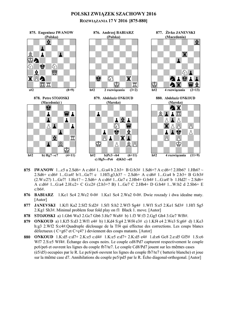 POLSKI ZWIĄZEK SZACHOWY 2016 ROZWIĄZANIA 17 V 2016 [875-880] 875. Eugeniusz IWANOW (Polska) s#2 (8+9) 878. Petre STOJOSKI (Macedonia) ) h#2 b) Hg7→c7 (4+11) 876. Andrzej BABIARZ (Polska) h#2 2 rozwiązania (3+2) 879. Abdelaziz ONKOUD (Maroko) h#2 b)Pc3→b4 (6+11) c) Hg5↔Pe6 d)Kb2→d1 877. Żivko JANEVSKI (Macedonia) h#2 4 rozwiązania (2+13) 880. Abdelaziz ONKOUD (Maroko) h#2 4 rozwiązania (11+9) 875 IWANOW 1...c5 a 2.Sd6+ A c:d6# 1...G:a4 b 2.b3+ B G:b3# 1.Sd6+? A c:d6+! 2.Hb6? 1.Hh6? ~ 2.Sd6+ c:d6# 1...G:a4! b/1...Ge7! c 1.Hf3,g3,h3? ~ 2.Sd6+ A c:d6# 1...G:a4 b 2.b3+ B G:b3# (2.W:c2?) 1...Ge7! 1.He1? ~ 2.Sd6+ A c:d6# 1...Ge7 c 2.Hb4+ G:b4# 1...G:a4! b 1.Hd2! ~ 2.Sd6+ A c:d6# 1...G:a4 2.H:c2+ C G:c2# (2.b3+? B) 1...Ge7 C 2.Hb4+ D G:b4# 1...W:b2 d 2.Sb6+ E c:b6#. 876 BABIARZ 1.Kc1 Sc4 2.Wc2 0-0# 1.Ka1 Sc4 2.Wa2 0-0#. Dwie roszady i dwa idealne maty. [Autor] 877 JANEVSKI 1.Kf1 Ka2 2.Sf2 S:d2# 1.Sf1 S:h2 2.Wf3 Sg4# 1.Wf1 S:e5 2.Ke1 Sd3# 1.Hf1 Sg5 2.Kg1 Sh3#. Minimal problem four fold play on f1 Black 1. move. [Autor] STOJOSKI a) 1.Gb6 Wa3 2.Gc7 Gb6 3.He7 Wa8# b) 1.f3 W:f3 2.Gg5 Gh4 3.Ge7 Wf8#. 878 879 ONKOUD a) 1.Kf5 S:d3 2.Wf1 e4# b) 1.Kd4 S:g4 2.Wf4 e3# c) 1.Kf4 e4 2.We3 S:g6# d) 1.Ke3 h:g3 2.Wf2 S:c4#.Quadruple déclouage de la Tf4 qui effectue des corrections. Les coups blancs défectueux ( C×g6? et C×ç4? ) deviennent des coups matants. [Autor] 880 ONKOUD 1.K:d5 c:d7+ 2.K:e5 c:d4# 1.K:e5 e:d7+ 2.K:d5 e4# 1.d:e6 Gc8 2.e:d5 Gf5# 1.S:c6 Wf7 2.S:e5 Wf4#. Échange des coups noirs. Le couple cd8/Pd7 capturent respectivement le couple pc6/pe6 et ouvrent les lignes du couple fb7/te7. Le couple Cd8/Pd7 jouent sur les mêmes cases (é5/d5) occupées par le R. Le pc6/pe6 ouvrent les lignes du couple fb7/te7 ( batterie blanche) et joue sur la même case d7. Annihilations du couple pe5/pd5 par le R. Écho diagonal-orthogonal. [Autor]
