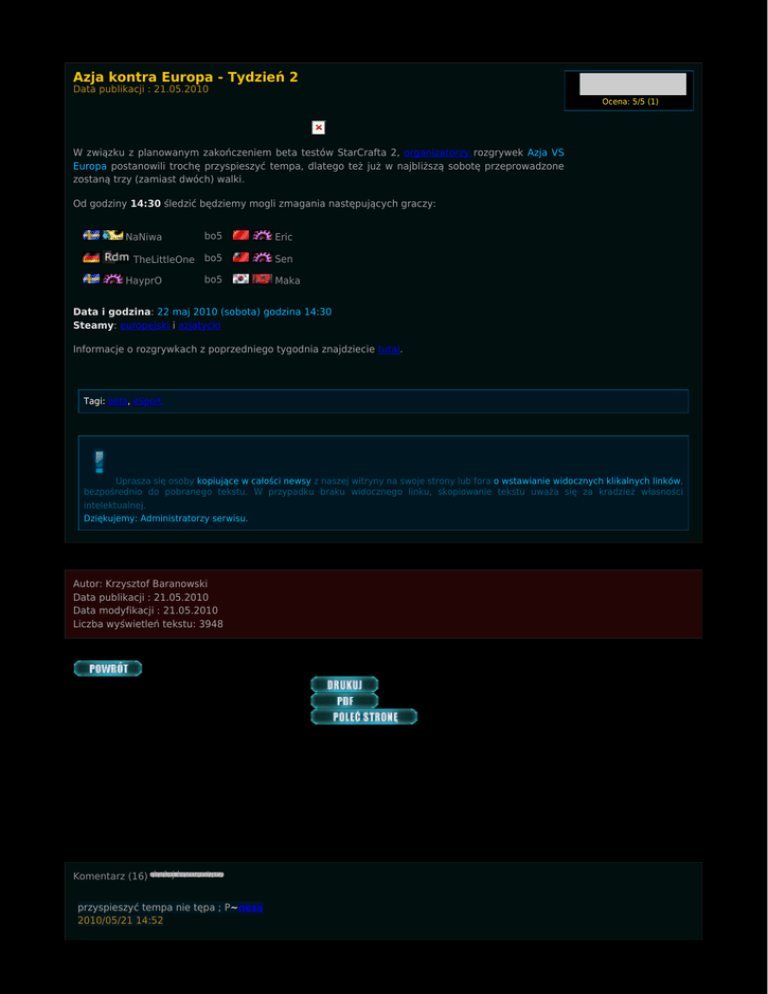 Azja kontra Europa - Tydzień 2 Data publikacji : 21.05.2010 Ocena: 5/5 (1) W związku z planowanym zakończeniem beta testów StarCrafta 2, organizatorzy rozgrywek Azja VS Europa postanowili trochę przyspieszyć tempa, dlatego też już w najbliższą sobotę przeprowadzone zostaną trzy (zamiast dwóch) walki. Od godziny 14:30 śledzić będziemy mogli zmagania następujących graczy: bo5 Eric TheLittleOne bo5 Sen NaNiwa HayprO bo5 Maka Data i godzina: 22 maj 2010 (sobota) godzina 14:30 Steamy: europejski i azjatycki Informacje o rozgrywkach z poprzedniego tygodnia znajdziecie tutaj. Tagi: beta, eSport Uprasza się osoby kopiujące w całości newsy z naszej witryny na swoje strony lub fora o wstawianie widocznych klikalnych linków, bezpośrednio do pobranego tekstu. W przypadku braku widocznego linku, skopiowanie tekstu uważa się za kradzież własności intelektualnej. Dziękujemy: Administratorzy serwisu. Autor: Krzysztof Baranowski Data publikacji : 21.05.2010 Data modyfikacji : 21.05.2010 Liczba wyświetleń tekstu: 3948 Komentarz (16) dodaj komentarz przyspieszyć tempa nie tępa ; P~ness 2010/05/21 14:52 Jak już to lepiej "tempo"... :/~Cylindryk 2010/05/21 15:03 7-0~kug 2010/05/21 15:05 po tym patchu Eu może zapomnieć i wygrywaniu xD może tylko TLO coś ogarnie ;]~VeR 2010/05/21 15:40 Osoby chętne do rozmów n/t patcha i Starcrafta 2 zapraszamy do regularnego odwiedzania naszego irca :) Czy to przez WebIrca czy normalnie Jest to kanał #scnetpl na sieci QuakeNet http://www.starcraft2.net.pl/portal/sc2/54/Czat_IRC.html~ShaD321 2010/05/21 15:49 a o czym tu gadać? Z każdym nastepnym patchem sc2 śmierdzi coraz bardziej....~kug 2010/05/22 14:50 Śmierdzi, ponieważ...??~cierpliwy 2010/05/22 15:25 Ciekawe czy turniej sie odbyl. U wszystkich dropuje gre co mozna poczytac w komentarzach w nastepnym newsie... Kazda gra konczy sie dropem... A nawet find metch czasem sie konczy bledem. Rewelacja.~mgkiler 2010/05/22 16:32 NaNiwa-Eric Ta gra odbyła się bez jakichkolwiek problemów sam byłem zdziwiony~Gulix 2010/05/22 16:39 BN CRUSH :/ i nie obejrzymy do konca walki TLO... a tak mu dobrze szło w tych trzech przerwanych MU.~borek87 2010/05/22 18:51 "a o czym tu gadać? Z każdym nastepnym patchem sc2 śmierdzi coraz bardziej...." Dzizas... jak się komuś SC2 nie podoba to niech s p i e r d a l a i tyle. Blizzard rewelacyjnie pracuje nad balansem, zestawem możliwych do wykonania trików/taktyk itd., ale zawsze znajdą się jacyś debile, którzy "wiedzą lepiej", albo obrażają się bo ich rasa nie jest przepakowana i nie są w stanie wygrywać 9 na 10 walk. Jak komuś śmierdzi, to niech sobie gra w Red Alerta czy inne cholerstwo i spamuje takim gównem w komentarzach.~ Sulphuriell 2010/05/22 22:02 @sulpheriell: Jemu chodzilo chyba o to ze z kazdym kolejnym patchem jest coraz wiecej bugow. A nie jest? Mozesz grac na patchu 13? Nie mam o to zlosci do Blizza, wkoncu to beta. Ale Ty nie pisz tak do ludzi.~mgkiler 2010/05/22 22:35 Sulphuriell mógłby się nieco powściągnąć, ale ogólnie to się z nim całkowicie zgadzam.~Atom 2010/05/23 08:50 Mam nadzieję, że w pełnym SC2 Blizzard nie będzie tak często patchował i balansował gry. To trochę żenujące by było gdyby powskała jakaś silna strategia i po tygodniu by ją osłabiali nie dając graczom szans na samodzielne jej rozpracowanie dostępnymi jednostkami i umiejętnościami. [*] Infested terranie infestora, cóż lepiej zbierało ostrzał photon cannonów podczas ataku.~Destiny 2010/05/23 09:05 Im więcej czasu mini od premiery tym więcej czasu będzie oddzielało kolejne patche i tym mniej znaczące zmiany będą wprowadzane.~Sulphuriell 2010/05/23 10:48 Wie ktoś może, czy gdzieś można już zobaczyć powtórki?~Shinzu 2010/05/23 13:04 dodaj komentarz 08.10.2015 Kampania "Szepty o zagładzie" dostępna za darmo (0 komentarzy) 27.09.2015 Kolejni bohaterowie w trybie Sprzymierzonych Dowódców (0 komentarzy) 22.09.2015 Cyfrowe gadżety za udział w BlizzCon 2015 (0 komentarzy) 15.07.2015 Legacy of the Void dostępne w przedsprzedaży! (0 komentarzy) 17.06.2015 Informacje z E3 - prolog kampanii Legacy of the Void (0 komentarzy) 30.05.2015 WCS Europe - sobota (30 maja) 18.00 grupa G - MaNa! (0 komentarzy) 07.05.2015 DreamHack Open France 2015 - już 8 maja - MaNa! (0 komentarzy) 03.05.2015 Na wesoło: postacie E-sportu 50 (0 komentarzy) 03.05.2015 IEM Katowice 2015 - jeszcze raz! (0 komentarzy) 03.05.2015 KeSPA Cup 2015 Season 1 - live! (0 komentarzy) 26.04.2015 Proleague - Top5 gier miesiąca (0 komentarzy) 26.04.2015 CJ Entus wygrywa 2 runde Proleague! (0 komentarzy) 18.04.2015 Wersja beta Legacy of the Void – aktualizacja 2.5.1 (0 komentarzy) 18.04.2015 WCS finals 2015 - galeria (0 komentarzy) 18.04.2015 Omówienie zmian w balansie Legacy of the Void (0 komentarzy) 11.04.2015 WCS Europe kwalifikacje z Polakami - dziś (sobota) 18.00 (0 komentarzy) 11.04.2015 Aktualizacja balansu Heart of the Swarm – 9 kwietnia (0 komentarzy) 11.04.2015 GSL Season1 2015 - galeria (0 komentarzy) 11.04.2015 Zbanowane konta w StarCraft II (0 komentarzy) 04.04.2015 Red Bull Battle Grounds powraca jesienią 2015 (0 komentarzy) (zobacz wszystkie)