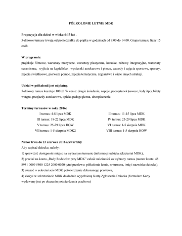 PÓŁKOLONIE LETNIE MDK Propozycja dla dzieci w wieku 6-13 lat . 5-dniowe turnusy trwają od poniedziałku do piątku w godzinach od 9.00 do 14.00. Grupa turnusu liczy 15 osób. W programie: projekcje filmowe, warsztaty muzyczne, warsztaty plastyczne, karaoke, zabawy integracyjne, warsztaty ceramiczne, wyjścia na kąpielisko , wycieczki autokarowe i piesze, zawody i zajęcia sportowe, spacery, zajęcia świetlicowe, pierwsza pomoc, zajęcia tematyczne, żeglarstwo i wiele innych atrakcji. Udział w półkolonii jest odpłatny. 5-dniowy turnus kosztuje 100 zł. W cenie: drugie śniadanie, napoje, poczęstunek (owoce, lody itp.), bilety wstępu, przejazdy autokarowe, opieka pedagogiczna, ubezpieczenie. Terminy turnusów w roku 2016: I turnus: 4-8 lipca MDK II turnus: 11-15 lipca MDK III turnus: 18-22 lipca MDK IV turnus: 25-29 lipca MDK V turnus: 25-29 lipca HOW VI turnus: 1-5 sierpnia MDK VII turnus: 1-5 sierpnia MDK2 VIII turnus: 1-5 sierpnia HOW Nabór trwa do 23 czerwca 2016 (czwartek): Aby zapisać dziecko, należy: 1) sprawdzić dostępność miejsc na wybranym turnusie (informacji udziela sekretariat MDK), 2) przelać na konto „Rady Rodziców przy MDK” całość należności za wybrany turnus (numer konta: 48 8951 0009 5500 1225 2000 0020 tytuł przelewu: półkolonia letnia, nr turnusu, imię i nazwisko dziecka), 3) okazać w sekretariacie MDK potwierdzenie dokonanego przelewu, 4) złożyć w sekretariacie MDK dokładnie wypełnioną Kartę Zgłoszenia Dziecka (formularz Karty wydawany jest po okazaniu potwierdzenia przelewu) I turnus: 4-8 lipca MDK Grupa: Dzieci z klas IV – VI SP (M. Ślazyk, R. Bryk) Poniedziałek 04.07.2016 9.00- 10.30 Zabawy integracyjne “Poznajmy się” – podwórko MDK 10.30 – 10.45 przerwa śniadaniowa 10.45- 14.00 zajęcia plastyczne „Pod chmurką” – podwórko MDK Wtorek 05.07.2016 9.00- 10.30 Warsztaty ceramiczne 10.30 – 10.45 przerwa śniadaniowa 10.45 – 14.00 warsztaty muzyczne Środa 06.07.2016 9.00-14.00 „Wakacje nad wodą” czyli na czym polega praca ratownika wodnego - wycieczka nad jezioro Sarcz – warsztaty z drużyną WOPR MDK Anioły. Czwartek 07.07.2016 9.00- 14.00 Wycieczka do Parku Grzybowego w Piłce Piątek 08.07.2016 9.00 – 10.30 „ A to było tak…”– wspólne oglądanie prezentacji ze zdjęciami z minionego tygodnia, dzielenie się wspomnieniami - sala teatralna 10.15 -10.30 przerwa śniadaniowa 10.30- 12.30 Śpiewamy największe przeboje muzyki polskiej – zabawy karaoke. 12.30 – 14.00 Grill – podwórko MDK II turnus: 11-15 lipca MDK Tematyka: Kultury, języki i gry świata Grupa: 10-13 lat (K.Jaworski) Poniedziałek 11.07.2016 9.00- 10.30 Zdobądź MDK – teambuilding, zadania integracyjne 10.30 – 10.45 przerwa śniadaniowa 10.45- 14.00 Zdobądź MDK cd. - teambuilding Wtorek 12.07.2016 9.00- 10.30 Język hiszpański i kraje hiszpańskojęzyczne poprzez gry i zabawy 10.30 – 10.45 przerwa śniadaniowa 10.45 – 14.00 Język chiński i kraje dalekiej Azji poprzez gry i zabawy Środa 13.07.2016 8:00-16:00 Wyjazd do Parku edukacyjno-rozrywkowego (Park Miniatur) koło Stęszewa Czwartek 14.07.2016 9.00-14.00 Gry i zabawy europejskie nad wodą przy współpracy z WOPR MDK Anioły. Piątek 15.07.2016 9.00 – 10.30 Mission Impossible – gra miejska 10.30 -10.45 przerwa śniadaniowa 10.45- 14.00 Mission Impossible – gra miejska cd. III turnus: 18-22 lipca MDK Grupa: Dzieci z klas I – VI SP E. Umański Warsztaty modelarskie w ramach półkolonii letnich przeznaczone są dla dzieci, które chciałyby kreatywnie spędzać swój wolny czas. Podczas tych zająć nauczą się budować modele szybowców swobodnie latających. Stopniowo przejdą przez wszystkie etapy ich powstawania. Rozwiną przy tym swoje zdolności manualne. Dzieci po zakończeniu tych warsztatów będą potrafili zbudować swój pierwszy latający model , będą umieli go oblatać jak i startować w przyszłości tego rodzajami modeli w zawodach. Organizatorzy przewidują również zorganizowanie jednodniowej wycieczki do atrakcyjnego miejsca w okolicy Trzcianki. Poniedziałek 18.07.2016 9.00- 10.30 Zabawy integracyjne “Poznajmy się” – podwórko MDK 10.30 – 10.45 przerwa śniadaniowa 10.45- 14.00 budowa modeli pod okiem instruktora Wtorek 19.07.2016 9.00- 10.30 budowa modeli pod okiem instruktora 10.30 – 10.45 przerwa śniadaniowa 10.45 – 14.00 budowa modeli pod okiem instruktora Środa 20.07.2016 9.00- 10.30 oblatywanie modeli i drobne poprawki (OSiR) 10.30 – 10.45 przerwa śniadaniowa 10.45 – 14.00 oblatywanie modeli i drobne poprawki (OSiR) Czwartek 21.07.2016 9.00-14.00 Latanie na lotnisku w Pile i pokazy modeli RC Piątek 22.07.2016 9.00 – 9:30 spotkanie organizacyjne MDK 9:30-10:00 wyjście na przystań HOW 10:00 – 10:30 przerwa śniadaniowa 10:30-14.00 Pokazy modeli na OSiR Trzcianka, grill HOW IV turnus: 25-29 lipca MDK I-VI SP D. Wiśniewska, D. Kaczmarzewska 25.07.2016 r. filmowy poniedziałek 9:00 – 9:30 zbiórka dzieci, lista obecności 9:35 –10.30 przedstawienie i zapoznanie z planem dnia, zajęcia świetlicowe 10:30 –11.00 przerwa śniadaniowa 11:00 – 12.30 prelekcja filmu przyrodniczego, zabawy edukacyjne 12:30 – 13.30 gry i zabawy ruchowe 13:30 –14.00 czas na owoc 14:00 – odbiór dzieci 26.07.2016 r. sportowy wtorek 9:00 – 9:30 zbiórka dzieci, lista obecności 9:35 –10.30 przedstawienie i zapoznanie z planem dni, zajęcia świetlicowe 10:30 – 11.00 przerwa śniadaniowa 11:00 – 12,30 zawody i zajęcia sportowe na świeżym powietrzu- podwórze MDK 12:30 – 13.30 gry planszowe (gra 5 sekund, bingo, eurobiznes, chińczyk)) 13:30 –14.00 czas na owoc 14:00 – odbiór dzieci 27.07.2016 r. wycieczkowa środa Wycieczka autokarowa do Poznania- zwiedzanie miasta (godziny i plan podany później) 28.07.2016 r. kreatywny czwartek 9:00 – 9:30 zbiórka dzieci, lista obecności 9:35 –10.00 przedstawienie i zapoznanie z planem dnia, zajęcia świetlicowe 10:00 –10.30 przerwa śnia