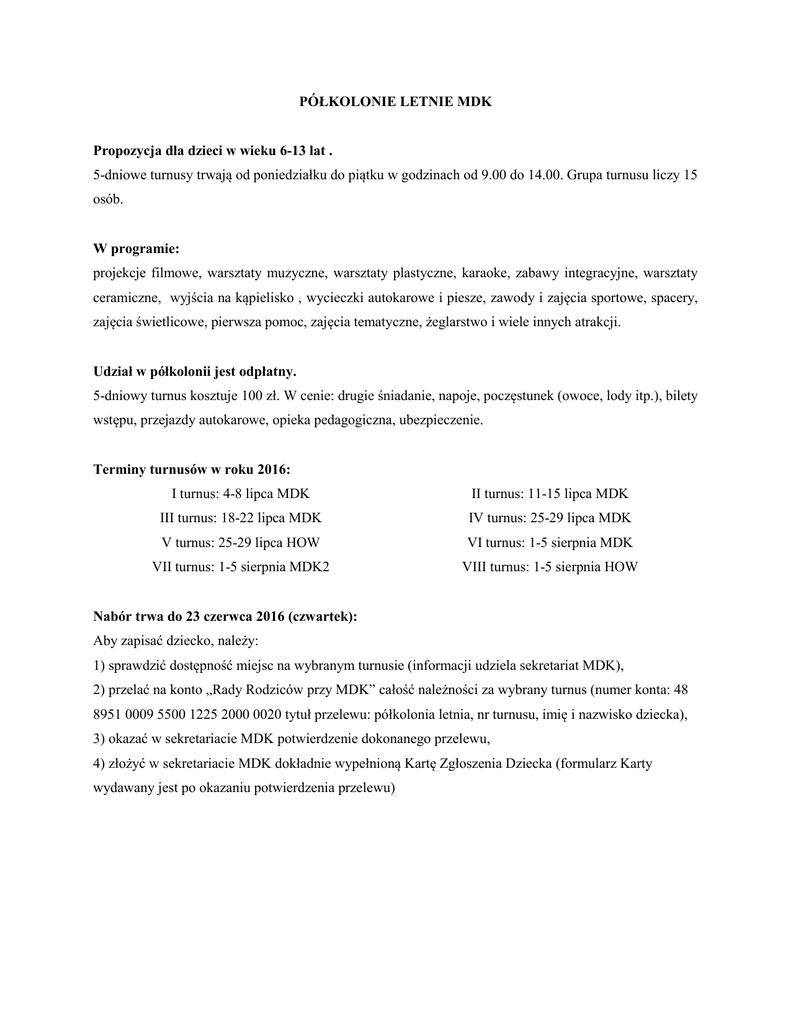 PÓŁKOLONIE LETNIE MDK Propozycja dla dzieci w wieku 6