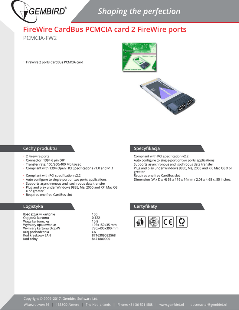 FireWire CardBus PCMCIA card 2 FireWire ports PCMCIA-FW2 - FireWire 2 ports CardBus PCMCIA card Cechy produktu Specyfikacja - Compliant with PCI specification v2.2 Auto configure to single-port or two ports applications Supports asynchronous and isochroous data transfer Plug and play under Windows 98SE, Me, 2000 and XP, Mac OS X or greater Requires one free CardBus slot Dimension (W x D x H) 53 x 119 x 14mm / 2.08 x 4.68 x .55 inches. 2 Firewire ports Connector: 1394 6 pin DIP Transfer rate: 100/200/400 Mbits/sec Compliant with 1394 Open HCI Specifications v1.0 and v1.1 - Compliant with PCI specification v2.2 Auto configure to single-port or two ports applications Supports asynchronous and isochroous data transfer Plug and play under Windows 98SE, Me, 2000 and XP, Mac OS X or greater - Requires one free CardBus slot Logistyka Certyfikaty Ilość sztuk w kartonie Objętość kartonu Waga kartonu, kg Wymiary opakowania: Wymiary kartonu DxSxW Kraj pochodzenia Kod kreskowy EAN Kod celny 100 0.122 10.8 195x150x35 mm 780x400x390 mm CN 8716309032568 8471800000 Copyright © 2009–2017, Gembird Software Ltd. ! " # $ ! "