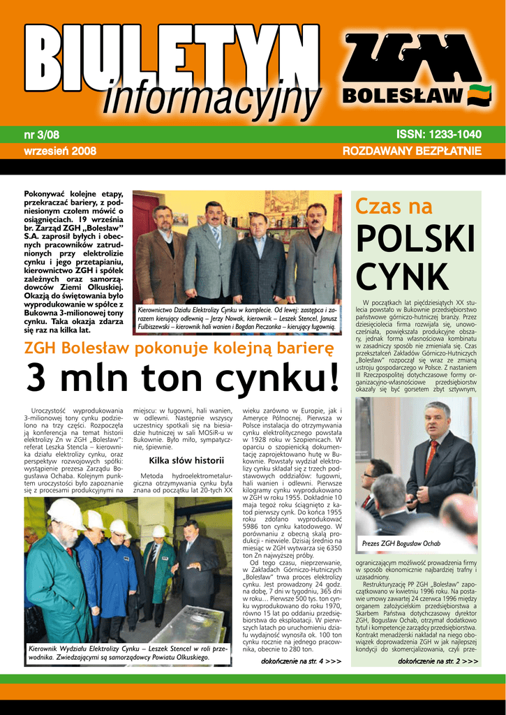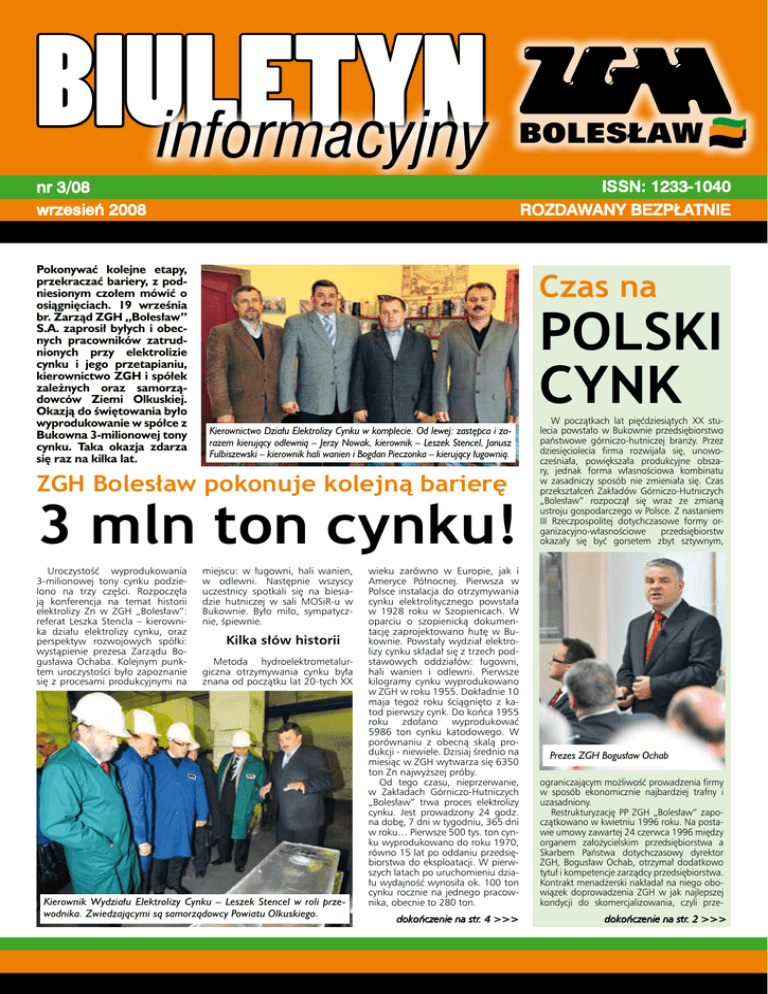 BIULETYN informacyjny BOLESŁAW ISSN: 1233-1040 nr 3/08 wrzesień 2008 Pokonywać kolejne etapy, przekraczać bariery, z podniesionym czołem mówić o osiągnięciach. 19 września br. Zarząd ZGH „Bolesław” S.A. zaprosił byłych i obecnych pracowników zatrudnionych przy elektrolizie cynku i jego przetapianiu, kierownictwo ZGH i spółek zależnych oraz samorządowców Ziemi Olkuskiej. Okazją do świętowania było wyprodukowanie w spółce z Bukowna 3-milionowej tony cynku. Taka okazja zdarza się raz na kilka lat. ROZDAWANY BEZPŁATNIE Czas na POLSKI CYNK Kierownictwo Działu Elektrolizy Cynku w komplecie. Od lewej: zastępca i zarazem kierujący odlewnią – Jerzy Nowak, kierownik – Leszek Stencel, Janusz Fulbiszewski – kierownik hali wanien i Bogdan Pieczonka – kierujący ługownią. ZGH Bolesław pokonuje kolejną barierę 3 mln ton cynku! Uroczystość wyprodukowania 3-milionowej tony cynku podzielono na trzy części. Rozpoczęła ją konferencja na temat historii elektrolizy Zn w ZGH „Bolesław”: referat Leszka Stencla – kierownika działu elektrolizy cynku, oraz perspektyw rozwojowych spółki: wystąpienie prezesa Zarządu Bogusława Ochaba. Kolejnym punktem uroczystości było zapoznanie się z procesami produkcyjnymi na miejscu: w ługowni, hali wanien, w odlewni. Następnie wszyscy uczestnicy spotkali się na biesiadzie hutniczej w sali MOSiR-u w Bukownie. Było miło, sympatycznie, śpiewnie. Kilka słów historii Metoda hydroelektrometalurgiczna otrzymywania cynku była znana od początku lat 20-tych XX Kierownik Wydziału Elektrolizy Cynku – Leszek Stencel w roli przewodnika. Zwiedzającymi są samorządowcy Powiatu Olkuskiego. wieku zarówno w Europie, jak i Ameryce Północnej. Pierwsza w Polsce instalacja do otrzymywania cynku elektrolitycznego powstała w 1928 roku w Szopienicach. W oparciu o szopienicką dokumentację zaprojektowano hutę w Bukownie. Powstały wydział elektrolizy cynku składał się z trzech podstawowych oddziałów: ługowni, hali wanien i odlewni. Pierwsze kilogramy cynku wyprodukowano w ZGH w roku 1955. Dokładnie 10 maja tegoż roku ściągnięto z katod pierwszy cynk. Do końca 1955 roku zdołano wyprodukować 5986 ton cynku katodowego. W porównaniu z obecną skalą produkcji - niewiele. Dzisiaj średnio na miesiąc w ZGH wytwarza się 6350 ton Zn najwyższej próby. Od tego czasu, nieprzerwanie, w Zakładach Górniczo-Hutniczych „Bolesław” trwa proces elektrolizy cynku. Jest prowadzony 24 godz. na dobę, 7 dni w tygodniu, 365 dni w roku… Pierwsze 500 tys. ton cynku wyprodukowano do roku 1970, równo 15 lat po oddaniu przedsiębiorstwa do eksploatacji. W pierwszych latach po uruchomieniu działu wydajność wynosiła ok. 100 ton cynku rocznie na jednego pracownika, obecnie to 280 ton. dokończenie na str. 4 >>> W początkach lat pięćdziesiątych XX stulecia powstało w Bukownie przedsiębiorstwo państwowe górniczo-hutniczej branży. Przez dziesięciolecia firma rozwijała się, unowocześniała, powiększała produkcyjne obszary, jednak forma własnościowa kombinatu w zasadniczy sposób nie zmieniała się. Czas przekształceń Zakładów Górniczo-Hutniczych „Bolesław” rozpoczął się wraz ze zmianą ustroju gospodarczego w Polsce. Z nastaniem III Rzeczpospolitej dotychczasowe formy organizacyjno-własnościowe przedsiębiorstw okazały się być gorsetem zbyt sztywnym, Prezes ZGH Bogusław Ochab ograniczającym możliwość prowadzenia firmy w sposób ekonomicznie najbardziej trafny i uzasadniony. Restrukturyzację PP ZGH „Bolesław” zapoczątkowano w kwietniu 1996 roku. Na postawie umowy zawartej 24 czerwca 1996 między organem założycielskim przedsiębiorstwa a Skarbem Państwa dotychczasowy dyrektor ZGH, Bogusław Ochab, otrzymał dodatkowo tytuł i kompetencje zarządcy przedsiębiorstwa. Kontrakt menadżerski nakładał na niego obowiązek doprowadzenia ZGH w jak najlepszej kondycji do skomercjalizowania, czyli przedokończenie na str. 2 >>> Czas na POLSKI CYNK dokończenie ze str. 1 >>> kształcenia w jednoosobową spółkę Skarbu Państwa. 8 grudnia 2003 roku minister Skarbu Państwa podpisał dokument konwersji PP ZGH „Bolesław” w spółkę akcyjną, której jedynym akcjonariuszem został Skarb Państwa. ZGH „Bolesław” S.A. zostały zarejestrowane w sądzie 6 lutego 2004 roku. W tej formule właścicielskiej działają po dziś. Jak długo jeszcze? Polski Cynk 19 września 2008 roku, podczas uroczystości związanych z wyprodukowaniem w ZGH „Bolesław” S.A. 3 mln. tony cynku elektronicznego, prezes i dyrektor naczelny Bogusław Ochab przedstawił bieżącą sytuację spółki, osiągnięcia i zagrożenia oraz zarysował plan rozwoju firmy na najbliższe lata. - Według zweryfikowanej strategii rozwoju ZGH „Bolesław” S.A., uwzględniającej aktualną sytuację na światowych rynkach metali kolorowych, pozycję dolara amerykańskiego i gwałtownie drożejącą energię, należałoby powołać grupę „Polski Cynk”, która mogłaby skuteczniej konkurować na światowym rynku Zn – powiedział Bogusław Ochab. - Uważamy – kontynuował prezes Zarządu spółki z Bukowna - że jeśli są w Polsce dwie firmy produkujące cynk – ZGH „Bolesław” S.A i Huta Cynku Miasteczko Śląskie – to warto doprowadzić do ich konsolidacji. Będziemy wnosić do Ministerstwa Skarbu projekt, w myśl którego właściciel (Skarb Państwa) dokona podniesienia kapitału ZGH „Bolesław” S.A poprzez wniesienie do niej akcji Huty Cynku Miasteczko Śląskie. Wówczas Huta z Miasteczka Śląskiego stałaby się kolejną spółką zależną ZGH. Powstała w procesie konsolidacji Grupa „Polski Cynk” produkowałaby docelowo blisko 200 tys. ton cynku rocznie. W wyniku konsolidacji wystąpiłaby synergia. Jej efektem – oszczędności rzędu 15 mln. zł rocznie. Nowa, skonsolidowana spółka, produkująca cynk efektywniej, mogłaby trafić na giełdę w roku 2010. Pozyskane w wyn
