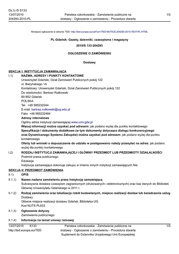 Dz.U./S S133 13/07/2010 204293-2010-PL Państwa członkowskie - Zamówienie publiczne na dostawy - Ogłoszenie o zamówieniu - Procedura otwarta 1/5 Niniejsze ogłoszenie w witrynie TED: http://ted.europa.eu/udl?uri=TED:NOTICE:204293-2010:TEXT:PL:HTML PL-Gdańsk: Gazety, dzienniki, czasopisma i magazyny 2010/S 133-204293 OGŁOSZENIE O ZAMÓWIENIU Dostawy SEKCJA I: INSTYTUCJA ZAMAWIAJĄCA I.1) NAZWA, ADRESY I PUNKTY KONTAKTOWE Uniwersytet Gdański, Dział Zamówień Publicznych pokój 122 ul. Bażyńskiego 1A Kontaktowy: Uniwersytet Gdański, Dział Zamówień Publicznych pokój 122 Do wiadomości: Bartosz Rutkowski 80-952 Gdańsk POLSKA Tel. +48 585232344 E-mail: [email protected] Faks +48 585232484 Adresy internetowe Ogólny adres instytucji zamawiającej www.univ.gda.pl Więcej informacji można uzyskać pod adresem: jak podano wyżej dla punktu kontaktowego Specyfikacje i dokumenty dodatkowe (w tym dokumenty dotyczące dialogu konkurencyjnego oraz Dynamicznego Systemu Zakupów) można uzyskać pod adresem: jak podano wyżej dla punktu kontaktowego Oferty lub wnioski o dopuszczenie do udziału w postępowaniu należy przesyłać na adres: jak podano wyżej dla punktu kontaktowego I.2) RODZAJ INSTYTUCJI ZAMAWIAJĄCEJ I GŁÓWNY PRZEDMIOT LUB PRZEDMIOTY DZIAŁALNOŚCI Podmiot prawa publicznego Edukacja Instytucja zamawiająca dokonuje zakupu w imieniu innych instytucji zamawiających Nie SEKCJA II: PRZEDMIOT ZAMÓWIENIA II.1) OPIS II.1.1) Nazwa nadana zamówieniu przez instytucję zamawiającą Sukcesywna dostawa czasopism zagranicznych (drukowanych i elektronicznych) oraz baz danych do Biblioteki Głównej Uniwersytetu Gdańskiego w 2011 r. II.1.2) Rodzaj zamówienia oraz lokalizacja robót budowlanych, miejsce realizacji dostaw lub świadczenia usług Dostawy Główne miejsce realizacji dostawy Gdańsk, Biblioteka UG. Kod NUTS PL633 II.1.3) Ogłoszenie dotyczy Zamówienia publicznego II.1.4) Informacje na temat umowy ramowej 13/07/2010 S133 http://ted.europa.eu/TED Państwa członkowskie - Zamówienie publiczne na dostawy - Ogłoszenie o zamówieniu - Procedura otwarta Suplement do Dziennika Urzędowego Unii Europejskiej 1/5 Dz.U./S S133 13/07/2010 204293-2010-PL Państwa członkowskie - Zamówienie publiczne na dostawy - Ogłoszenie o zamówieniu - Procedura otwarta 2/5 II.1.5) Krótki opis zamówienia lub zakupu(ów) Sukcesywna dostawa czasopism zagranicznych (drukowanych i elektronicznych) oraz baz danych do Biblioteki Głównej Uniwersytetu Gdańskiego w 2011 r. Spis tytułów znajduje się w załaczniku nr 2 dla części I i II. II.1.6) Wspólny Słownik Zamówień (CPV) 22200000, 22212000, 79980000 II.1.7) Zamówienie jest objęte Porozumieniem w sprawie zamówień rządowych (GPA) Nie II.1.8) Podział na części Tak oferty należy składać w odniesieniu do jednej lub więcej części II.1.9) Dopuszcza się składanie ofert wariantowych Nie II.2) WIELKOŚĆ LUB ZAKRES ZAMÓWIENIA II.2.1) Całkowita wielkość lub zakres Bez VAT 1 742 152,00 PLN II.2.2) Opcje Nie II.3) CZAS TRWANIA ZAMÓWIENIA LUB TERMIN REALIZACJI Okres w miesiącach: 18 (od udzielenia zamówienia): INFORMACJE NA TEMAT CZĘŚCI CZĘŚĆ NR 1 NAZWA Część I 1) KRÓTKI OPIS Czasopisma dostarczane drogą pocztową. 2) WSPÓLNY SŁOWNIK ZAMÓWIEŃ (CPV) 22200000, 22212000, 79980000 3) WIELKOŚĆ LUB ZAKRES 4) WSKAZANIE INNEJ DATY ROZPOCZĘCIA PROCEDURY UDZIELANIA ZAMÓWIENIA I/LUB CZASU TRWANIA ZAMÓWIENIA 5) INFORMACJE DODATKOWE NA TEMAT CZĘŚCI ZAMÓWIENIA CZĘŚĆ NR 2 NAZWA Część 2 1) KRÓTKI OPIS Czasopisma dostarczane w trybie przyspieszonym (dostawa kurierska). 2) WSPÓLNY SŁOWNIK ZAMÓWIEŃ (CPV) 22200000, 22212000, 79980000 3) WIELKOŚĆ LUB ZAKRES 4) WSKAZANIE INNEJ DATY ROZPOCZĘCIA PROCEDURY UDZIELANIA ZAMÓWIENIA I/LUB CZASU TRWANIA ZAMÓWIENIA 13/07/2010 S133 http://ted.europa.eu/TED Państwa członkowskie - Zamówienie publiczne na dostawy - Ogłoszenie o zamówieniu - Procedura otwarta Suplement do Dziennika Urzędowego Unii Europejskiej 2/5 Dz.U./S S133 13/07/2010 204293-2010-PL 5) Państwa członkowskie - Zamówienie publiczne na dostawy - Ogłoszenie o zamówieniu - Procedura otwarta 3/5 INFORMACJE DODATKOWE NA TEMAT CZĘŚCI ZAMÓWIENIA SEKCJA III: INFORMACJE O CHARAKTERZE PRAWNYM, EKONOMICZNYM, FINANSOWYM I TECHNICZNYM III.1) WARUNKI DOTYCZĄCE ZAMÓWIENIA III.1.1) Wymagane wadia i gwarancje Część I - wadium: 57 960,00 PLN. Część II - wadium: 2 040,00 PLN. III.1.2) Główne warunki finansowania i płatności i/lub odniesienie do odpowiednich przepisów je regulujących Zamawiający zapłaci Wykonacy z góry. III.1.3) Forma prawna, jaką musi przyjąć grupa wykonawców, której zostanie udzielone zamówienie III.1.4) Inne szczególne warunki, którym podlega realizacja zamówienia Nie III.2) WARUNKI UDZIAŁU III.2.1) Sytuacja podmiotowa wykonawców, w tym wymogi dotyczące wpisu do rejestru zawodowego lub handlowego Informacje i formalności konieczne do dokonania oceny spełniania wymogów: O udzielenie zamówienie mogą ubiegać się Wykonawcy, którzy spełniają warunki dotyczące: 1. posiadania uprawnień do wykonywania określonej działalności lub czynności, jeżeli przepisy prawa nakładają obowiązek ich posiadania - Zamawiający uzna spełnianie warunku na podstawie oświadczenia Wykonawcy (załącznik nr 3) 2. posiadania wiedzy i doświadczenia - Zamawiający uzna spełnianie warunku jeżeli Wykonawca wykaże, że w okresie 3 lat przed upływem terminu składania ofert w niniejszym postępowaniu, a jeżeli okres prowadzenia działalności jest krótszy — w tym okresie, dokonał na terenie kraju lub zagranicy, co najmniej jednej dostawy 400 tytułów dla jednego odbiorcy. Wykaz powinien zawierać nazwy odbiorców, ich adresy, daty wykonania oraz wielkość dostawy, tj. liczba tytułów. Każda dostawa ujęta w wykazie powinna posiadać potwierdzenie wykonania ich należycie (list referencyjny) - załącznik nr 5. 3. dysponowania odpowiednim potencjałem technicznym o
