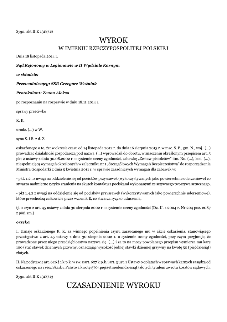 Sygn. akt II K 1318/13 WYROK W IMIENIU RZECZYPOSPOLITEJ POLSKIEJ Dnia 18 listopada 2014 r. Sąd Rejonowy w Legionowie w II Wydziale Karnym w składzie: Przewodniczący: SSR Grzegorz Woźniak Protokolant: Zenon Aleksa po rozpoznaniu na rozprawie w dniu 18.11.2014 r. sprawy przeciwko K. K. urodz. (...) w W. syna S. i B. z d. Z. oskarżonego o to, że: w okresie czasu od 14 listopada 2012 r. do dnia 16 sierpnia 2013 r. w msc. S. P., gm. N., woj. (...) prowadząc działalność gospodarczą pod nazwą (...) wprowadził do obrotu, w znaczeniu określonym przepisem art. 5 pkt 2 ustawy z dnia 30.08.2002 r. o systemie oceny zgodności, zabawkę „Zestaw pistoletów” itm. No. (...), kod (...), niespełniającą wymagań określonych w załączniku nr 1 „Szczegółowych Wymagań Bezpieczeństwa” do rozporządzenia Ministra Gospodarki z dnia 5 kwietnia 2011 r. w sprawie zasadniczych wymagań dla zabawek w: - pkt. 1.2., z uwagi na oddzielenie się od pocisków przyssawek (wykorzystywanych jako powierzchnie uderzeniowe) co stwarza nadmierne ryzyko zranienia na skutek kontaktu z pociskami wykonanymi ze sztywnego tworzywa sztucznego, - pkt 1.4.2 z uwagi na oddzielenie się od pocisków przyssawek (wykorzystywanych jako powierzchnie uderzeniowe), które przechodzą całkowicie przez wzornik E, co stwarza ryzyko uduszenia, tj. o czyn z art. 45 ustawy z dnia 30 sierpnia 2002 r. o systemie oceny zgodności (Dz. U. z 2004 r. Nr 204 poz. 2087 z póź. zm.) orzeka I. Uznaje oskarżonego K. K. za winnego popełnienia czynu zarzucanego mu w akcie oskarżenia, stanowiącego przestępstwo z art. 45 ustawy z dnia 30 sierpnia 2002 r. o systemie oceny zgodności, przy czym przyjmuje, że prowadzone przez niego przedsiębiorstwo nazywa się (...) i za to na mocy powołanego przepisu wymierza mu karę 100 (stu) stawek dziennych grzywny, oznaczając wysokość jednej stawki dziennej grzywny na kwotę 50 (pięćdziesiąt) złotych. II. Na podstawie art. 626 § 1 k.p.k. w zw. z art. 627 k.p.k. i art. 3 ust. 1 Ustawy o opłatach w sprawach karnych zasądza od oskarżonego na rzecz Skarbu Państwa kwotę 570 (pięćset siedemdziesiąt) złotych tytułem zwrotu kosztów sądowych. Sygn. akt II K 1318/13 UZASADNIENIE WYROKU z dnia 18 listopada 2014 r. Sąd, na podstawie całokształtu materiału dowodowego ujawnionego podczas rozprawy, ustalił następujący stan faktyczny: Oskarżony K. K. prowadził działalność gospodarczą w ramach (...) z siedzibą w S. P., zajmował się między innymi sprowadzaniem zabawek zza granicy i ich sprzedażą w Polsce. Głównie zabawki sprowadzał z C., w listopadzie 2012 r. oskarżony wyjechał do C., zaprezentowano mu tam zabawkę „Zestaw pistoletów” itm. No. 00-85296. Oskarżony zainteresował się tą zabawką i sprowadził jej partię do Polski, a następnie sprzedawał 576 sztuk. W dniu 9 kwietnia 2013 r. (...) Wojewódzki Inspektorat Inspekcji Handlowej przeprowadził inspekcję w hurtowni (...) w R., która zakupiła zabawki pistoletowe sprowadzone przez oskarżonego. W wyniku przeprowadzonych badań okazało się, że stan tych zabawek był niezgodny z załącznikiem nr 1 Szczegółowych Wymagań Bezpieczeństwa do rozporządzenia Ministra Gospodarki z dnia 5 kwietnia 2011 r. w sprawie zasadniczych wymagań dla zabawek. Zabawki te nie spełniały wymagań wyżej wymienionego aktu prawnego, odnośnie: - pkt 1.2, z uwagi na oddzielanie się od pocisku przyssawek wykorzystywanych jako powierzchnie uderzeniowe, co stwarzało nadmierne ryzyko zranienia na skutek uderzenia pocisku, przy czym były one wykonane ze sztywnego tworzywa sztucznego, - pkt 1.4.2., z uwagi na oddzielanie się od pocisków przyssawek, wykorzystywanych jako powierzchnie użytkowe. Badania wskazały, że pociski całkowicie przechodziły przez wzornik E, co stwarzało ryzyko uduszenia. Dowód: - zeznania A. M. (k.28,121-122), - częściowo wyjaśnienia oskarżonego (k.41-42,120-121), - protokół kontroli (k.3-6), - protokół oględzin (k.7), - sprawozdanie z badań (k.8-10), - pismo Prezesa UOKiK (k.17-18). Prezes Urzędu Ochrony Konkurencji i Konsumentów pismem z dnia 3 lipca 2013 r. zawiadomił oskarżonego o wszczęciu postępowania w sprawie niezgodności zabawek z zasadniczymi wymaganiami i wezwał go do podania okoliczności zakupu przedmiotowych zabawek. Oskarżony pismem z dnia 26 lipca 2013 r. udzielił odpowiedzi na pytania Prezesa. Postanowieniem z dnia 26 lipca 2013 r. Prezes Urzędu Ochrony Konkurencji i Konsumentów wyznaczył oskarżonemu termin 21 dni na wycofanie ww. wyrobów z obrotu i poinformowanie odbiorców o stwierdzonych niezgodnościach. W dniu 15 sierpnia 2013 r. oskarżony przesłał pismo, z którego wynikało, że wykonał nałożony na niego obowiązek, powiadomił odbiorców o niezgodności wyrobu z zasadniczymi wymaganiami i zamieścił ogłoszenie o tym w gazecie ogólnopolskiej, a w późniejszym terminie również na swej stronie internetowej. Decyzją z dnia 13 listopada 2013 r. Prezes Urzędu Ochrony Konkurencji i Konsumentów umorzył postępowanie wobec oskarżonego w sprawie wprowadzenia do obrotu przedmiotowych zabawek. Dowód: - częściowo wyjaśnienia oskarżonego (k.41-42,120-121), - decyzja Prezesa UOKiK (k.46-48). Oskarżony w toku postępowania przygotowawczego nie przyznał się do popełnienia zarzucanego mu czynu i złożył wyjaśnienia (k.41-42). Wyjaśnił, że prowadzi działalność gospodarczą polegającą na imporcie zabawek z C.. W czerwcu 2012 r. był w C., zaprezentowano mu m.in. zabawkę „Zestaw pistoletów”, poprosił chińskiego producenta o oryginalne dokumenty dopuszczającą tą zabawkę do handlu na rynku unijnym. Producent przedstawił mu dokument dopuszczenia zabawki na rynek unijny, czyli test raport (...). Partię zabawek kupił w listopadzie 2012 r., nie podejrzewał, że z zabawką było coś nie tak. W dniu 3 lipca 2013 r. otrzymał pismo z Urzędu Ochrony Konkurencji i Konsumentów o tym, że zabawkę należy wycofać 