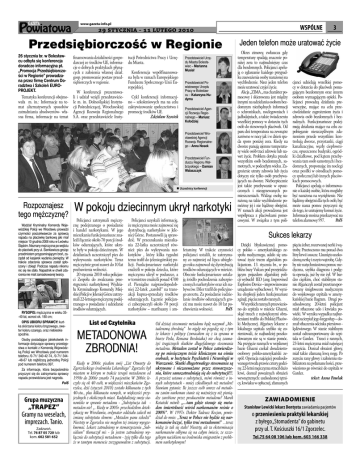 www.gazeta-info.pl WSPÓLNE stycznia - lutego Przedsiębiorczość w Regionie 26 stycznia br. w Bolesławcu odbyła się konferencja doradczo informacyjna pt. „Promocja Przedsiębiorczości w Regionie” prowadzana przez firmę Centrum Doradztwa i Szkoleń EUROPROJEKT. Tematyka konferencji obejmowała m. in.: Informacje na temat alternatywnych sposobów zatrudniania absolwentów- własna firma, informacje na temat finansowania działalności gospodarczej ze środków UE, informacje o dobrych praktykach płynących z założenia własnej dział. gosp. promowanie postaw przedsiębiorczych w regionie. W konferencji prezentowali i udział wzięli przedstawiciele m. in. Dolnośląskiej Instytucji Pośredniczącej, Wrocławskiej Agencji Rozwoju Regionalnego S.A. oraz przedstawiciele Insty- tucji Pośrednictwa Pracy i Urzędu Miasta. Konferencja współfinansowana była w ramach Europejskiego Funduszu Społecznego Unii Europejskiej. Cykl konferencji informacyjno – szkoleniowych ma na celu zaktywizowanie społeczeństwa i promocję środków UE. Zdzisław Szostek Przedstawiciel Urzędu Miasta Bolesławiec – Marianna Musiał Przedstawiciel Powiatowego Urzędu Pracy w Bolesławcu – Katarzyna Hudyma Przedstawiciel Agencji Rozwoju Regionalnego – Mariusz Kołodziej Przedstawiciel Wrocławskiej Agencji Rozwoju Regionalnego – Anna Nosek Przedstawiciel Funduszu Regionu Wałbrzyskiego – Damian Walaszczyk Uczestnicy konferencji Rozpoznajesz tego mężczyznę? Wydział Kryminalny Komendy Wojewódzkiej Policji we Wrocławiu prowadzi czynności poszukiwawcze za sprawcą napadu na placówkę bankową jaki miał miejsce 10 grudnia 2008 roku w Lwówku Śląskim. Nieznany mężczyzna po wejściu do placówki przy ul. Sienkiewicza grożąc przedmiotem przypominającym broń, zażądał od kasjerek wydania pieniędzy. W trakcie zdarzenia sprawca został spłoszony i zbiegł. Podczas napadu nikomu nic się nie stało. Napastnik w chwili zdarzenia nie miał zamaskowanej twarzy. RYSOPIS: mężczyzna w wieku 35-40 lat, wzrost ok. 180 cm; OPIS UBIORU SPRAWCY: kurtka skórzana koloru brązowego, sweter koloru szarego, oraz niebieskie spodnie. Osoby posiadające jakiekolwiek informacje dotyczące sprawcy przestępstwa o kontakt z Komendą Wojewódzką Policji we Wrocławiu pod numerem telefonu /0-71/ 340-42-74, /0-71/ 344-48-67 lub najbliższą jednostką Policji pod numerem telefonu 997. Za informacje, która bezpośrednio przyczyni się do zatrzymania sprawcy napadu przewidziana jest nagroda. PolS Grupa muzyczna „TRAPEZ” Gramy na weselach, imprezach. Tanio. Zadzwoń. Tel. 76 87 05 720 lub kom. 602 581 652 W pokoju dziecinnym ukrył narkotyki Policjanci zatrzymali mężczyznę podejrzanego o posiadanie i handel narkotykami. W jego mieszkaniu funkcjonariusze znaleźli łącznie około 70 porcji środków odurzających, które ukryte były w pokoju dziecinnym. W działaniach uczestniczył pies do wykrywania narkotyków. Teraz mężczyźnie grozi nawet do 10 lat pozbawienia wolności. 20 stycznia 2010 roku policjanci Zespołu do zwalczania przestępczości narkotykowej Wydziału Kryminalnego Komendy Miejskiej Policji w Jeleniej Górze zatrzymali 22-letniego mężczyznę podejrzanego o posiadanie i udzielanie środków odurzających. Policjanci uzyskali informację, że mężczyzna może zajmować się dystrybucją narkotyków w Jeleniej Górze. Postanowili ją sprawdzić. W przeszukaniu mieszkania 22-latka uczestniczył również pies do wykrywania narkotyków , który kilka tygodni temu trafił do jeleniogórskiej policji. Funkcjonariusze narkotyki znaleźli w pokoju dziecka, które mężczyzna ukrył w poduszce, a w tornistrze znaleźli ponad 4700 zł. Pieniądze najprawdopodobniej 22-latek „zarobił” na transakcji kupna-sprzedaży środków odurzających. Łącznie policjanci zabezpieczyli około 70 porcji narkotyków – marihuany i am- List od Czytelnika METADONOWA ZBRODNIA! Kiedy w 2006r. pisałem swój „List Otwarty do Zgorzeleckiego środowiska Lekarskiego” Zgorzelec był miastem w którym w trakcie terapii metadonem od 1998r do 2006r zmarło 74 pacjentów. W 2006r. leczyło się ok 40 osób, w większości mieszkańców Zgorzelca, dziś (styczeń 2010) zostało kilkunastu z tych 40-stu., plus kilkunastu nowych, w większości przyjezdnych z okolicznych miast. Radykalizuję swoje stanowisko w sprawie metadonu - „Substytucja tak metadon nie! „. Kiedy w 2005r. przechodziłem detoksykację we Wrocławiu, ordynator oddziału zalecił mi zmianę substytutu słowem: „Metadon panu szkodzi” Niestety w Zgorzelcu nie mogłem tej zmiany wyegzekwować. Lekarz zatrudniony w stowarzyszeniu „Subsidium” tłumaczył mi: - Ja jestem zatrudniony wyłącznie do substytucji metadonem - żyję tylko dla tego że w tamtym momencie zrezygnowałem z substytucji. 3 Jeden telefon może uratować życie Okres zimowy, zwłaszcza gdy temperatury spadają znacznie poniżej zera to najtrudniejszy czas dla bezdomnych. Policjanci apelują o zgłaszanie każdego przypadku zauważenia osoby narażonej na wychłodzenie. Nasz jeden telefon może uratować czyjeś życie. Akcja „ZIMA „ ma charakter pomocowy i skierowana jest między innymi na udzielaniu osobom bezdomnym niezbędnych informacji o schroniskach, noclegowniach i jadłodajniach, a także świadczeniu wszelkiej pomocy w dotarciu tych osób do stosownych placówek. Od paru dni temperatura na zewnątrz zarówno w nocy jak i w dzień spada sporo poniżej zera. Kiedy na dworze panują ujemne temperatury wiele osób traci zdrowie lub nawet życie. Problem dotyka przede wszystkim osób bezdomnych, samotnych, w podeszłym wieku. Zagrożenie utraty zdrowia lub życia dotyczy nie tylko osób przebywających na dworze. Niebezpiecznie jest także przebywanie w opuszczonych i nieogrzewanych pomieszczeniach. Widząc osobę narażoną na takie wychłodzenie pomóżmy jej i nie bądźmy obojętni. W ramach akcji prowadzona jest współpraca z placówkami pomocowymi.