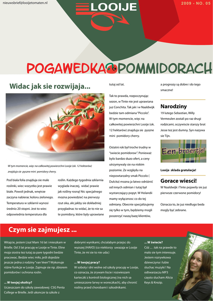 [email protected] 2009 - NO. 05 pogawedka pommidorach Widac jak sie rozwijaja... tutaj od lat. a prognozy są dobre i do tego smaczne! Tak to prawda, rozpoczynając sezon, w Tinte nie jest uprawiana juz Conchita. Tak jak i w Naaldwijk Narodziny bedzie tam odmiana “Piccolo”. 19 lutego Sebastian, Willy W tym momencie, więc na Vermeulen zostali po raz drugi całkowitej powierzchni Looije (ok. rodzicami, oczywiscie starszy brat 12 hektarów) znajduja sie pyszne Jesse tez jest dumny. Syn nazywa mini pomidory cherry. sie Tijn. Ostatni rok był troche trudny w “swiecie pomidorow”. Ponieważ bylo bardzo duzo ofert, a ceny W tym momencie, więc na całkowitej powierzchni Looije (ok. 12 hektarów) utrzymywaly sie na niskim Looije sklada gratulacje! poziomie. Ze względu na znajduja sie pyszne mini pomidory cherry. niepowtarzalny smak Piccolo ( Pod biala folia znajduja sie male roślin. Każdego tygodnia szklarnia Dulcita) mozna ja latwo odróżnić Gorace wiesci! roslinki, wiec wszystko jest prawie wyglada inaczej, widać prawie od innych odmian i tutaj był W Naaldwijk i Tinte pojawily sie juz biale. Powoli jednak, wnętrze jak rośliny rosną! Nic specjalnego wystarczający popyt. W Holandii pierwsze czerwone pomidory! zaczyna nabierac koloru zielonego. mozna powiedzieć na pierwszy mamy wyłącznosc co do tej Temperatura w szklarnii wynosi rzut oka, ale jakby sie dokładniej odmiany. Obecnie specjalizujemy Oznacza to, że juz niedlugo beda średnio 20 stopni. Jest to wiec przygladnac to widać, że to nie sa się tylko w tym, będziemy mogli mogly być zebrane. odpowiednia temperatura dla te pomidory, które byly uprawiane poszerzyć naszą bazę klientów, Czym sie zajmujesz ... Witajcie, jestem Lisa! Mam 16 lat i mieszkam w dobrymi wynikami, chcialabym przejsc do ... W świecie? Brielle. Od 3 lat pracuję w Looije w Tinte. Eline wyzszej (HAVO) (co niektorzy uwazaja w Looije Cóż ... . tak na prawde to moja siostra tez tutaj za pare tygodni bedzie Tinte, że mi sie to nie uda:) malo sie tym interesuje. pracowac. Bedzie wiec miło, jeśli dojedzie Jestem rozrywkowa jeszcze jedna z rodziny “van Veen”! Wykonuje ... W twojej pracy? dziewczyna i lubie różne funkcje w Looije. Zajmuje sie np. zbiorem W soboty i dni wolne od szkoly pracuję w Looije, sluchac muzyki ! Na pomidorów i ochrona roslin. co oznacza, że zrywam liscie i rozwieszam odtwarzaczu MP3 karteczki z kontroli biologicznej (na nich sa często slucham Alicia ... W twojej okolicy? umieszczone larwy w woreczkach), aby chronić Keys & Krezip. Uczeszczam do szkoly zawodowej CSG Penta rosliny przed chorobami i szkodnikami. College w Brielle. Jeśli ukoncze ta szkole z