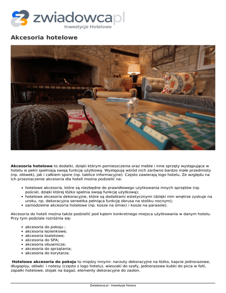 Akcesoria hotelowe Akcesoria hotelowe to dodatki, dzięki którym pomieszczenia oraz meble i inne sprzęty występujące w hotelu w pełni spełniają swoją funkcję użytkową. Występują wśród nich zarówno bardzo małe przedmioty (np. ołówek), jak i całkiem spore (np. tablice informacyjne). Często zawierają logo hotelu. Ze względu na ich przeznaczenie akcesoria dla hoteli można podzielić na: hotelowe akcesoria, które są niezbędne do prawidłowego użytkowania innych sprzętów (np. pościel, dzięki której łóżko spełnia swoją funkcję użytkową); hotelowe akcesoria dekoracyjne, które są dodatkami estetycznymi (dzięki nim wnętrze zyskuje na uroku, np. dekoracyjna serwetka pełniąca funkcję obrusa na stoliku nocnym); samodzielne akcesoria hotelowe (np. kosze na śmieci i kosze na parasole). Akcesoria do hoteli można także podzielić pod kątem konkretnego miejsca użytkowania w danym hotelu. Przy tym podziale rozróżnia się: akcesoria akcesoria akcesoria akcesoria akcesoria akcesoria akcesoria do pokoju ; łazienkowe; toaletowe; do SPA; obuwnicze; do sprzątania; do korytarza. Hotelowe akcesoria do pokoju to między innymi: narzuty dekoracyjne na łóżko, kapcie jednorazowe, długopisy, ołówki i notesy (często z logo hotelu), wieszaki do szafy, jednorazowe kubki do picia w folii, zapałki hotelowe, stojak na bagaż, elementy dekoracyjne do zasłon. Zwiadowca.pl - Inwestycje Horeca Akcesoria do hoteli łazienkowe to głównie akcesoria jednorazowe oraz kosmetyki łazienkowe, jak np. szczoteczka do zębów zapakowana w folię, grzebień zapakowany w folię, małe buteleczki z szamponem do włosów, żelem pod prysznic, balsamem do ciała (często z logo hotelu) itp. Możemy tutaj także wymienić ręczniki i szlafroki. Hotelowe akcesoria toaletowe to przede wszystkim akcesoria jednorazowego użytku, zwiększające higienę, np. jednorazowa torba na brudną bieliznę, torebki jednorazowe na zużyte środki higieniczne itp. Akcesoria do SPA są zbliżone do łazienkowych. Wyróżnia się tu ręczniki oraz szlafroki, różnego rodzaju kosmetyki (przy czym różnorodność tych kosmetyków jest zdecydowanie większa niż w łazience), kapcie jednorazowe, chusteczki do demakijażu, elementy dekoracyjne jak np. wazony z kwiatami itp. Akcesoria obuwnicze to zdecydowanie mała grupa, do której zalicza się np. czyściki do butów oraz pasty do butów. Akcesoria do sprzątania to głównie wszelkiego rodzaju środki czystości oraz gąbki i szmatki, dzięki któremu te preparaty są rozprowadzane. Akcesoria hotelowe do korytarza to przede wszystkim elementy dekoracyjne, jak np. stojące wazony z kwiatami, oraz użytkowe, jak np. kosz na śmieci, kosz na parasol. Zwiadowca.pl - Inwestycje Horeca Powered by TCPDF (www.tcpdf.org)