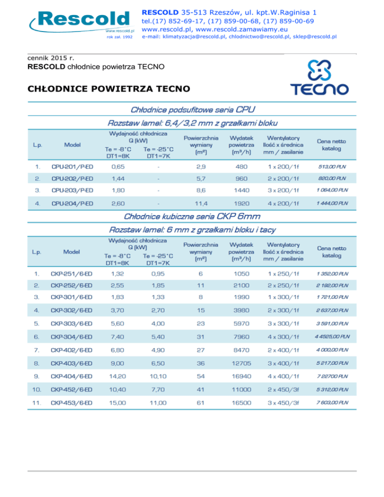 RESCOLD 35-513 Rzeszów, ul. kpt.W.Raginisa 1 tel.(17) 852-69-17, (17) 859-00-68, (17) 859-00-69 www.rescold.pl, www.rescold.zamawiamy.eu rok zał. 1992 e-mail: [email protected], [email protected], [email protected] cennik 2015 r. RESCOLD chłodnice powietrza TECNO CHŁODNICE POWIETRZA TECNO RESCOLD 35-513 Rzeszów, ul. kpt.W.Raginisa 1 tel.(17) 852-69-17, (17) 859-00-68, (17) 859-00-69 www.rescold.pl, www.rescold.zamawiamy.eu rok zał. 1992 e-mail: [email protected], [email protected], [email protected] RESCOLD 35-513 Rzeszów, ul. kpt.W.Raginisa 1 tel.(17) 852-69-17, (17) 859-00-68, (17) 859-00-69 www.rescold.pl, www.rescold.zamawiamy.eu rok zał. 1992 e-mail: [email protected], [email protected], [email protected] *Informacje zawarte w niniejszym cennik nie są prawnie wiążące i nie stanowią oferty handlowej w rozumieniu art. 66 § 1 Kodeksu cywilnego. *Z dniem wprowadzenia niniejszego cennika, wszystkie poprzednie cenniki tracą ważność *Ceny podane w cenniku są cenami netto i nie zawierają podatku VAT *Zastrzega się prawo do wprowadzenia zmian bez powiadomienia