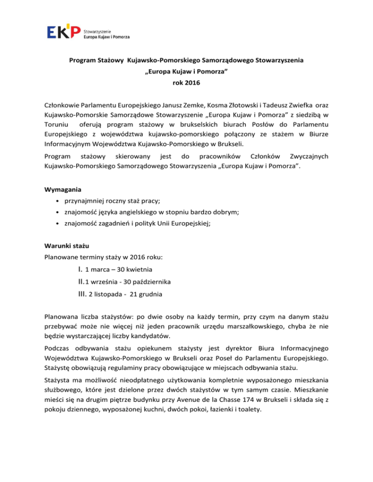 Program Stażowy Kujawsko-Pomorskiego Samorządowego Stowarzyszenia „Europa Kujaw i Pomorza” rok 2016 Członkowie Parlamentu Europejskiego Janusz Zemke, Kosma Złotowski i Tadeusz Zwiefka oraz Kujawsko-Pomorskie Samorządowe Stowarzyszenie „Europa Kujaw i Pomorza” z siedzibą w Toruniu oferują program stażowy w brukselskich biurach Posłów do Parlamentu Europejskiego z województwa kujawsko-pomorskiego połączony ze stażem w Biurze Informacyjnym Województwa Kujawsko-Pomorskiego w Brukseli. Program stażowy skierowany jest do pracowników Członków Zwyczajnych Kujawsko-Pomorskiego Samorządowego Stowarzyszenia „Europa Kujaw i Pomorza”. Wymagania • przynajmniej roczny staż pracy; • znajomość języka angielskiego w stopniu bardzo dobrym; • znajomość zagadnień i polityk Unii Europejskiej; Warunki stażu Planowane terminy staży w 2016 roku: I. 1 marca – 30 kwietnia II. 1 września - 30 października III. 2 listopada - 21 grudnia Planowana liczba stażystów: po dwie osoby na każdy termin, przy czym na danym stażu przebywać może nie więcej niż jeden pracownik urzędu marszałkowskiego, chyba że nie będzie wystarczającej liczby kandydatów. Podczas odbywania stażu opiekunem stażysty jest dyrektor Biura Informacyjnego Województwa Kujawsko-Pomorskiego w Brukseli oraz Poseł do Parlamentu Europejskiego. Stażystę obowiązują regulaminy pracy obowiązujące w miejscach odbywania stażu. Stażysta ma możliwość nieodpłatnego użytkowania kompletnie wyposażonego mieszkania służbowego, które jest dzielone przez dwóch stażystów w tym samym czasie. Mieszkanie mieści się na drugim piętrze budynku przy Avenue de la Chasse 174 w Brukseli i składa się z pokoju dziennego, wyposażonej kuchni, dwóch pokoi, łazienki i toalety. Stażysta otrzyma miesięcznie: równowartość 750 EUR w PLN ze środków stowarzyszenia lub 750 EUR ze środków Parlamentu Europejskiego (w zależności od miejsca odbywania stażu) na pokrycie kosztów związanych z wyżywieniem i transportem komunikacją miejską. W przypadku staży odbywających się w miesiącach marzec – kwiecień, wrzesień – październik: połowa kwoty zostanie przekazana stażyście na podstawie porozumienia zawartego pomiędzy JST delegującą pracownika na staż oraz stowarzyszeniem; druga połowa kwoty zostanie przekazana stażyście na podstawie porozumienia zawartego pomiędzy stażystą a Posłem do Parlamentu Europejskiego. W przypadku stażu odbywającego się w terminie listopad – grudzień stażysta otrzyma odpowiednio: równowartość 750 EUR w PLN ze środków stowarzyszenia lub 750 EUR ze środków Parlamentu Europejskiego (w zależności od miejsca odbywania stażu) za listopad oraz równowartość 520 EUR w PLN ze środków stowarzyszenia lub 520 EUR ze środków Parlamentu Europejskiego (w zależności od miejsca odbywania stażu) za grudzień. Stażysta jest zobowiązany do pokrycia kosztów ubezpieczenia NNW za granicą. Stowarzyszenie zapewnia transport samochodem z Torunia do Brukseli i z powrotem. Stażysta nie otrzymuje dodatkowego wynagrodzenia, nie otrzymuje zwrotu kosztów podróży. Stowarzyszenie nie pokrywa kosztów delegacji zagranicznej wynikających z Rozporządzenia Ministra Pracy i Polityki Społecznej z dnia 29.01.2013 r. w sprawie należności przysługujących pracownikowi zatrudnionemu w państwowej lub samorządowej jednostce sfery budżetowej z tytułu podróży służbowej. Zakres obowiązków Do zadań stażysty należy: 1. Realizacja zadań wskazanych w formularzu, uzasadniających potrzebę odbycia stażu; 2. Udział w codziennej działalności biur, w tym: udział w konferencjach, seminariach i briefingach, nawiązywanie kontaktów i przygotowywanie materiałów informacyjnych po zakończonym wydarzeniu; monitorowanie najnowszych publikacji aktów prawnych UE i zbieranie informacji dotyczących możliwości aplikowania do programów europejskich; przeglądanie agendy instytucji europejskich i informowanie o najbliższych seminariach, konferencjach; przygotowywanie najważniejszych informacji dot. działalności Stowarzyszenia oraz istotnych dla Kujaw i Pomorza wydarzeń unijnych do zamieszczenia na stronie internetowej Stowarzyszenia; przekazywanie informacji o walorach gospodarczych, społecznych, turystycznych i kulturowych województwa kujawsko-pomorskiego oraz umacnianie jego pozytywnego wizerunku; pomoc merytoryczna pracownikom biura w przygotowaniach prezentacji i seminariów; wsparcie w kwestiach organizacyjnych przy konferencjach, seminariach, wizytach studyjnych prowadzonych przez biuro; wyszukiwanie niezbędnych danych kontaktowych i aktualizacja bazy danych; kontaktowanie się z partnerami Stowarzyszenia na polecenie opiekuna stażu i tworzenie sieci kontaktów; wykonywanie dodatkowych poleceń opiekuna stażu. 3. Przygotowanie sprawozdania z odbycia stażu. Proces aplikacyjny • Nabór na wszystkie trzy terminy stażowe odbędzie się w dniach 5 stycznia – 22 stycznia 2016 roku. Informacja o rozpoczęciu naboru zostanie rozesłana drogą mailową do członków Stowarzyszenia oraz umieszczona na stronie internetowej www.ekip.kujawsko-pomorskie.pl Dnia 26 stycznia 2016 r. odbędzie się test z języka angielskiego dla kandydatów spełniających wymogi formalne. O miejscu i godzinie testu kandydaci zostaną poinformowani drogą mailową. Decyzję o zakwalifikowaniu maksymalnie po 5 kandydatów na każdy termin podejmie Zarząd Kujawsko-Pomorskiego Samorządowego Stowarzyszenia „Europa Kujaw i Pomorza” do dnia 29 stycznia 2016 roku. Ostateczną decyzję o wyborze stażystów podejmą Posłowie do Parlamentu Europejskiego wraz z dyrektorem Biura Informacyjnego Województwa KujawskoPomorskiego w Brukseli do 5 lutego br. i tego dnia Stowarzyszenie poinformuje aplikantów drogą mailową o swojej decyzji. W przypadku braku wystarczającej liczby kandydatów, proces aplikacyjny zostanie powtórzony w lutym. Wymagane dokumenty • wypeł