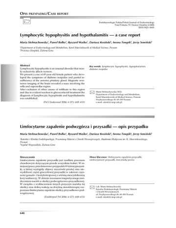 OPIS PRZYPADKU/CASE REPORT Endokrynologia Polska/Polish Journal of Endocrinology Tom/Volume 57; Numer Number 6/2006 ISSN 0423–104X Lymphocytic hypophysitis and hypothalamitis — a case report Maria Stelmachowska1, Paweł Bolko1, Ryszard Waśko1, Dariusz Kosiński2, Iwona Towpik2, Jerzy Sowiński1 1 Department of Endocrinology and Metabolism, Karol Marcinkowski of Medical Science, Poznan Province Hospital, Zielona Gora 2 Abstract Lymphocytic hypophysitis is an unusual disorder that nearly exclusively affects women. We present a case of 69 year-old female patient who developed the symptoms of diabetes insipidus and partial insufficiency of the anterior pituitary gland. Magnetic resonance imaging of the brain revealed a mass involving the sella and suprasellar region. After exclusion of other causes of infiltrate in this region and due to evident reaction to glucocorticoid treatment the diagnosis of lymphocytic hypophisitis and hypothalamitis was established. (Pol J Endocrinol 2006; 6 (57): 648–653) Key words: lymphocytic hypophysitis, hypopituitarism, diabetes insipidus Stelmachowska, M.D. Maria Department of Endocrinology and Metabolism, Karol Marcinkowski of Medical Science, Poznan Przybyszewskiego 49, 60–355 Poznań e-mail: [email protected] Limfocytarne zapalenie podwzgórza i przysadki — opis przypadku Maria Stelmachowska1, Paweł Bolko1, Ryszard Waśko1, Dariusz Kosiński2, Iwona Towpik2, Jerzy Sowiński1 1 Katedra i Klinika Endokrynologii, Przemiany Materii i Chorób Wewnętrznych, Akademia Medyczna im. K. Marcinkowskiego, Poznań 2 Szpital Wojewódzki, Zielona Góra Streszczenie Limfocytarne zapalenie przysadki jest rzadkim procesem chorobowym dotyczącym przede wszystkim kobiet. W niniejszej pracy przedstawiono przypadek 69-letniej pacjentki, u której wystąpiły objawy moczówki prostej oraz niewydolność części gruczołowej przysadki w zakresie czynności gonado- i kortykotropowej z wtórną niewydolnością kory nadnerczy. W obrazie rezonansu magnetycznego uwidoczniono naciek w okolicy podwzgórzowo-przysadkowej. W związku z wykluczeniem innych przyczyn nacieku tej okolicy oraz dobrą reakcją na dożylną steroidoterapię rozpoznano limfocytarne zapalenie okolicy przysadkowo-podwzgórzowej. (Endokrynol Pol 2006; 6 (57): 648–653) 648 Słowa kluczowe: limfocytarne zapalenia przysadki, niedoczynność przysadki, moczówka prosta Maria Stelmachowska Lek. Katedra Endokrynologii, Przemiany Materii i Chorób Wewnętrznych ul. Przybyszewskiego 49, 60–355 Poznań e-mail: [email protected] Endokrynologia Polska/Polish Journal of Endocrinology 2006; 6 (57) Chora, w wieku 69 lat, została przyjęta do Kliniki Endokrynologii, Przemiany Materii i Chorób Wewnętrznych Akademii Medycznej w Poznaniu z powodu podejrzenia nacieku zapalnego w obrębie podwzgórza i przysadki z objawami moczówki prostej oraz z niewydolnością przedniego płata przysadki. Trzy miesiące wcześniej pacjentkę hospitalizowano w Szpitalu Rejonowym na Oddziale Chorób Wewnętrznych z powodu narastającego od kilku tygodni osłabienia, stanów gorączkowych, polidypsji, poliurii oraz zaburzeń gospodarki elektrolitowej. Pacjentka dotychczas poważnie nie chorowała. Przeprowadzono badanie przedmiotowe. Przy przyjęciu chora prezentowała cechy zaburzeń świadomości oraz znacznego odwodnienia. Wyniki podstawowych oznaczeń laboratoryjnych wykazały następujące odchylenia: stężenie białka C-reaktywnego (CRP, C-reactive protein) wynosiło 131 mg/l, Na — 169 mEq/l, K — 3,2 mEq/l, kreatynina — 2,2 mg/dl, glukoza na czczo — 145 mg/dl, ciężar właściwy moczu był niższy niż 1005 g/l. Wstępnie zdiagnozowano nieleczoną dotychczas cukrzycę, ujawnioną w przebiegu infekcji. Wykonano przeglądowe zdjęcie radiologiczne klatki piersiowej, w którym nie wykazano zmian w obrębie pól płucnych. Wynik badania ogólnego oraz posiew moczu wskazywał na zakażenie układu moczowego Escherichia coli. W posiewie krwi nie wyhodowano bakterii ani grzybów. W leczeniu początkowo stosowano płyny infuzyjne, chlorek potasu (KCl, potassium chloride) oraz empiryczną antybiotykoterapię. Po dalszej obserwacji, całokształt obrazu klinicznego oraz wyniki badań laboratoryjnych (podwyższona osmolalność surowicy i obniżona moczu) sugerowały moczówkę prostą. Diagnostykę poszerzono o badanie rezonansu magnetycznego mózgowia, w którym wykazano w lokalizacji podwzgórza wzmacniający się po podaniu środka kontrastowego, obszar naciekowy o wymiarach 23 × 21 × 13 mm obejmujący okolicę nerwów wzrokowych. Strefa nacieku obejmowała również zbiornik siodłowo-nadsiodłowy oraz odnogi tylne torebek wewnętrznych po obu stronach. W trakcie badania stwierdzono ponadto przewlekłe, zaawansowane zmiany nieżytowe przestrzeni obocznych nosa w postaci masywnych polipowatych zgrubień śluzówki i skupisk płynowych wypełniających niemal w całości obie zatoki szczękowe, sitowe, czołowe oraz zatokę klinową. Wykazano także cechy zaniku korowo-podkorowego mózgowia, szczególnie płatów czołowych i skroniowych (ryc. 1). Ze względu na uwidocznione w rezonansie zmiany przypadek chorej był konsultowany przez neurochirurga, laryngologa, onkologa oraz specjalistę chorób Rycina 1. Obraz MR mózgowia po podaniu kontrastu przed steroidoterapią Figure 1. Magnetic resonance imaging scan of the brain after contrast injection before glucocorticoid therapy zakaźnych. Wykonano także nakłucie lędźwiowe, aby skontrolować płyn mózgowo-rdzeniowy. W badaniu tym nie wykazano jednak odchyleń od normy. Wstępnie wykluczono neuroinfekcję, wysuwając podejrzenie guza CUN, bez możliwości interwencji diagnostycznej i terapeutycznej w zakresie stwierdzanej zmiany w warunkach tamtejszego szpitala. W leczeniu zastosowano steroidoterapię (deksametazon 3 × 8 mg i.v.), antybiotykoterapię oraz płyny infuzyjne, uzupełniono także niedobory potasu. Podawanie deksametazonu kontynuowano przez 4 tygodnie. Ste