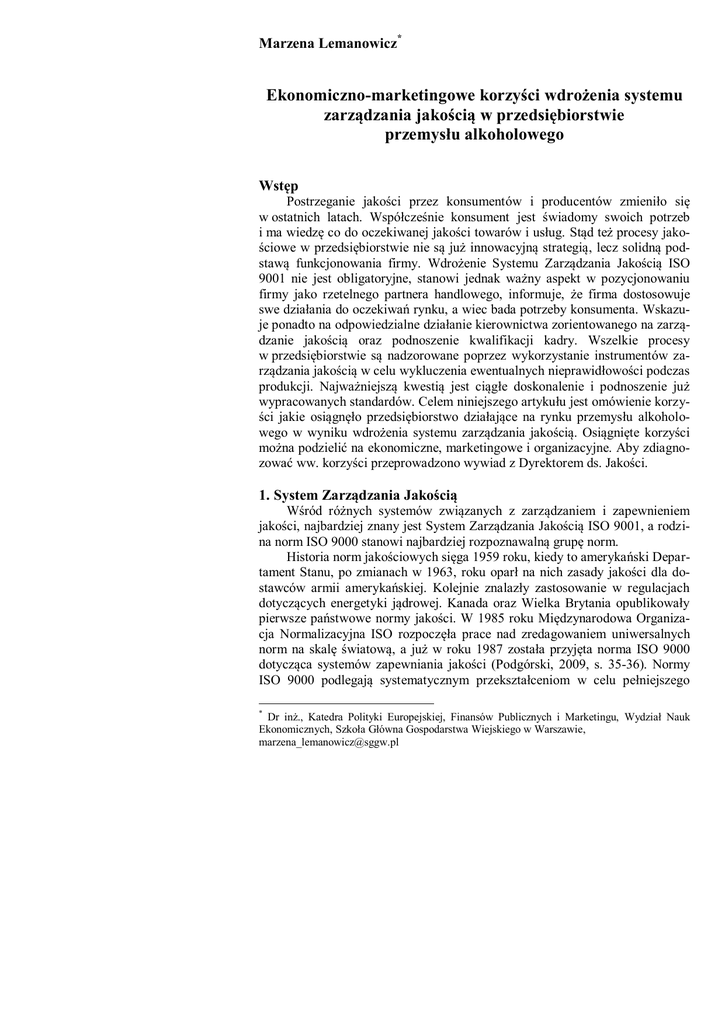 Marzena Lemanowicz* Ekonomiczno-marketingowe korzyści wdrożenia systemu zarządzania jakością w przedsiębiorstwie przemysłu alkoholowego Wstęp Postrzeganie jakości przez konsumentów i producentów zmieniło się w ostatnich latach. Współcześnie konsument jest świadomy swoich potrzeb i ma wiedzę co do oczekiwanej jakości towarów i usług. Stąd też procesy jakościowe w przedsiębiorstwie nie są już innowacyjną strategią, lecz solidną podstawą funkcjonowania firmy. Wdrożenie Systemu Zarządzania Jakością ISO 9001 nie jest obligatoryjne, stanowi jednak ważny aspekt w pozycjonowaniu firmy jako rzetelnego partnera handlowego, informuje, że firma dostosowuje swe działania do oczekiwań rynku, a wiec bada potrzeby konsumenta. Wskazuje ponadto na odpowiedzialne działanie kierownictwa zorientowanego na zarządzanie jakością oraz podnoszenie kwalifikacji kadry. Wszelkie procesy w przedsiębiorstwie są nadzorowane poprzez wykorzystanie instrumentów zarządzania jakością w celu wykluczenia ewentualnych nieprawidłowości podczas produkcji. Najważniejszą kwestią jest ciągłe doskonalenie i podnoszenie już wypracowanych standardów. Celem niniejszego artykułu jest omówienie korzyści jakie osiągnęło przedsiębiorstwo działające na rynku przemysłu alkoholowego w wyniku wdrożenia systemu zarządzania jakością. Osiągnięte korzyści można podzielić na ekonomiczne, marketingowe i organizacyjne. Aby zdiagnozować ww. korzyści przeprowadzono wywiad z Dyrektorem ds. Jakości. 1. System Zarządzania Jakością Wśród różnych systemów związanych z zarządzaniem i zapewnieniem jakości, najbardziej znany jest System Zarządzania Jakością ISO 9001, a rodzina norm ISO 9000 stanowi najbardziej rozpoznawalną grupę norm. Historia norm jakościowych sięga 1959 roku, kiedy to amerykański Departament Stanu, po zmianach w 1963, roku oparł na nich zasady jakości dla dostawców armii amerykańskiej. Kolejnie znalazły zastosowanie w regulacjach dotyczących energetyki jądrowej. Kanada oraz Wielka Brytania opublikowały pierwsze państwowe normy jakości. W 1985 roku Międzynarodowa Organizacja Normalizacyjna ISO rozpoczęła prace nad zredagowaniem uniwersalnych norm na skalę światową, a już w roku 1987 została przyjęta norma ISO 9000 dotycząca systemów zapewniania jakości (Podgórski, 2009, s. 35-36). Normy ISO 9000 podlegają systematycznym przekształceniom w celu pełniejszego * Dr inż., Katedra Polityki Europejskiej, Finansów Publicznych i Marketingu, Wydział Nauk Ekonomicznych, Szkoła Główna Gospodarstwa Wiejskiego w Warszawie, [email protected] 506 Marzena Lemanowicz dostosowania do potrzeb rynku. Obecna czwarta wersja normy to nowelizacja poprzedniego wydania z 2000 roku. W toku pracy Komitetu Technicznego ISO została zredagowana ponadbranżowa wersja rodziny norm ISO 9000:2008, w skład których wchodzą normy: 9000 – Systemy Zarządzania Jakością. Podstawy i terminologia, 9001 Systemy Zarządzania Jakością. Wymagania i 9004 – Zarządzanie ukierunkowane na trwały sukces organizacji. Podejście wykorzystujące zarządzanie jakością [Lisiecka, 2009, s. 30]. Norma ISO 9001:2008 została skonstruowana w oparciu o osiem zasad i jest zbieżna z koncepcją TQM (Total Quality Management). Wśród tych zasad wyróżniamy: 1. Koncentrację na kliencie – oznacza skupienie się na aktualnych oraz przyszłych potrzebach klienta oraz działania w celu ich zaspokojenia. 2. Przywództwo – oznacza, iż kadra kierownicza jest odpowiedzialna za wyznaczenie polityki, celów, strategii i kierunków rozwoju organizacji. Najwyższe kierownictwo odpowiada także za motywowanie i zaangażowanie wszystkich pracowników w rozwój organizacji i stworzenie korzystnych warunków do działania w tym kierunku. 3. Zaangażowanie wszystkich pracowników – jedynie pełne zaangażowanie wszystkich pracowników w realizację strategii i celów organizacji pozwala na maksymalne wykorzystanie jej potencjału w celu uzyskania zamierzonych korzyści. 4. Podejście procesowe – wszystkie działania organizacji traktować (zarządzać nimi) należy jako wzajemnie powiązane i oddziałujące między sobą procesy. 5. Podejście systemowe do zarządzania – polega na zidentyfikowaniu, zrozumieniu i zarządzaniu wzajemnie powiązanymi procesami i traktowaniu ich jako system (zbiór wzajemnie powiązanych i oddziałujących elementów). 6. Ciągłe doskonalenie – oznacza ciągłe, nieprzerwane, systematyczne działania w celu zwiększenia prawdopodobieństwa wzrostu zadowolenia klienta i innych stron. Pomocne są tu metody narzucone przez normę (audit wewnętrzny, działania korygujące i zapobiegawcze, itd.), jak i metody i narzędzia, o których norma nie wspomina (Kaizen, 5S, Six Sigma, FMEA, QFD). 7. Oparcie się na faktach – w procesie decyzyjnym należy opierać się na sprawdzonych i logicznie przeanalizowanych informacjach. 8. Wzajemne korzystne powiązania z dostawcami – organizacja i jej dostawcy są zależni od siebie. Powiązania między nimi powinny być skonstruowane w ten sposób, aby przynosiły obopólną korzyść. Powiązania te powinny pozwalać na szybkie reagowanie w przypadku szybko zmieniającej się sytuacji rynkowej oraz potrzeby klientów. Pozwala to na zwiększenie rentowności organizacji i jej partnerów. Norma ISO 9001:2008 jest podstawą do wdrażania systemu w przedsiębiorstwie. Zawiera ona wzorzec podejścia procesowego, bo to właśnie procesy są podstawą funkcjonowania każdej jednostki. Na rysunku 1 przedstawiono model systemu zarządzania jakością opierający się na podejściu procesowym. Ekonomiczno-marketingowe korzyści wdrożenia systemu… 507 Rysunek 1. Model systemu zarządzania jakością Źródło: [Norma PN-EN ISO 9001:2009…, s. 9]. W przedsiębiorstwach funkcjonujących na rynku spożywczym bardzo ważnym systemem jakościowym jest System ISO 22000:2005. Norma ISO 22000 została przetłumaczo