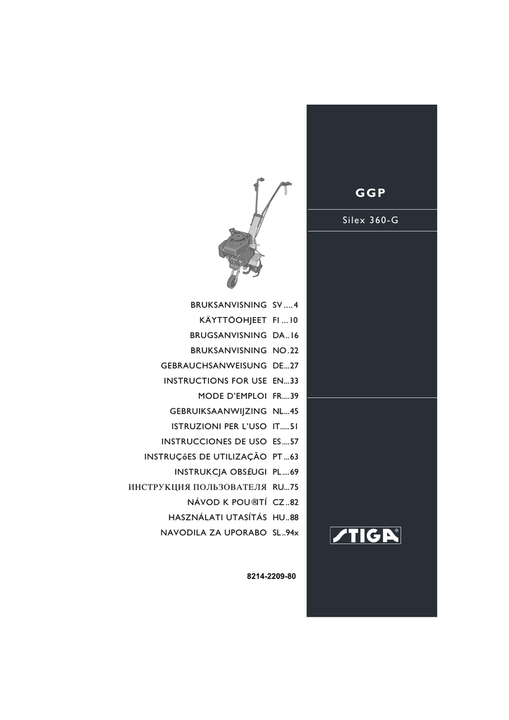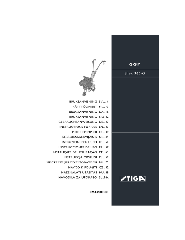 GGP S i l e x 3 60 - G BRUKSANVISNING SV .... 4 KÄYTTÖOHJEET FI ... 10 BRUGSANVISNING DA ..16 BRUKSANVISNING NO .22 GEBRAUCHSANWEISUNG DE...27 INSTRUCTIONS FOR USE EN...33 MODE D’EMPLOI FR....39 GEBRUIKSAANWIJZING NL...45 ISTRUZIONI PER L’USO IT.....51 INSTRUCCIONES DE USO ES ....57 INSTRUÇõES DE UTILIZAÇÃO PT ...63 INSTRUKCJA OBS£UGI PL ....69 »HC“P”K÷»fl œOÀ‹«Œ¬¿“EÀfl RU...75 NÁVOD K POU®ITÍ CZ ..82 HASZNÁLATI UTASÍTÁS HU ..88 NAVODILA ZA UPORABO SL ..94x 8214-2209-80 1 A B C D J K E F G H L M N 3 2 B O S P H Q R 2 5 4 F T L 6 3 PL POLSKI 1 SYMBOLE Na kultywatorze obrotowym/ w niniejszej instrukcji znajdują się następujące symbole, przypominające o ostrożności i uwadze, wymaganych podczas obsługi maszyny. W razie braku, uszkodzenia lub utraty czytelności jakiegoś symbolu, należy go niezwłocznie wymienić na nowy. Znaczenie symboli: Ostrzeżenie! Przed użyciem maszyny należy uważnie przeczytać instrukcję obsługi. Ostrzeżenie! Wirujący nóż. Ostrzeżenie! Ten symbol służy do oznaczania ważnego tekstu w instrukcji. W razie nieprzestrzegania instrukcji istnieje ryzyko odniesienia obrażeń ciała lub uszkodzenia maszyny. 2 INSTRUKCJE BEZPIECZEŃSTWA 2.1 INFORMACJE OGÓLNE • Przed użyciem glebogryzarki należy uważnie przeczytać niniejszą instrukcję i dokładnie zrozumieć jej treść. • Glebogryzarka służy wyłącznie do celów ogrodniczych. • Nie dopuszczać dzieci w pobliże glebogryzarki. • Nie pozwalać na obsługę glebogryzarki dzieciom ani osobom, które nie przeczytały instrukcji. • Glebogryzarka została wyprodukowana zgodnie z obowiązującymi normami i nie wolno jej modyfikować ani przerabiać. • Wszystkie symbole na glebogryzarce powinny być w stanie nienaruszonym. • Użytkownik ponosi odpowiedzialność za szkody wyrządzone przez inne osoby. OSTRZEŻENIE dotyczące benzyny. Benzyna jest wysoce łatwopalna: należy przechowywać ją w odpowiednich pojemnikach. • Tankowanie należy zawsze przeprowadzać na otwartej przestrzeni przy wyłączonym silniku. • Podczas tankowania nie wolno palić. • W pobliżu benzyny nie powinno być otwartego ognia ani innych źródeł ciepła. • W razie rozlania benzyny nie wolno uruchamiać silnika. Przed jej uruchomieniem należy przestawić maszynę i zaczekać, aż benzyna wyparuje. • Po tankowaniu należy prawidłowo zakręcić korek wlewu paliwa. • Po zatrzymaniu maszyny należy ustawić przepustnicę w pozycji „Stop” i zamknąć zawór paliwowy. • Przed transportowaniem maszyny należy wyłączyć silnik. Nigdy nie należy samodzielnie podnosić maszyny. Maszynę powinny podnosić dwie osoby, po jednej z każdej strony, trzymając za uchwyt i oś obrotową. Podczas podnoszenia należy nosić rękawice ochronne i utrzymywać maszynę w pozycji pionowej. • Aby załadować maszynę na przyczepę lub skrzynię ładunkową, należy wprowadzić ją na kole. 2.2 PRZYGOTOWANIA • Przed rozpoczęciem pracy należy usunąć z terenu wszystkie obce przedmioty, takie jak kamienie, szkło, kable, przedmioty metalowe, itp. • Zabawki, węże ogrodowe i inne przedmioty mogą ulec uszkodzeniu. • Przed użyciem glebogryzarki należy sprawdzić, czy jest w dobrym stanie. • Sprawdzić, czy wszystkie śruby i nakrętki są dokręcone. 2.3 PRACA • Pracując na kamienistym gruncie zawsze należy posuwać się z niską prędkością. • Nie wolno zmieniać, ani nadmiernie zwiększać zadanej prędkości obrotowej silnika. • Podczas pracy, miejsce pracy powinno być dobrze oświetlone. • Nie wolno używać glebogryzarki, kiedy w pobliżu znajdują się inne osoby, a zwłaszcza dzieci. • Nie wolno używać glebogryzarki bez osłon przeciwbryzgowych i zabezpieczających. • Nie wolno używać glebogryzarki operatorowi, który jest chory, zażywa leki lub znajduje się pod wpływem innych substancji obniżających szybkość reakcji. • Nie wolno używać glebogryzarki w terenie o nachyleniu ponad 20°. 69 PL POLSKI • Użytkownik ponosi odpowiedzialność za uwzględnienie wszystkich zagrożeń występujących w terenie oraz podjęcie procedur zapobiegających wypadkom. Dotyczy to szczególnie terenów pochyłych, śliskich i sypkich. • Silnik należy uruchamiać ostrożnie, zgodnie z zaleceniami podanymi w instrukcji. Nie wolno zbliżać żadnych części ciała do wirników. • Nie wolno uruchamiać silnika w pomieszczeniach. • Tlenek węgla zawarty w spalinach silnika jest trujący i może spowodować śmierć. • Należy nosić dobrze dopasowaną odzież i mocne buty, całkowicie zakrywające stopy. • Podczas prac na pochyłościach, zbiornik paliwa powinien być napełniony tylko do połowy, aby zapobiec wyciekowi benzyny. • Silnik należy zatrzymać w wymienionych niżej sytuacjach: • zostawiając maszynę bez nadzoru • przed tankowaniem maszyny • Zawsze należy zwracać uwagę na dobre oparcie dla stóp, zwłaszcza na pochyłościach. • Podczas uruchamiania noży należy sprawdzać, czy nikt nie stoi w pobliżu maszyny. Należy mocno trzymać za uchwyty. Po uruchomieniu wirników maszyna uniesie się. Podczas cofania należy zachować szczególną ostrożność. • Podczas pracy zawsze należy zachowywać bezpieczną odległość od wirników. • Prawidłowe trzymanie za uchwyty gwarantuje bezpieczną odległość. • Podczas pracy na pochyłościach nikomu nie wolno zbliżać się do maszyny na odległość mniejszą niż 20 m. Przez cały czas użytkownik powinien mocno oburącz trzymać za uchwyty. • Praca w kamienistym lub twardym terenie wymaga od operatora szczególnej uwagi. Maszyna może być niestabilna. • Nigdy nie należy dotykać silnika podczas pracy maszyny, ani tuż po jej zakończeniu, ponieważ grozi to poparzeniem. 2.4 PO PRACY • Przed umieszczeniem maszyny w miejscu przechowywania należy zaczekać, aż silnik ostygnie. W przeciwnym razie występuje zagrożenie pożarem! 70 • Przed umieszczeni