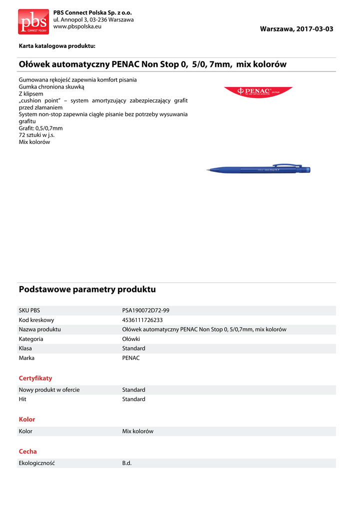 PBS Connect Polska Sp. z o.o. ul. Annopol 3, 03-236 Warszawa www.pbspolska.eu Warszawa, 2017-03-03 Karta katalogowa produktu: Ołówek automatyczny PENAC Non Stop 0, 5/0, 7mm, mix kolorów Gumowana rękojeść zapewnia komfort pisania Gumka chroniona skuwką Z klipsem „cushion point” – system amortyzujący zabezpieczający grafit przed złamaniem System non-stop zapewnia ciągłe pisanie bez potrzeby wysuwania grafitu Grafit: 0,5/0,7mm 72 sztuki w j.s. Mix kolorów Podstawowe parametry produktu SKU PBS PSA190072D72-99 Kod kreskowy 4536111726233 Nazwa produktu Ołówek automatyczny PENAC Non Stop 0, 5/0,7mm, mix kolorów Kategoria Ołówki Klasa Standard Marka PENAC Certyfikaty Nowy produkt w ofercie Standard Hit Standard Kolor Kolor Mix kolorów Cecha Ekologiczność B.d. PBS Connect Polska Sp. z o.o. ul. Annopol 3, 03-236 Warszawa www.pbspolska.eu Warszawa, 2017-03-03 Karta katalogowa produktu cd. Ołówek automatyczny PENAC Non Stop 0, 5/0, 7mm, mix kolorów Podstawowe parametry produktu Produkt Ołówek Typ Automatyczny Rodzaj Uniwersalny W ofercie od 2014-11 Wymiary Końcówka (mm) 0,5/0,7 Rozmiar 0,5/0,7mm Wspólny słownik zamówień CPV 30192131-8 Ołówki automatyczne Zamiennik Zamiennik JSA190072D72-99 Jednostki logistyczne Opakowanie 1 6 szt Opakowanie 2 180 szt