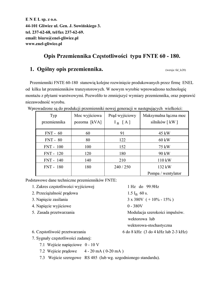 E N E L sp. z o.o. 44-101 Gliwice ul. Gen. J. Sowińskiego 3. tel. 237-62-68, tel/fax 237-62-69. email: [email protected] www.enel-gliwice.pl Opis Przemiennika Częstotliwości typu FNTE 60 - 180. 1. Ogólny opis przemiennika. (wersja: fal_lc20) Przemienniki FNTE 60-180 stanowią kolejne rozwinięcie produkowanych przez firmę ENEL od kilku lat przemienników tranzystorowych. W nowym wyrobie wprowadzono technologię montażu z płytami warstwowymi. Pozwoliło to zmniejszyć wymiary przemiennika, oraz poprawić niezawodność wyrobu. Wprowadzone są do produkcji przemienniki nowej generacji w następujących wielkości: Typ przemiennika Moc wyjściowa pozorna [kVA] Prąd wyjściowy In [A] Maksymalna łączna moc silników [ kW ] FNT - 60 60 91 45 kW FNT - 80 80 122 60 kW FNT - 100 100 152 75 kW FNT - 120 120 180 90 kW FNT - 140 140 210 110 kW FNT - 180 180 240 / 250 132 kW Pompa / wentylator Podstawowe dane techniczne przemienników FNTE: 1. Zakres częstotliwości wyjściowej 2. Przeciążalność prądowa 3. Napięcie zasilania 4. Napięcie wyjściowe 5. Zasada przetwarzania 1 Hz do 99.9Hz 1.5 In 60 s. 3 x 380V ( + 10% - 15% ) 0 - 380V Modulacja szerokości impulsów. wektorowa lub wektorowa-stochastyczna 6 do 8 kHz (3 do 4 kHz lub 2-3 kHz) 6. Częstotliwość przetwarzania 7. Sygnały częstotliwości zadanej: 7.1 Wejście napięciowe 0 - 10 V 7.2 Wejście prądowe 4 - 20 mA ( 0-20 mA ) 7.3 Wejście szeregowe RS 485 (lub wg. uzgodnionego standardu). 8. Zabezpieczenia wewnętrzne: 8.1 Przed zanikiem lub obniżeniem napięcia zasilania i asymetrią. 8.2 Przed nadmiernym wzrostem napięcia zasilania. 8.3 Przed zwarciem na zaciskach wyjściowych przemiennika. 8.4 Przed zwarciem doziemnym. 8.5 Przed zanikiem lub osłabieniem systemu wentylacji przemiennika. 8.6 Przed przeciążeniem silnika. 9. Sygnalizacja stanów pracy i awarii. 9.1 Sygnalizacja zasilania przemiennika. 9.2 Sygnalizacja gotowości do pracy (styk zwierny) 9.3 Sygnalizacja poprawnej pracy przemiennika ( styk zwierny ) 9.4 Sygnalizacja wyłączenia awaryjnego ( styk zwierny + informacja o przyczynie wyłączenia ). 9.5 Wyprowadzony sygnał prądowy proporcjonalny do częstotliwości wyjściowej przemiennika zaciski 11-3 listwy X2 (0 mA = 0 Hz 20 mA=Fmax) lub ( 4 - 20 mA ). 2. Podłączenie oraz sterowanie przemiennika. Sposób podłączenia obwodów głównych i sterujących do przemiennika pokazują rysunki FNTE 60-180/1 i 2. Podłączenie zasilania i wyjścia wykonać przewodami giętkimi gdyż do takich przewodów dostosowane są zaciski wejściowe i wyjściowe. 2.1 Układ załączania przemiennika. Przemiennik FNTE można sterować dwoma sposobami. 1. W układzie połączeń jak na rysunku FNTE 60-180 / 1 załączenie odłącznika Q1 powoduje zasilenie obwodów sterowania przemiennika ( zaciski 1L1-1L2 ). Włączona zostaje do pracy przetwornica zasilacza i uruchomiony system sterowania mikroprocesorowego. Zwarty zostaje styk gotowość. Do obwodu głównego przemiennika nie jest podane napięcie. Załączenie przemiennika do pracy następuje po podaniu napięcia na przekaźnik K2 znajdujący się na płycie zasilacza i obwodów wejściowych. Załączenie przekaźnika K2 powoduje załączenie stycznika głównego SG ( rys. FNTE 60-180 /1 ) i stycznika zwieracza K10. W przypadku braku innych podłączeń ( omówionych w dalszym ciągu opisu ) załączenie przekaźnika K2 powoduje że przemiennik znajduje się w stanie zatrzymania. Załączenie przekaźnika K2 następuje gdy: - zwarty zostanie zacisk 18 i 20 na listwie X2. w tym przypadku załączenie i wyłączenie przemiennika odbywa się jednym stykiem zewnętrznym. - zastosowane zostaną dwa przyciski zwierny ZAŁ i rozwierny WYŁ zgodnie ze schematem na rysunku FNTE 60-180 / 2. Zestyk podtrzymujący włączony jest pomiędzy zaciski 19 i 20 listwy X2. 2 UWAGA Zaciski 1 do 20 listwy X2 w znacznej części przyłączone są do potencjału 0V i 12V zasilacza wewnętrznego przemiennika, dlatego niedozwolone jest przyłączanie styków sterujących podłączonych do potencjałów zewnętrznych. Załączanie poprzez zwieranie zacisków 18 i 20 zaleca się w tym przypadku gdy przemiennik powinien się załączać samoczynnie po chwilowym zaniku napięcia zasilania. 2. Przemiennik można załączać również poprzez bezpośrednie podanie napięcia zasilania na zaciski wejściowe przemiennika ( L1,L2,L3,N). W tym przypadku załączanie stycznika podającego napięcie odbywa się poza przemiennikiem i wiele z opcji wykorzystywanych przy sterowaniu zgodnie z rys. FNTE 60-180 / 1 nie może być wykorzystanych. W tym przypadku można zewrzeć zaciski 18-20 i start przemiennika następuje automatycznie po podaniu napięcia na przemiennik, lub też przekaźnikiem K2 sterować dodatkowo załączaniem i wyłączaniem przemiennika. UWAGA: Należy połączyć zaciski L1 z 1L1 i L2 z 1L2 w celu podania napięcia na układ sterowania 2.2 Blokada technologiczna Uruchomienie przemiennika wymaga zwarcia zacisków 15 i 16. Jest to wejście pozwalające na zatrzymanie przemiennika ( nie wyłączenie ) po rozwarciu tych zacisków. Zatrzymanie to nie jest traktowane jako wyłączenie awaryjne. Po ponownym zwarciu zacisków 15 i 16 następuje uruchomienie przemiennika. 2.3 Układu hamowania elektrycznego. Układ hamowania elektrycznego jest w tej wersji przemiennika integralnie związany z pozostałymi podzespołami przemiennika. Wewnętrzny układ hamowania jest przystosowany do hamowania z mocą chwilową traconą na rezystorze zewnętrznym do 15 kW. Można zatem podłączyć rezystor zewnętrzny o wartości minimalnej 30 Ω. Zapewnia to poprawne hamowanie elektryczne wszystkich typowych napędów jak wentylator, dźwignica i inne. W przypadkach skrajnych ( np. napęd samotoków hutniczych ) gdzie wymagane są bardzo małe czasy hamowania i moc chwilowa oddawana do rezystora musi być większa od 15 kW konieczne jest stosowanie zewnętrznego układu hamowania elektrycznego. 2.4 Wybór kierunku 