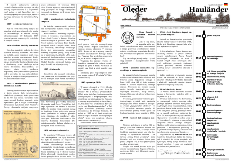 Z innych zabawnych zaleceń: „sznurki sznurki do dzwonków wymaga się, aby zostały stały wyprowadzone z 3 wspomniawspomni nych pokoi, z sali ławników jak i z ostatniego pokoju na pierwszym piętrze i z pokoju narożnego na parterze na kor korytarz”. Olęder 1900 – budowa siedziby Starostwa Dwa lata wcześniej podjęto decyzję o budowie siedziby starostwa. Nie udało się ustalić, gdzie wcześniej miał swoją siedzibę ę starosta nowotomyski. Bud Budynek zaprojektowany został przez berli berlińskiego architekta Gusta Gustava a Knoblaucha, a zbudowany przez lokalnego wyk wykonawcę Hermanna Hasenfelder Hasenfeldera. Do budowy użyto cegły piaskowo piaskowowapiennej, którą Hasenfelder produk produkował w specjalnie do tego celu założonej fabryce w miejscu dzisiejszego cment cmentarza żołnierzy radzieckich. 1903 – uruchomienie gazowni i oświetlenia miasta Bez wątpienia ważnym wydarzeniem w życiu miasta było uruchomienie oświetlenia wietlenia gazowego, które przetrwało do lat 60. XX wieku. Ówcześni radni zaakceptowali budowę gazowni, która wytwarzała gaz z węgla kamiennego. Wykonawcą była firma „Carl Franke” z Bremy. Gazownia miejska rozpoczęła Budynek starostwa Gustav Knoblauch (1833 (1833-1916) Na ścieżkę nowoczesności pchnęła nas niewątpliwie budowa wieży wodociągowej i szpitala. Wieżę ciśnień i wodociągi zaproje zaprojekktowała i wykonała wspomniana już firma „Carl Franke” z Bremy. UruchoUruch mienie nastąpiło w grudniu 1913 roku. Przed budową burmistrz Paul Franke zasięgną opinii z innych miast, które zasięgnął już wcześniej zbudował zbudowały y wodociągi. Warty jest est zacytowania s szczególnie zczególnie zabawny fragment gazety, który nalazł się w archiwalnych aktach aktach: „Nie Nie radzę małym lub średnim gminom, na począ początku uruchomienia zakładu, od razu z zakładać liczniki, ponieważ ludzie, gdy mają liczniki, nie używają wody. wody.” 1919 – 3 stycznia Szczęśliwie dla naszych mieszka mieszkańńców, powstanie wielkopolskie nie prz przyniosło żadnych ofiar wśród nowotom nowotomyGazownia 1903 Ze zbiorów Wojciecha Szkudlarskiego. ślan. Powstańcy pod wodzą Edmunda Klemczaka zajęli Nowy Tomyśl bez je jeddnego wystrzału na ranem 3 stycznia 1919. Nie można tutaj pominąć zasług hr. Łąckie Łąckiego, go, który politycznie przyg przygotował powstanie w naszym powiecie m.in. skłaniając do współpracy adi adiuutanta por. Waleriana Andersona z Obbwodowej Komend Komendy Uzupełnień (Be(B zirkskommando) zirkskommando),, Polaka służącego w szeregach armii niemieckiej. niemieckiej 1939 – okupacja niemiecka Źródło: Muzeum Architektury Uniwersytetu Technicznego w Berlinie - Nr Inw. GK423,014 EGZEMPLARZ BEZPŁATNY Hauländer 1913 – uruchomienie wodociągów i szpitala 1887 – powiat nowotomyski Już od 1848 roku Nowy Tomyśl był siedzibą władz powiatowych, ale powi powiatu bukowskiego. W skutek reformy administracyjnej 30 listopada 1887 powstał powiat nowotomyski z siedzibą w naszym mieście. GUDRUN TABBERT PRZEMEK MIERZEJEWSKI pracę dokładnie 15 września 1903 roku. P Proces roces wymiany oświetleniowych lamp gazowych na lampy elektryczne rozpoczął się dopiero po II wojnie świ świaatowej, w 1955 roku. We e wrześniu 1939 nasze tereny, jak cała Wielkopolska, nie były bronione. Nie było to możliwe ze względu na ukształtowanie zachodnich granic. Polska administracja internowała mieszkańców niemieckiego pochodzenia i wywiozła w kierunku Warszawy. Marsz zakończył się w okolicy Kutna. Wielu obywateli niemieckiego pochodzenia przypłaciło to życiem, m.in m.in. 7474 4 www.oledry.pl www.hauland.de NR 4 WYDANO Z OKAZJ OKAZJII SPACERU HISTORYCZN HISTORYCZNEGO EGO Nowy Tomyśl – kamienie milowe rozwoju. letni pastor kościoła ewangelickiego Georg Reisel. R Wojska niemieckie do naszego miasta wkroczyły 7 września 1939. Rozpoczął się tragiczny czas dla polskich mieszkańców Nowego Tom Tomyśla. Pierwsza fala wysiedleń rozpoczęła się już w końcu listopada 1939. Tragiczny los spotkał również żżydowskich mieszkań mieszkańców ców miasta wywiewywi zionych do getta w Łodzi. Nie udało się ustalić, czy ktoś z nich przeżył czas wojny. Dzisiejszy plac Niepodległości prz przybrał miano „placu 7 Września” („7 Se September Platz”). 1945 – powstaje Chifa W czasie okupacji w 1941 fabryka „Żar” została została przejęta przez firmę H. Windler AG z Berlina (Friedriechstr. 133a), która któr była fabryką instrumentów chirurgicznych i ortopedycznych oraz oświetlenia sal chirurgicznych. Posiad Posiadała między innymi udziały w innej fabr fabryce „Windlers Ver. Werkstätten für Ch Chirurgie urgie und Krankenhausbedarf Krankenhausbedarf” z Tullingen. Częściowo produkcja została przeniesiona do Nowego Tomyśla. Po wojnie w 1945 na tej bazie mogła pop wstać Fabryka Narzędzi Chirurgicznych „Chifa”, która bez wątpienia tchnęła nasze miasto na nowe tory. Jak to się stało, że ambicja wielu p pokoleń, mieszkańców wielu narodowości i religii pozwoliła przekształcić nasze miasto z wiejskiego targowiska do mie miejsca, w którym dziś przyszło nam mies mieszkać? Czy to zasługa jednej osoby osoby,, czy też ciąg zdarzeń i zaangażowanie wielu pokoleń? 1692 – początek osadnictwa ol olęderskiego w naszym regionie Za początek historii naszego miasta należy uznać niewątpliwie założenie wsi Sękowo przez Bogusława Unruga 5 lipca 1692 roku. Od tej daty możemy mówić o historii olęderskiej naszego rejonu. Wcześniej na terenie naszej gminy istniały średniowieczne wsie: Wytomyśl, Bukowiec, Stary Tomyśl, Sątopy, Róża czy też młyny w Bobrówce i Mniszkach. Osadnicy Osadnicy,, przeważnie wyznania protestanckie testanckiego, wyrażali wyraża wolę założenia swojej parafii. Feliks Szołdrski dał zg zgodę swoim „„dysydenckim ydenckim olędrom olędrom” i w 